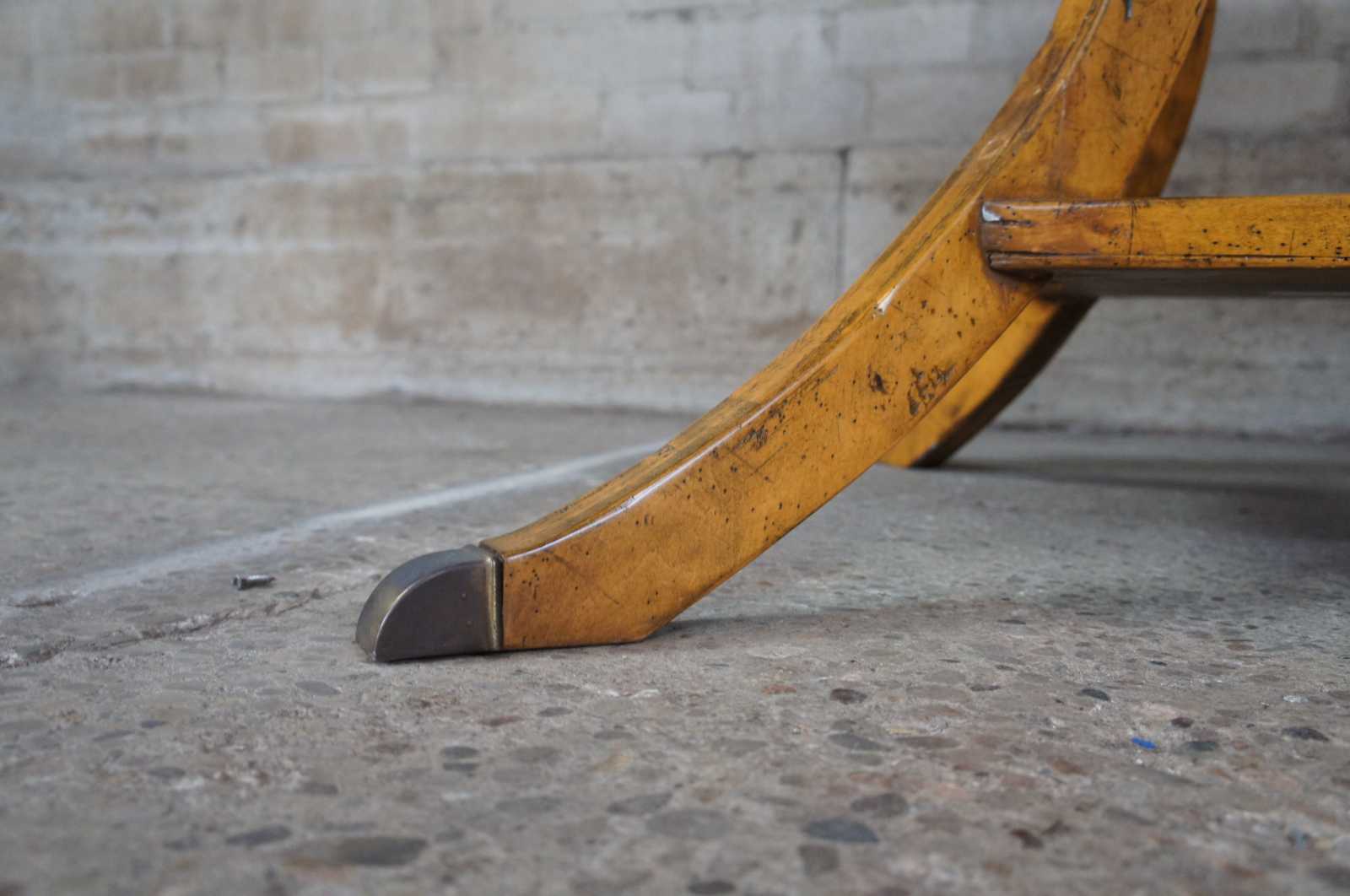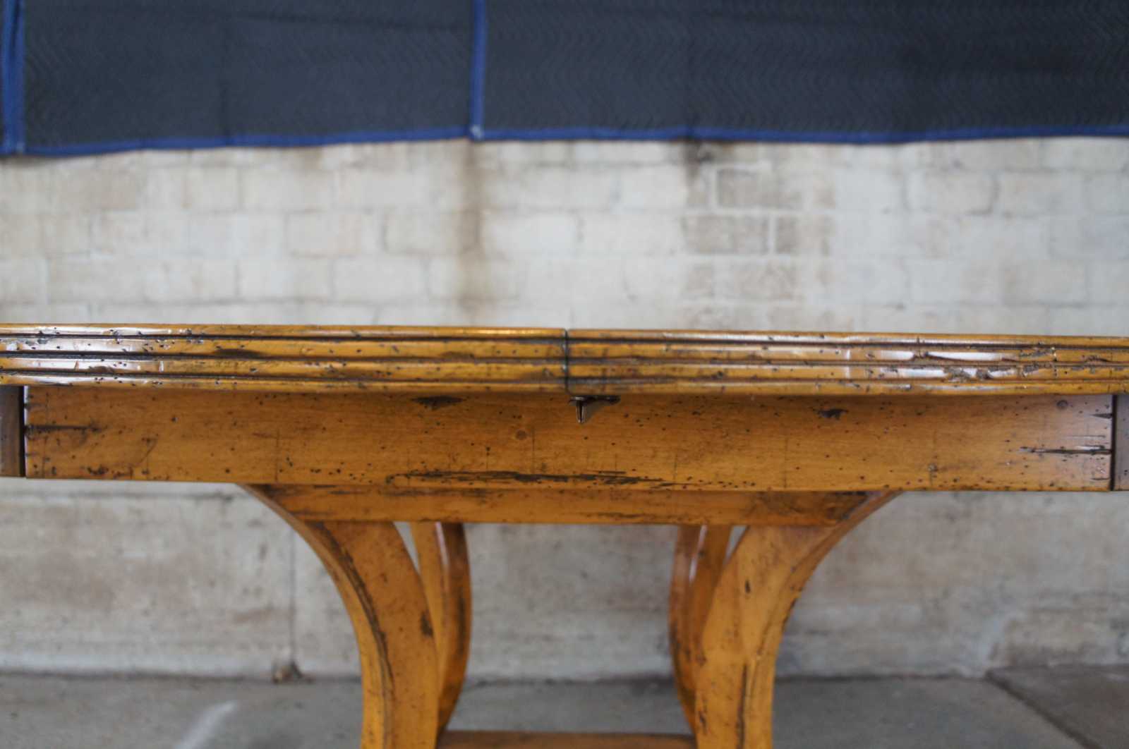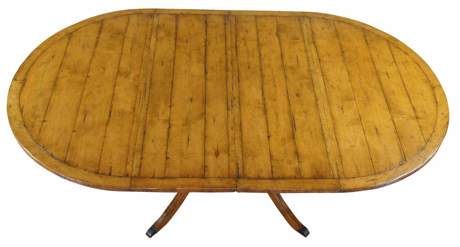 Guy Chaddock Dining Table. Distressed pine plank style top over long saber legs and brass capped feet. Circa 1999