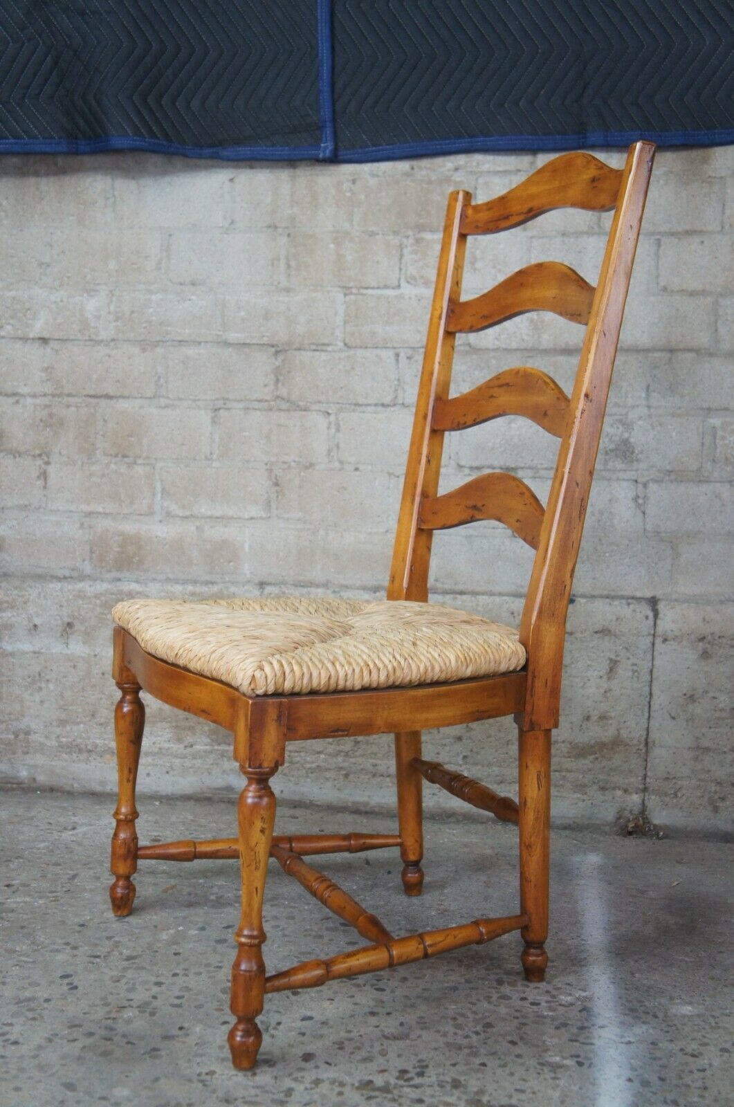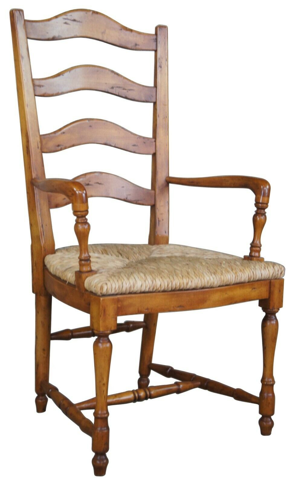 Guy Chaddock Ladderback Rush Seat Dining Arm & Side Chairs, 13301/0 UC3001. Features a distresssed hardwood frame with turned supports. Includes removable cushions.