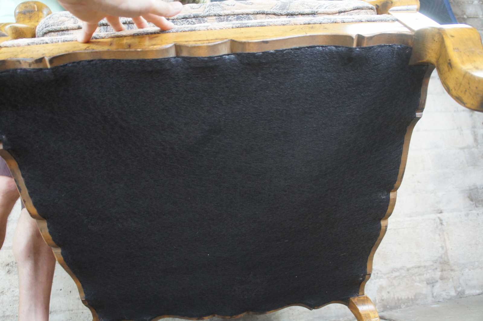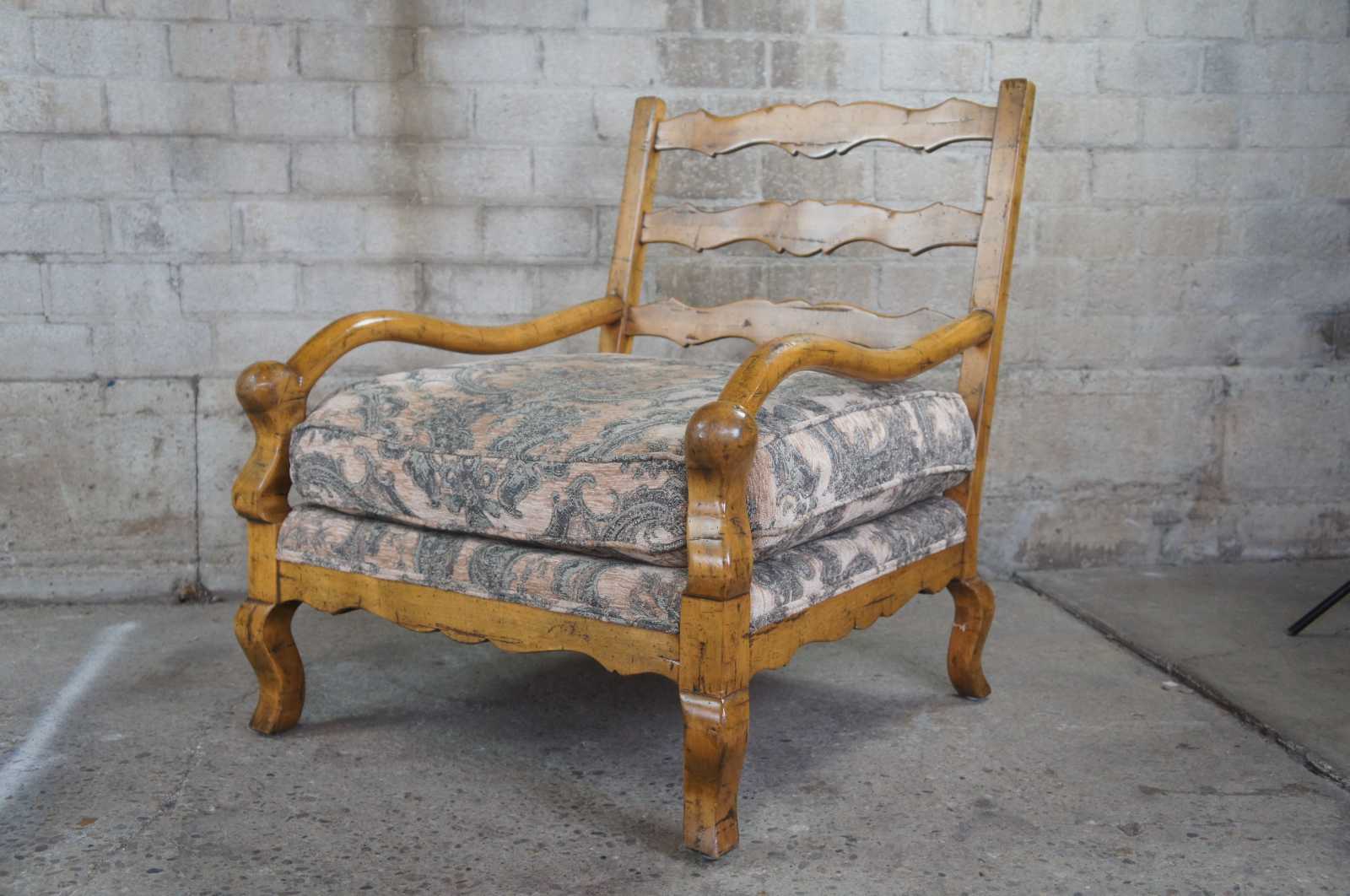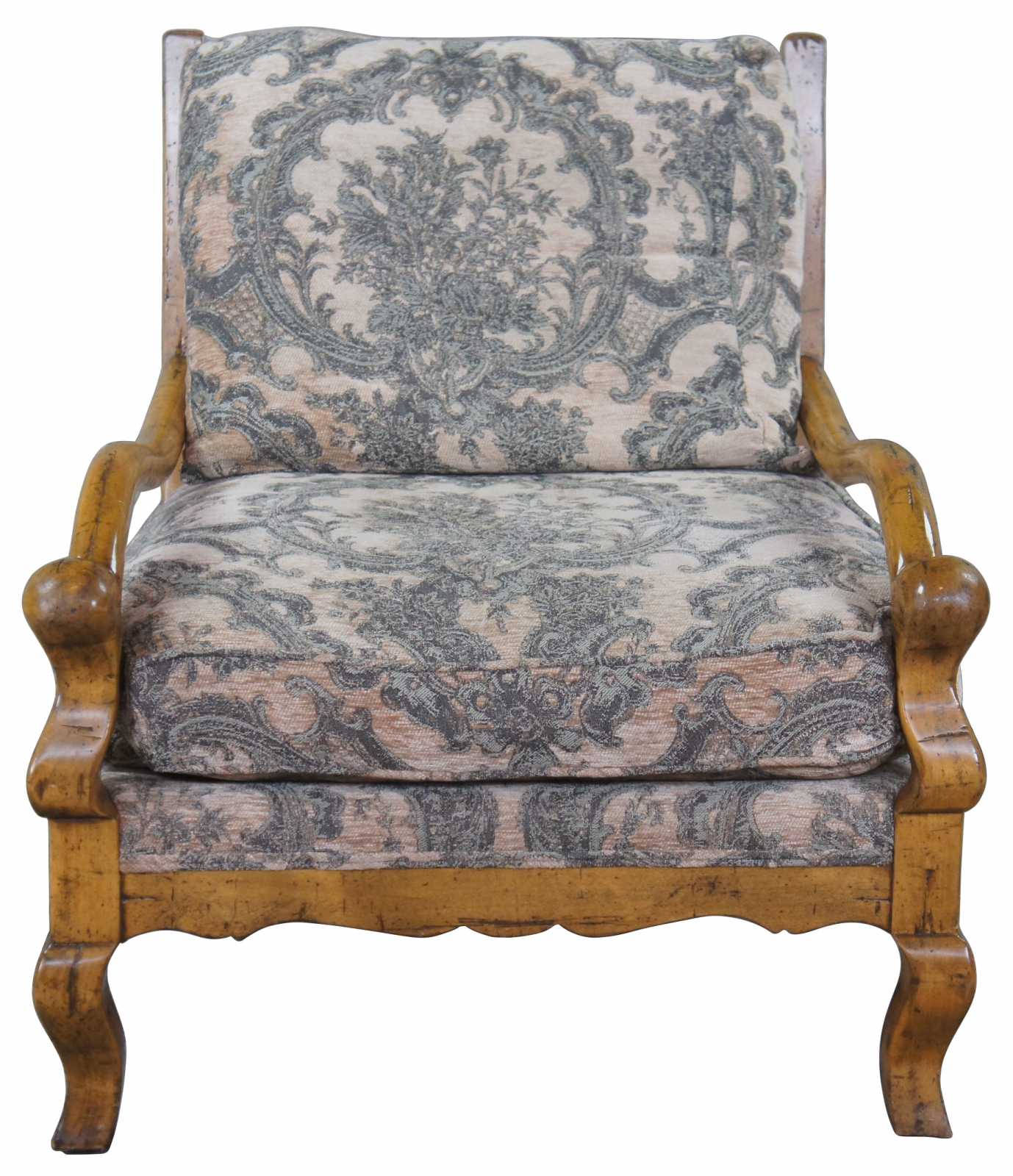 Guy Chaddock Upholstery Collection Knuckle Lound Chair, UC3001. Features a distresssed hardwood frame with smooth sloping arms, ladderback, serpentine apron and cabriole legs. Upholstered in a brocade style fabric with matching throw pillow.