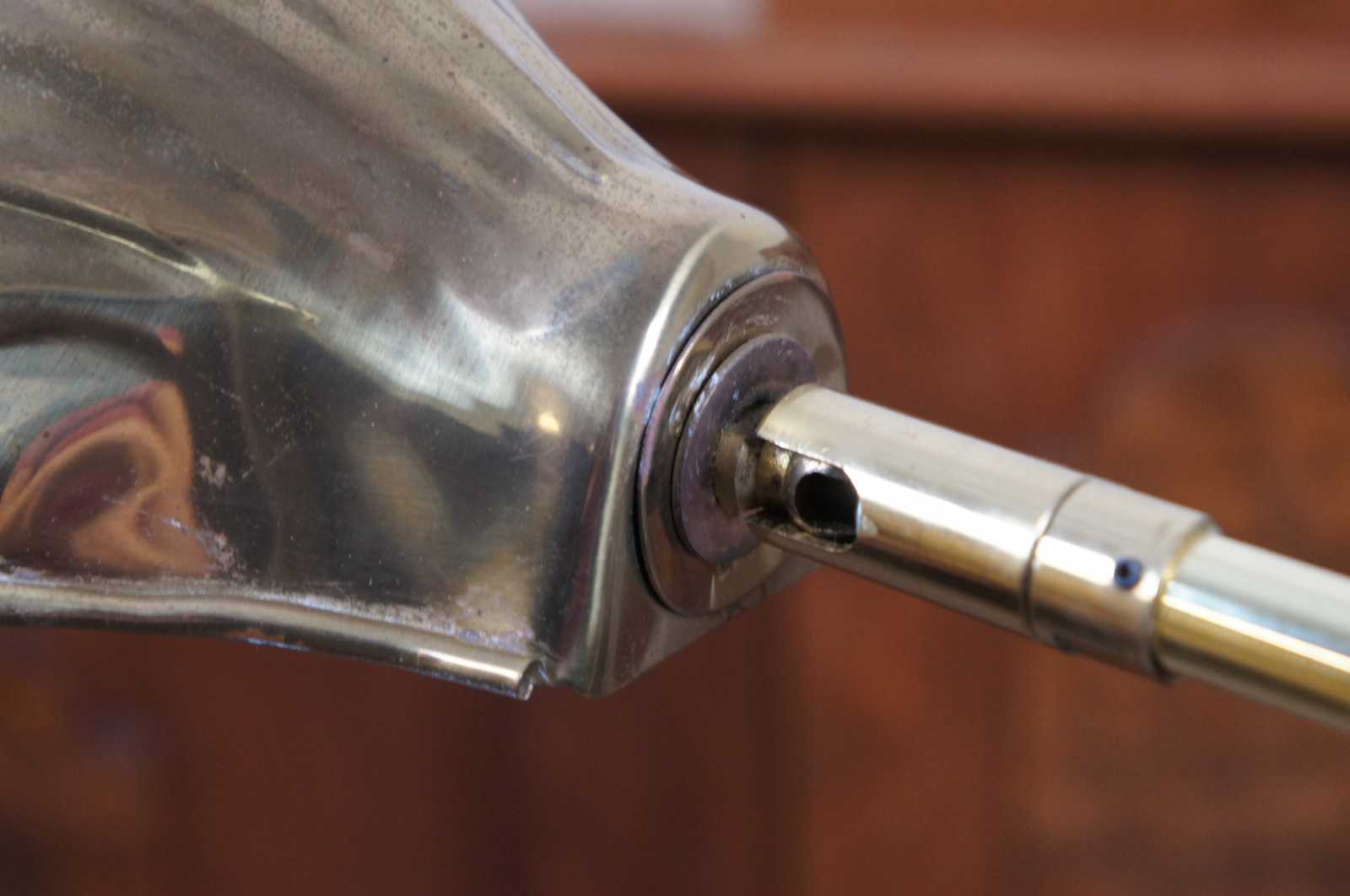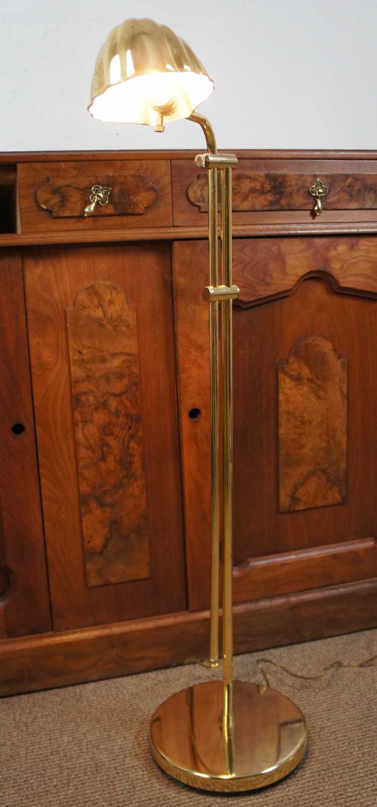 Mid century modern vintage brass floor lamp with adjustable height and clam shell shaped shade.
