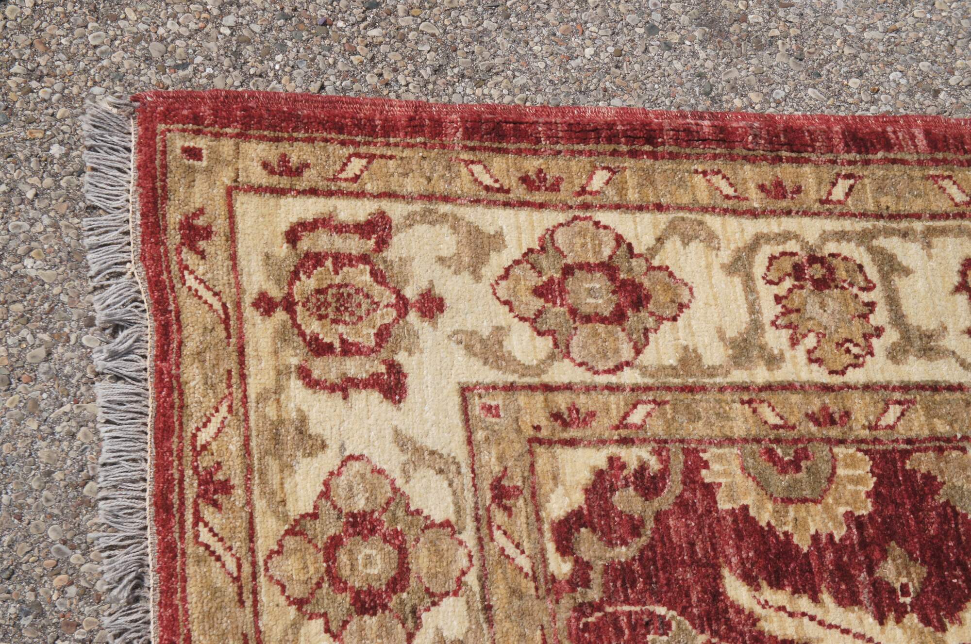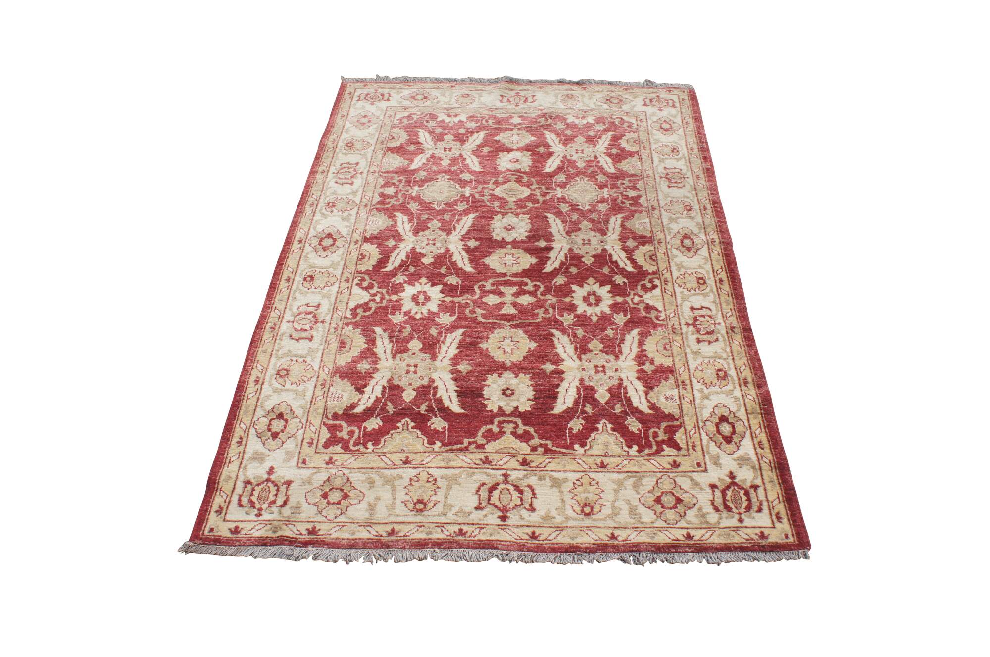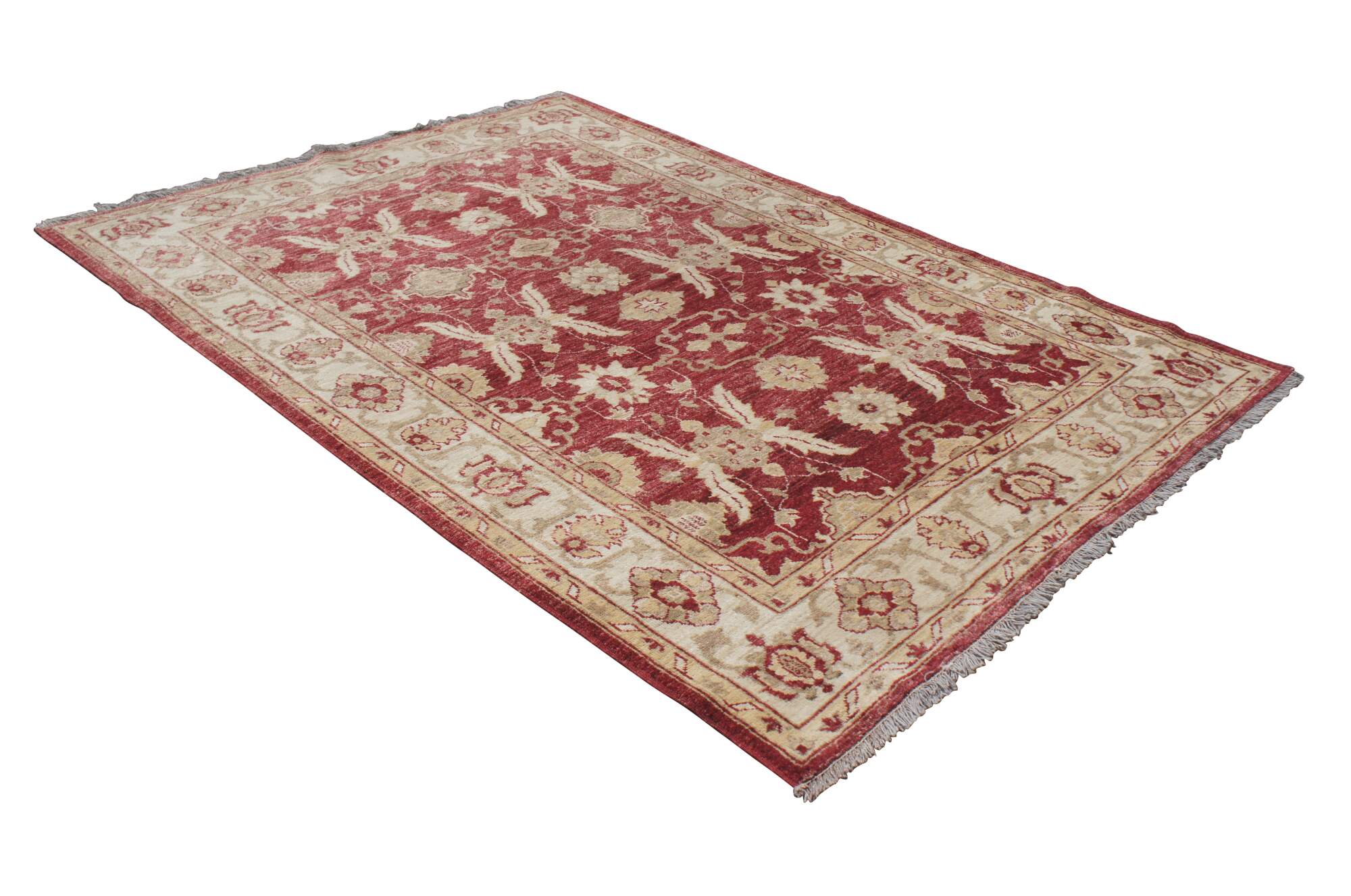 An exceptional floral area rug. Hand spun with natural dyes in Turkey. Beautifully designed with an eye catching geometric pattern. Features Reds and beiges