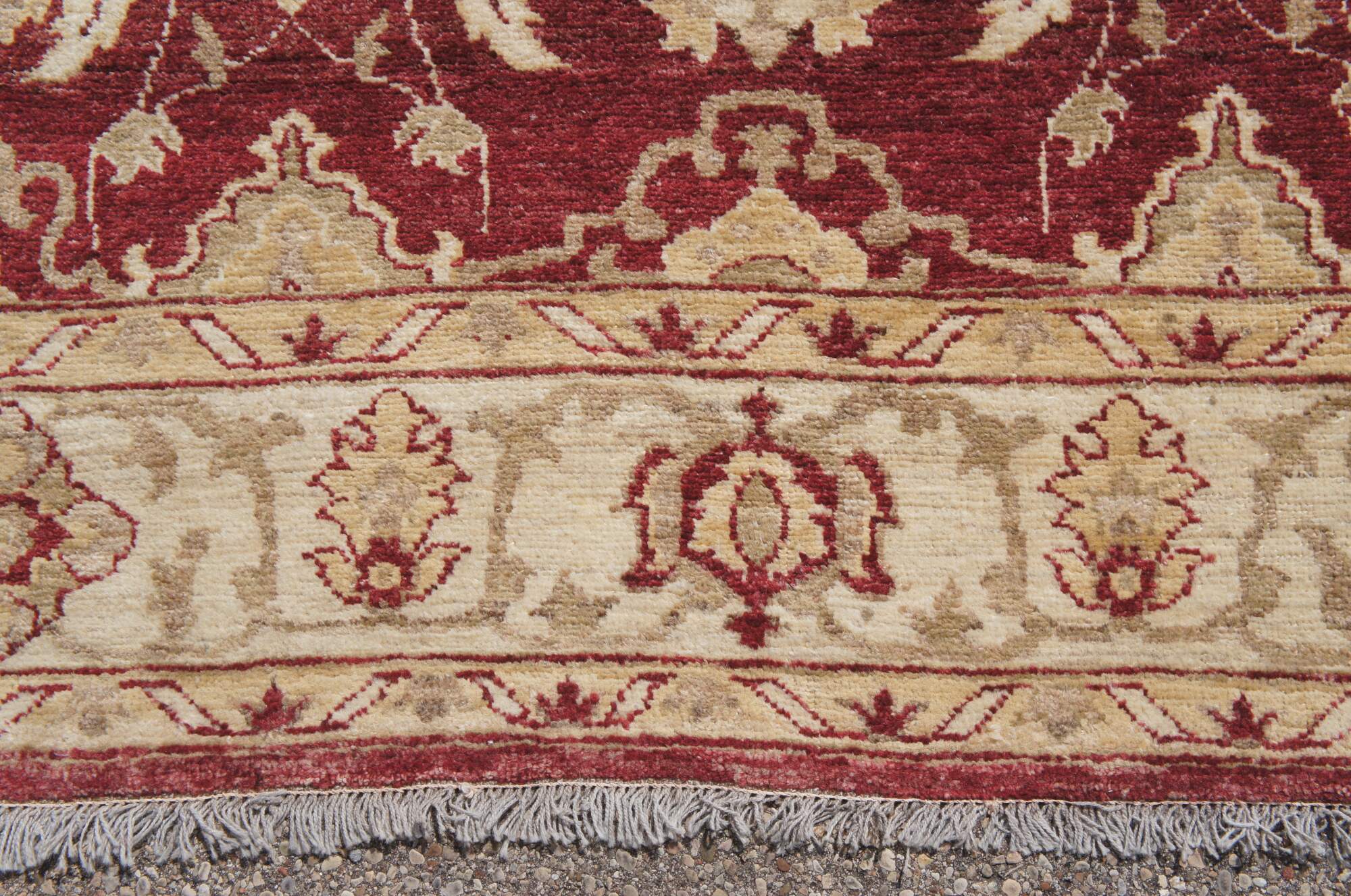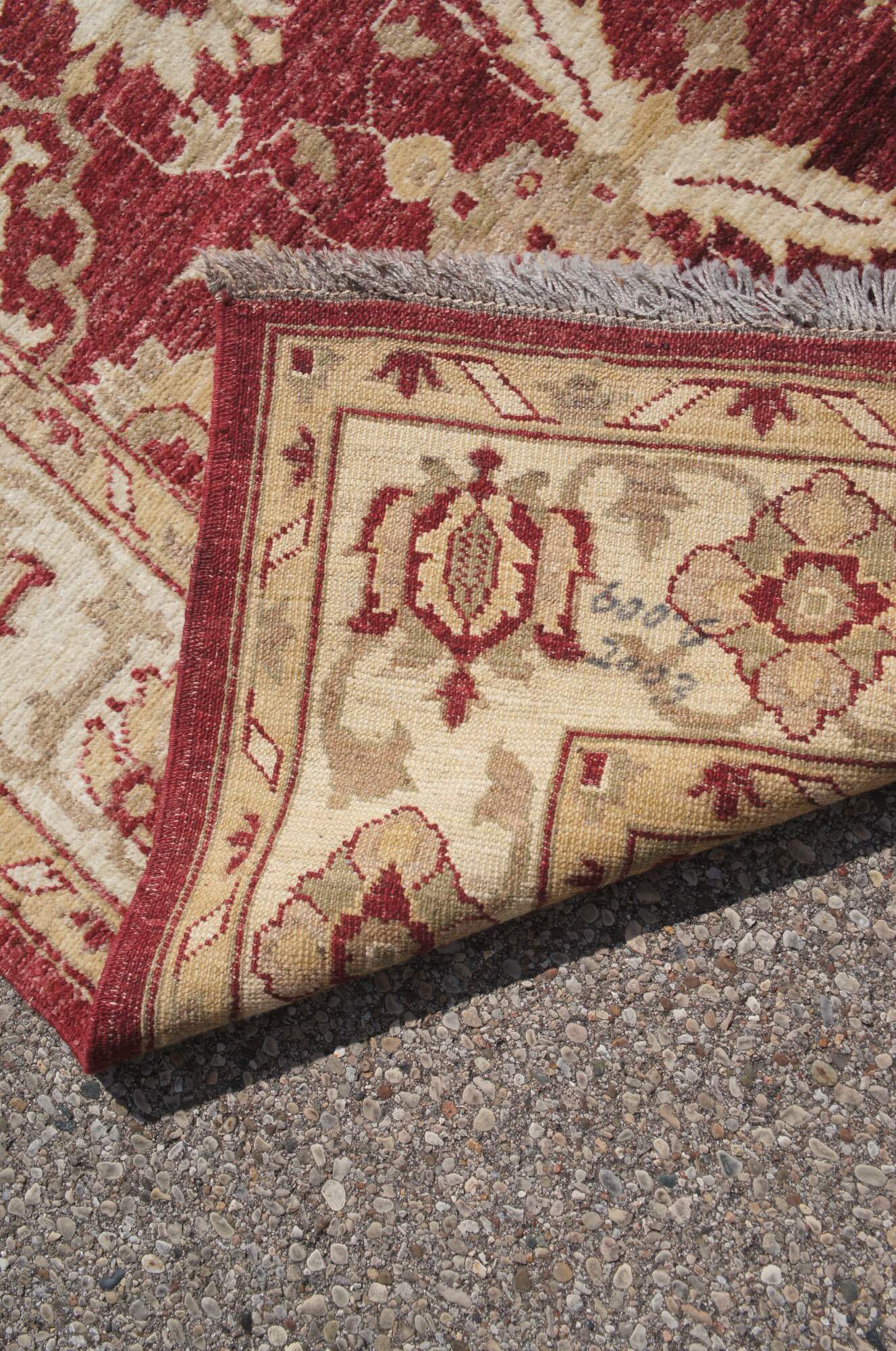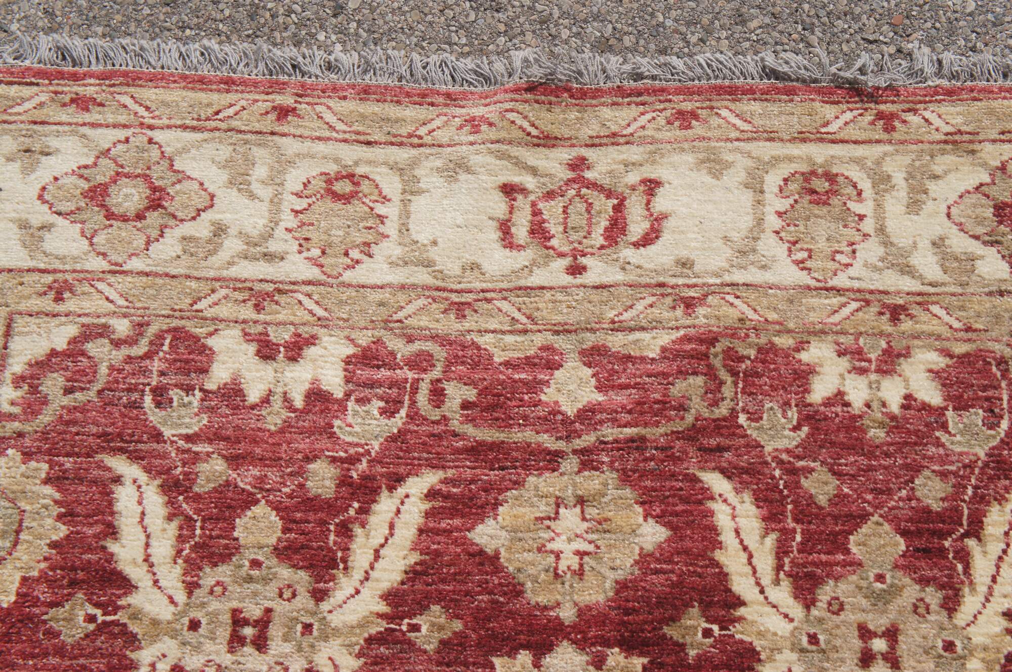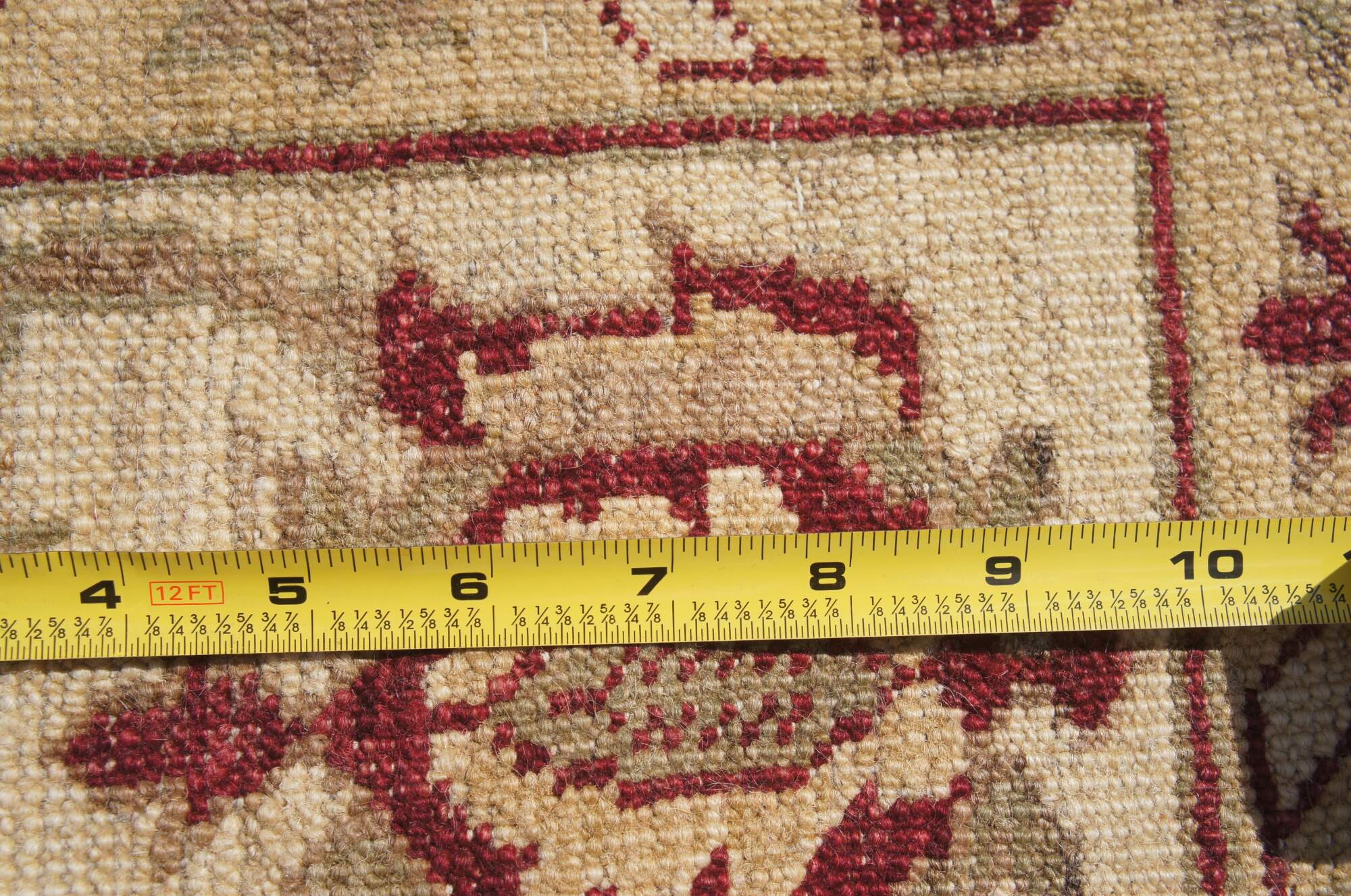 An exceptional floral area rug. Hand spun with natural dyes in Turkey. Beautifully designed with an eye catching geometric pattern. Features Reds and beiges