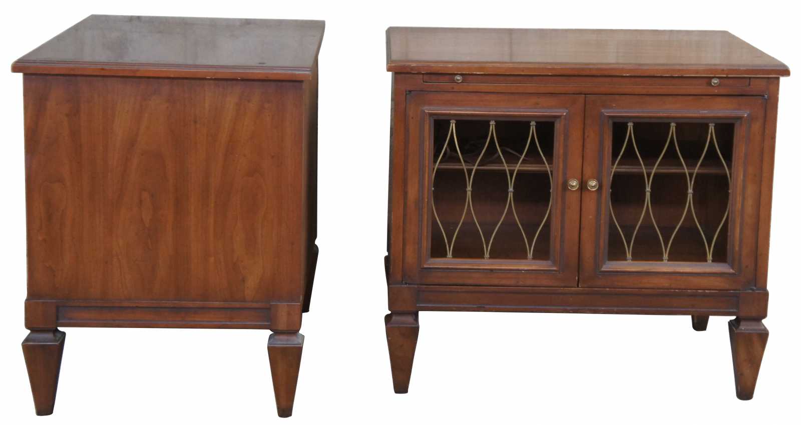 Circa 1960s Drexel Heritage Modavanti Mediterranean Collection Nightstand/ Side Tables, 14-172-30. Drawing inspiration from early Renaissance, Italian, classical and other European designs. A rectangular form made from fruitwood with brass grille doors and an upper pull out tray. Includes interior shelf, option for curtains and square tapered feet.