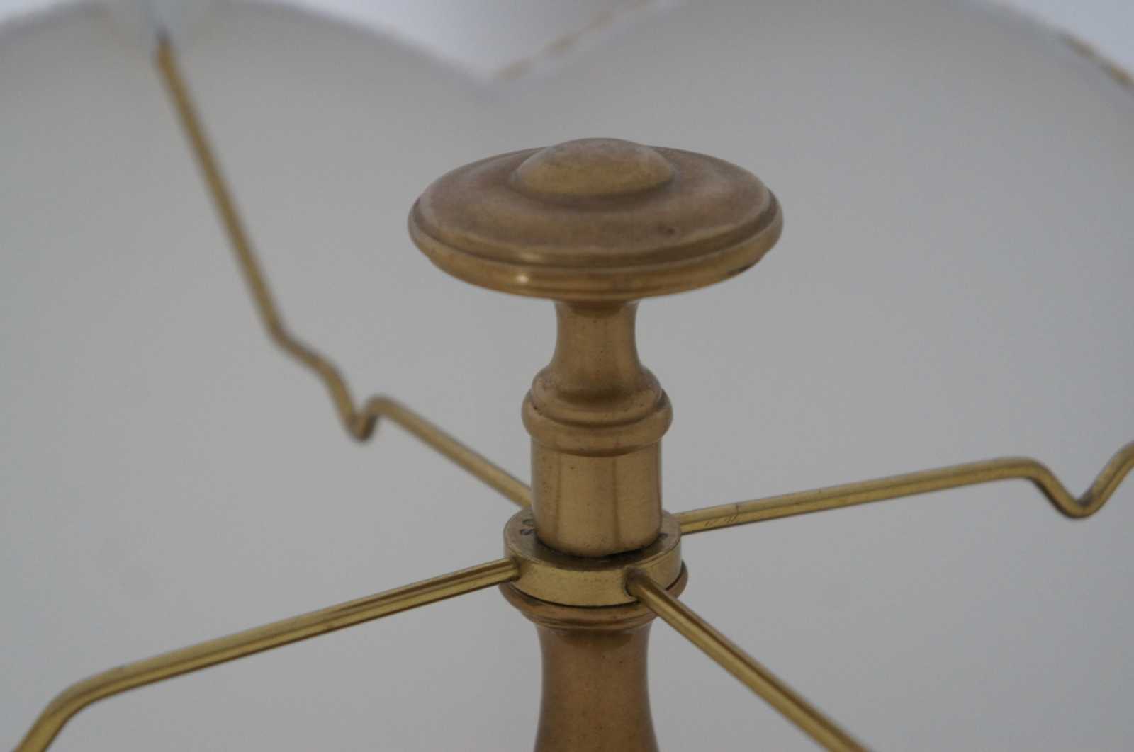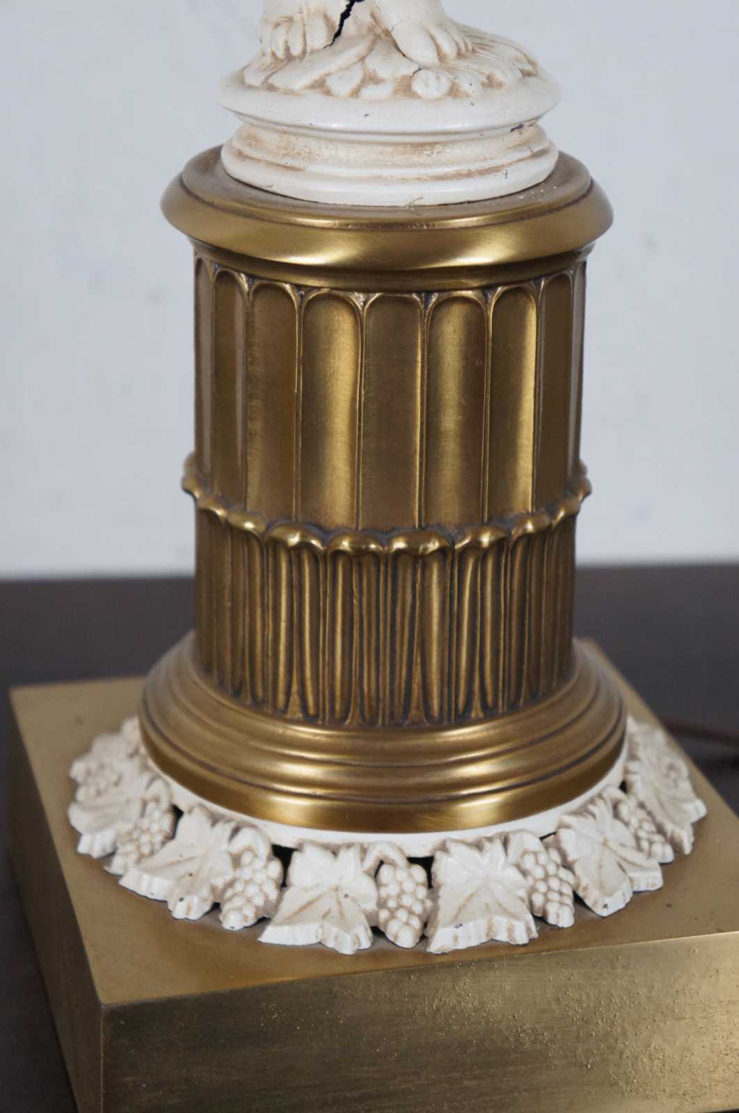 Brass and spelter four light candelabra shaped table lamp featuring a neoclassical cherub figure and ornate Diane Studios shade.