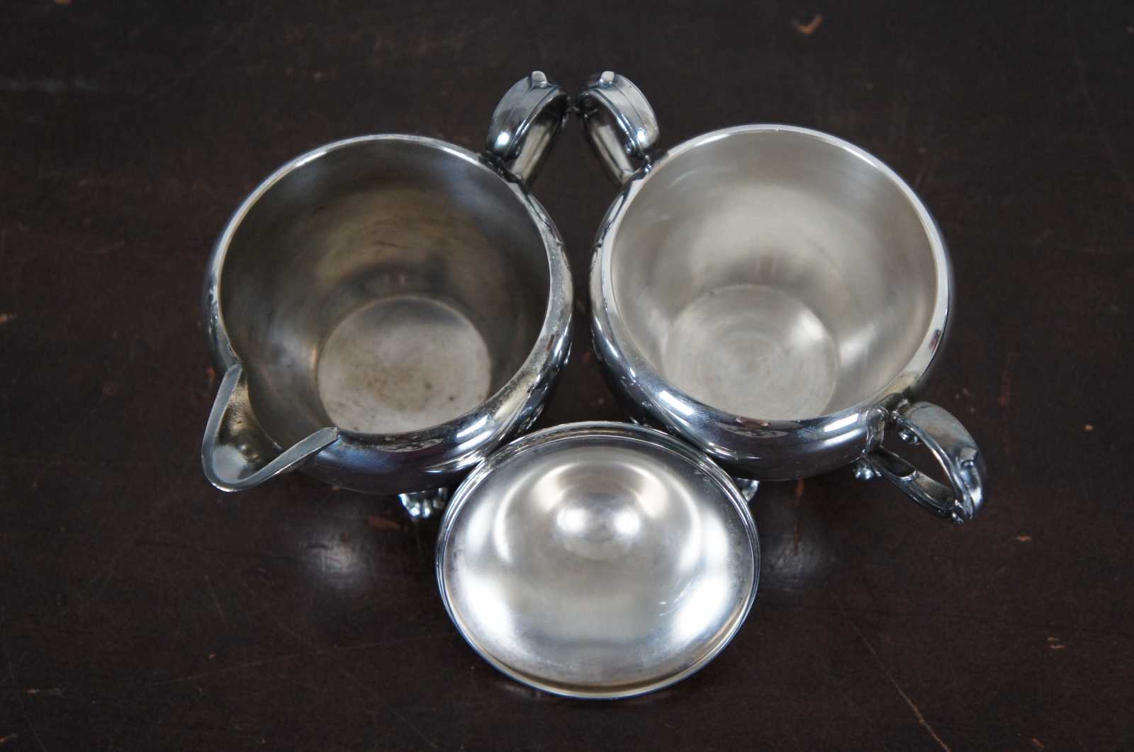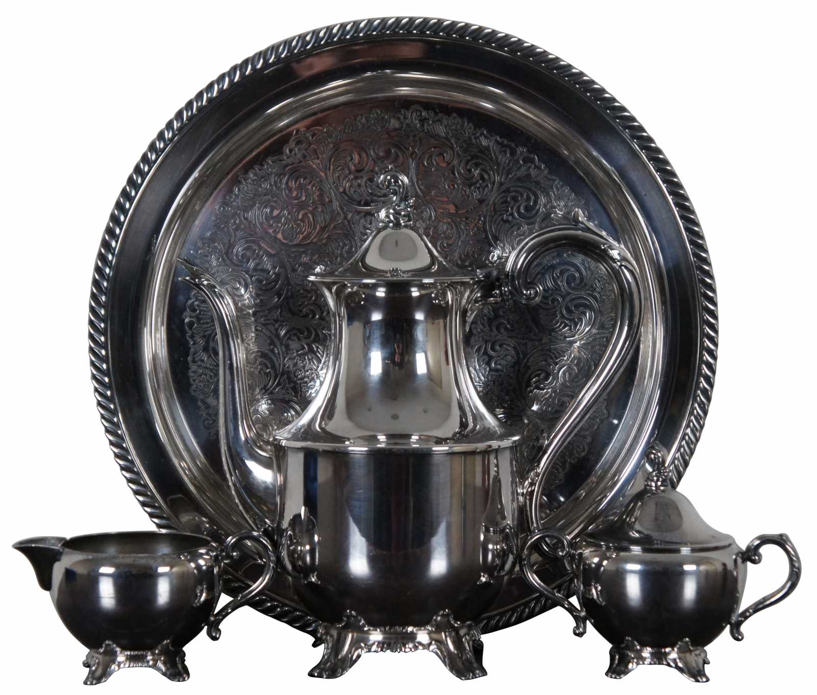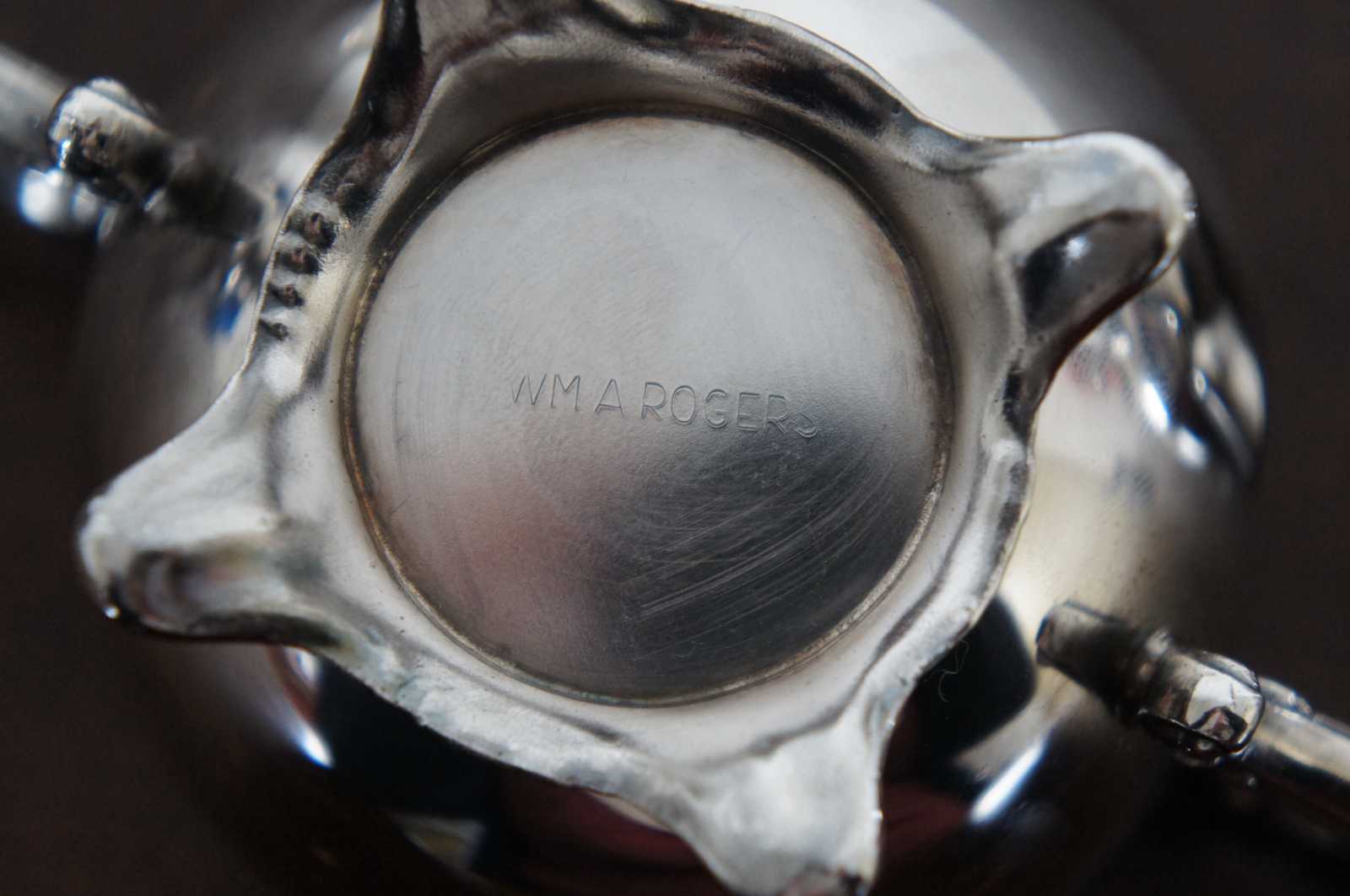 Vintage WMA Rogers silver plate tea set including a round tray, teapot, creamer and lidded sugar bowl.