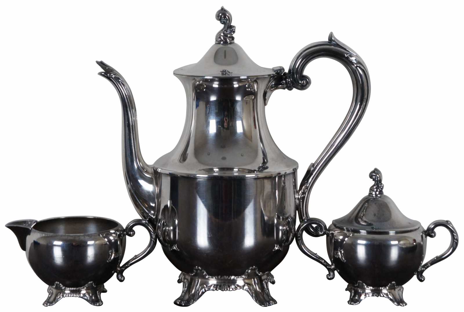 Tray - 12.25” x 0.75” / Teapot - 9” x 4.75” x 9.5” / Sugar Bowl & Lid - 5.25” x 3.25” x 4.375” / Creamer - 4.75” x 3.25” x 2.75” (Width x Depth x Height)