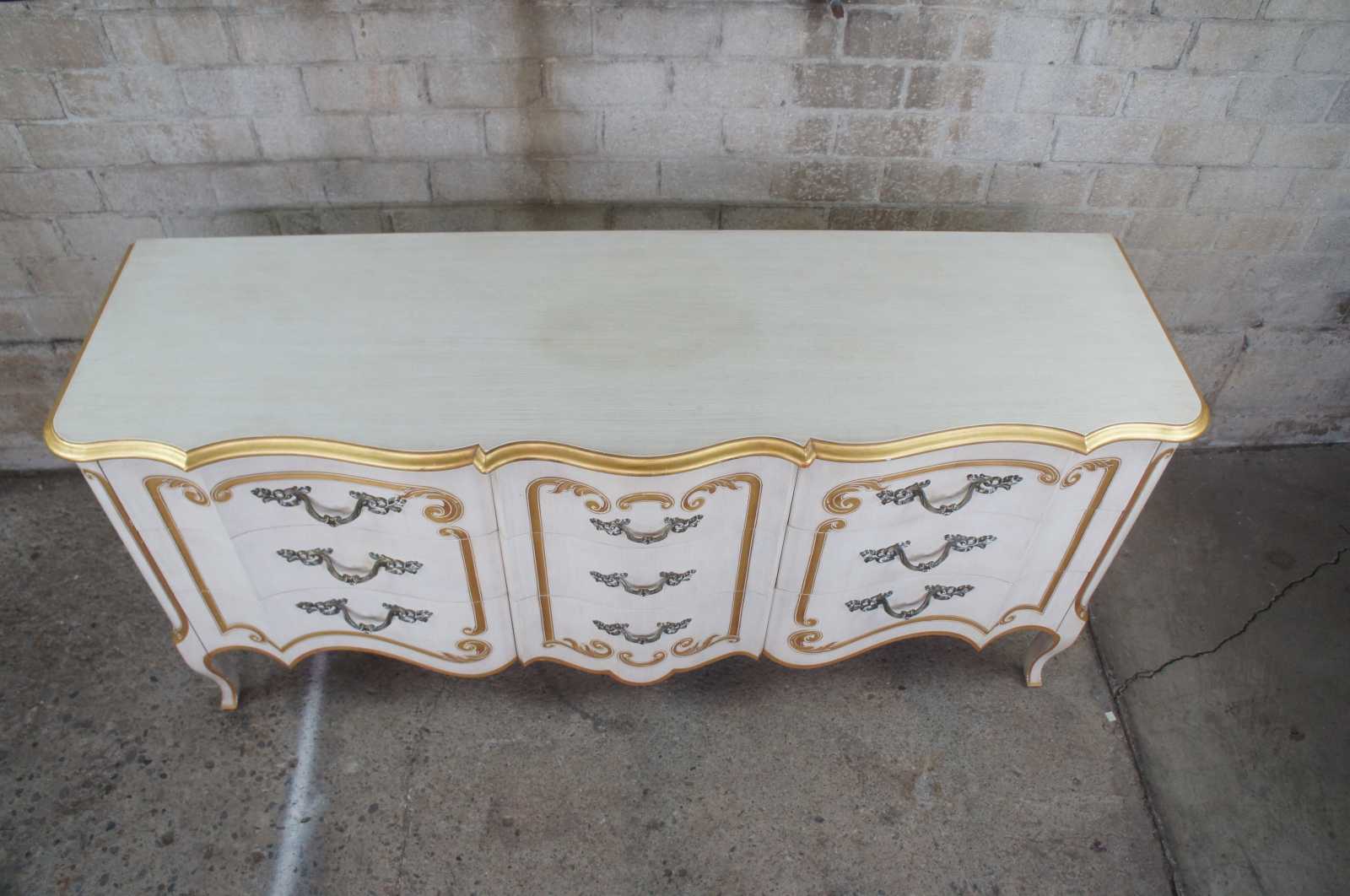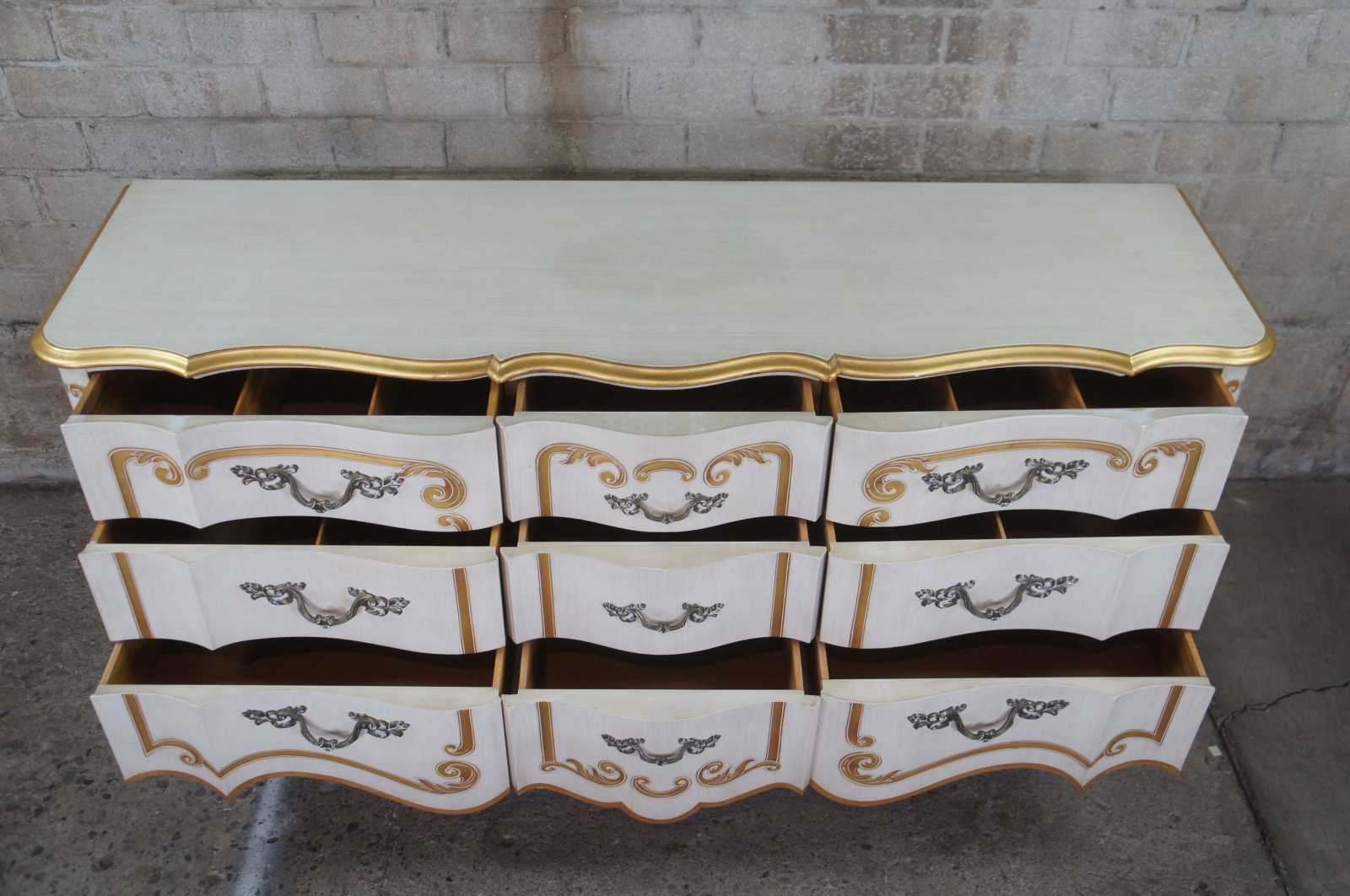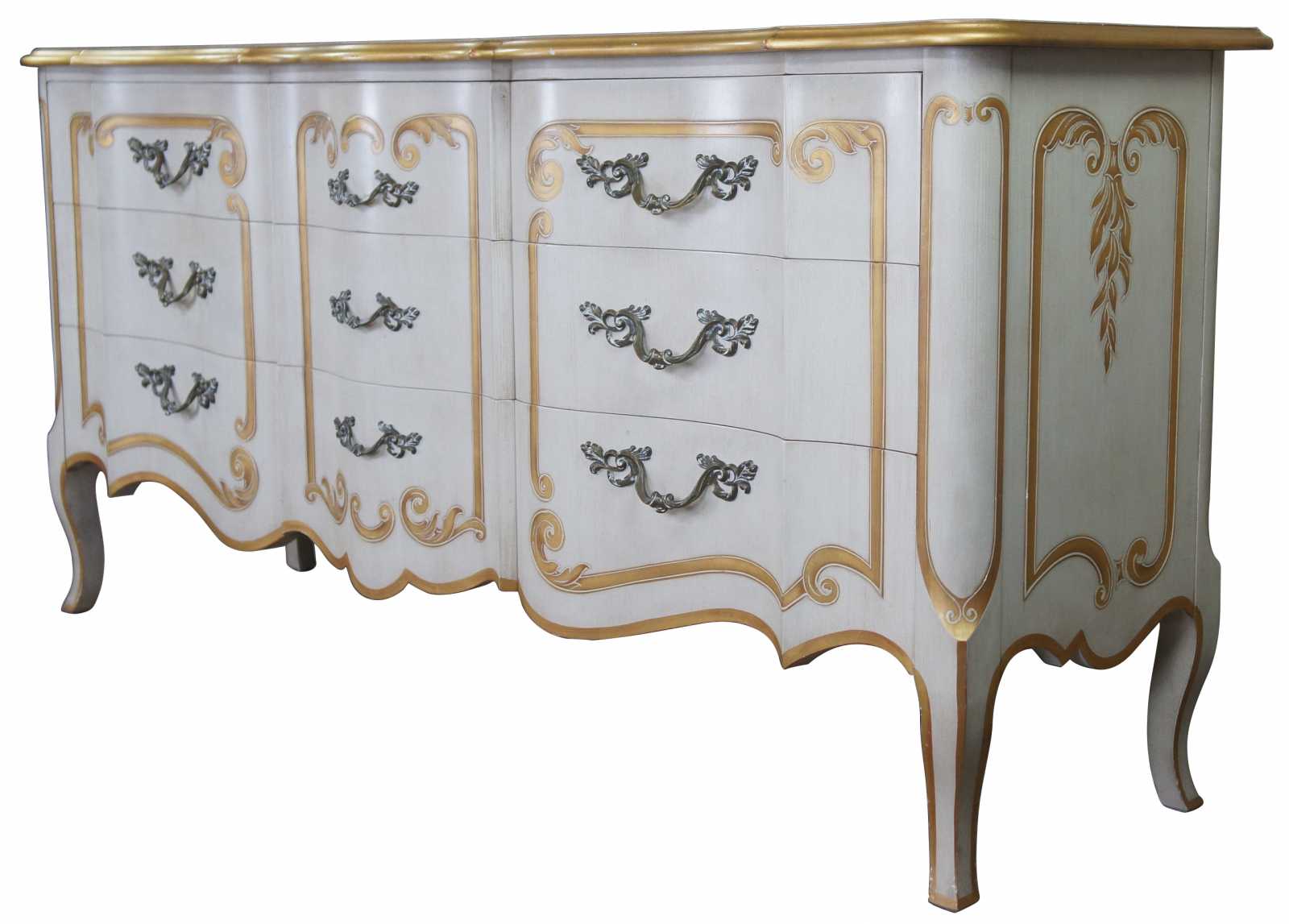 John Widdicomb dresser, circa 1960s. Drawing inspiration from Italian Florentine and Provincial. Features a rectangular form with serpentine front, 9 dovetail drawers with dividers and cabriole legs. Finished in Antique white with gold painted trim.