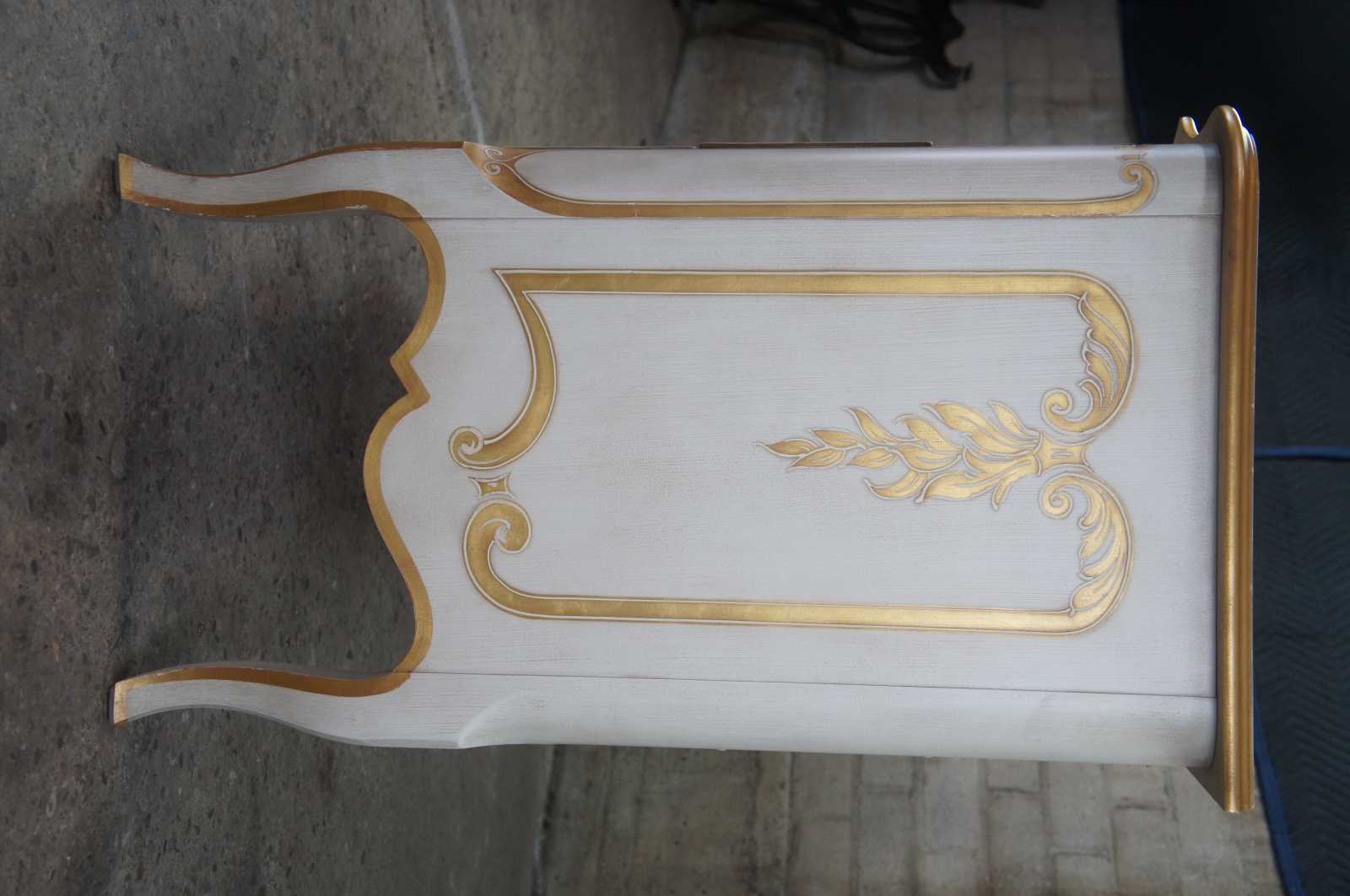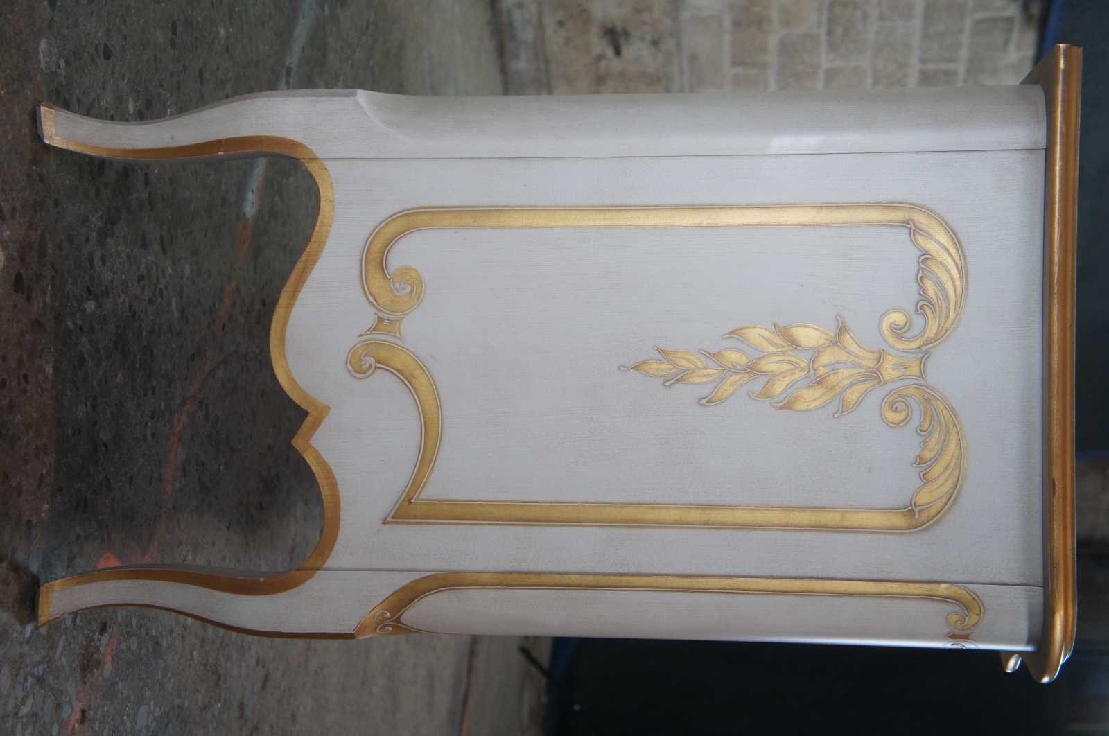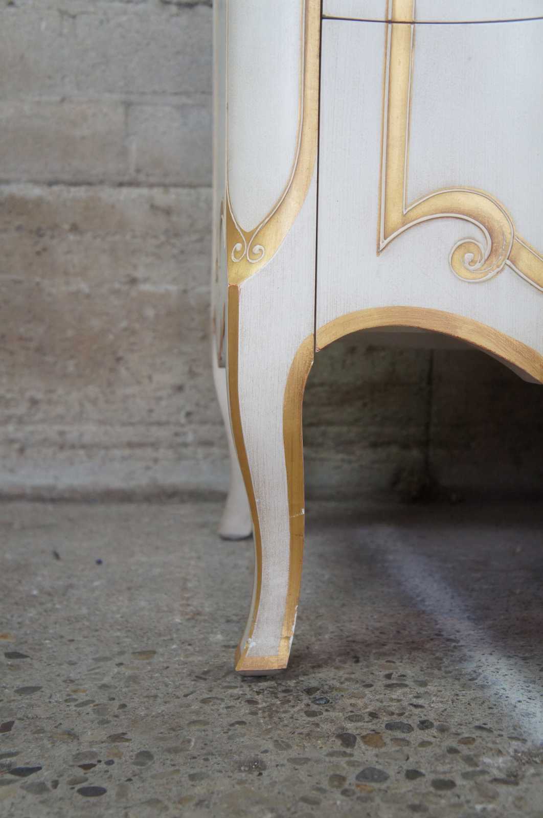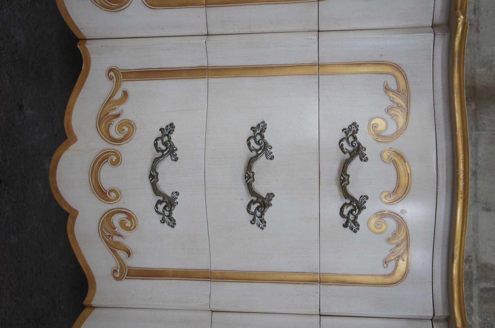 John Widdicomb dresser, circa 1960s. Drawing inspiration from Italian Florentine and Provincial. Features a rectangular form with serpentine front, 9 dovetail drawers with dividers and cabriole legs. Finished in Antique white with gold painted trim.
