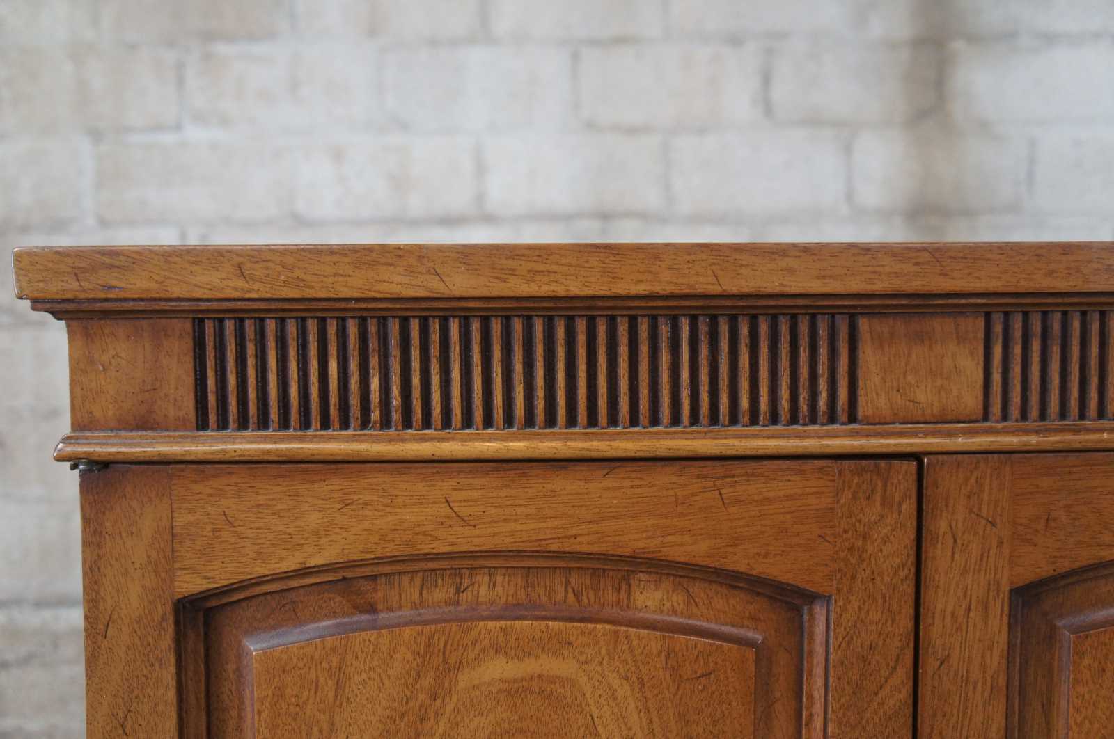 Italian Provincial Sideboard/ Server by Drexel Heritage, circa 1961. Part of their Triune collection, finished in Mahogany. Features a rectangular form sporting a Tuscan inspired design with a fluted apron, paneled doors and brass hardware. Includes 4 dovetailed drawers, a central cabinet and shelves. 555-135-6