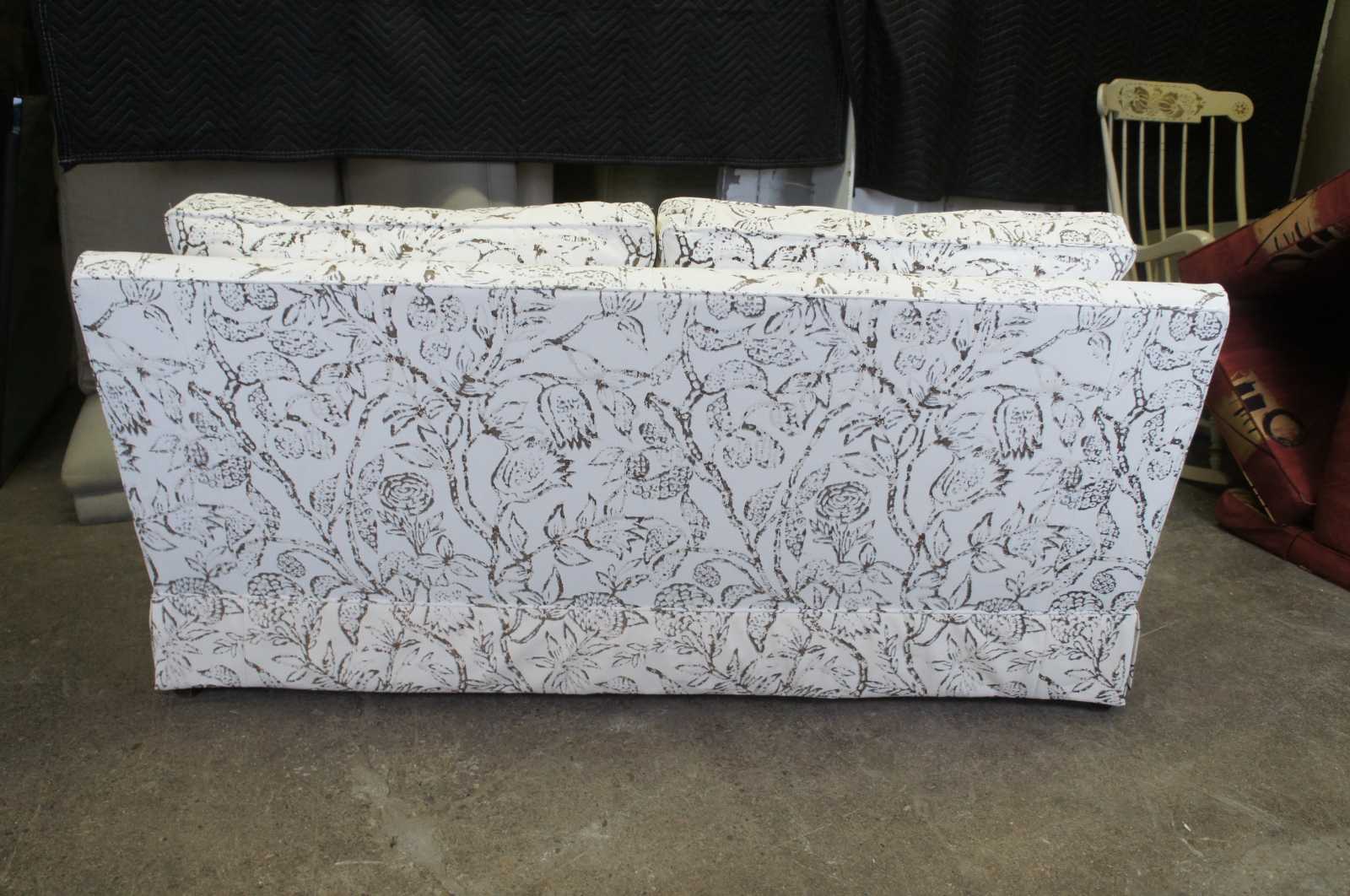 Mid Century white floral upholstered sofa. Renovated by LT Laquaglia Inc of Dayton Ohio. Features a rectangular form with downfilled cushions, arm covers and walnut legs.