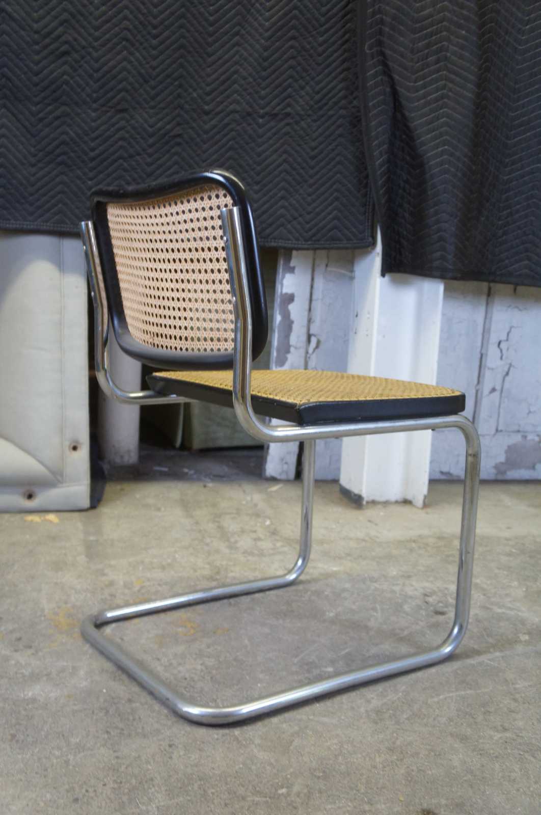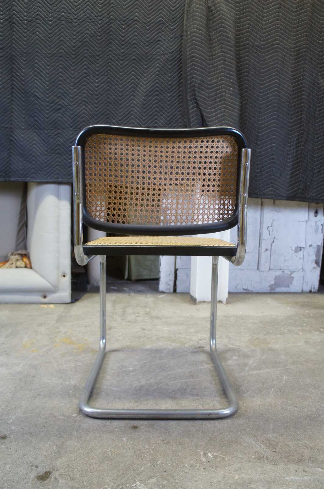 Stendig Breuer Cesca Bauhaus side chair is by Marcel Breuer. The cantilevered stainless steel design is perfect for casual dining spaces. The perfectly balanced stainless steel frame provides sturdy support for the woven rattan seat. A durable ebonized frame surrounds the caned back and seat.