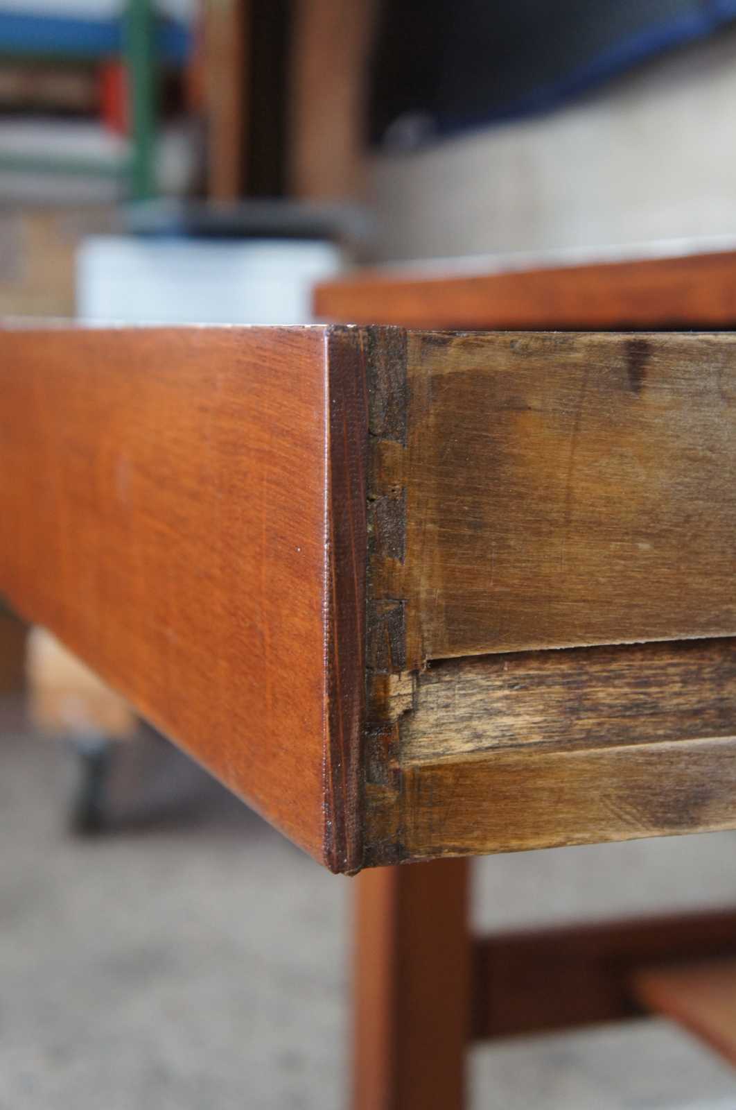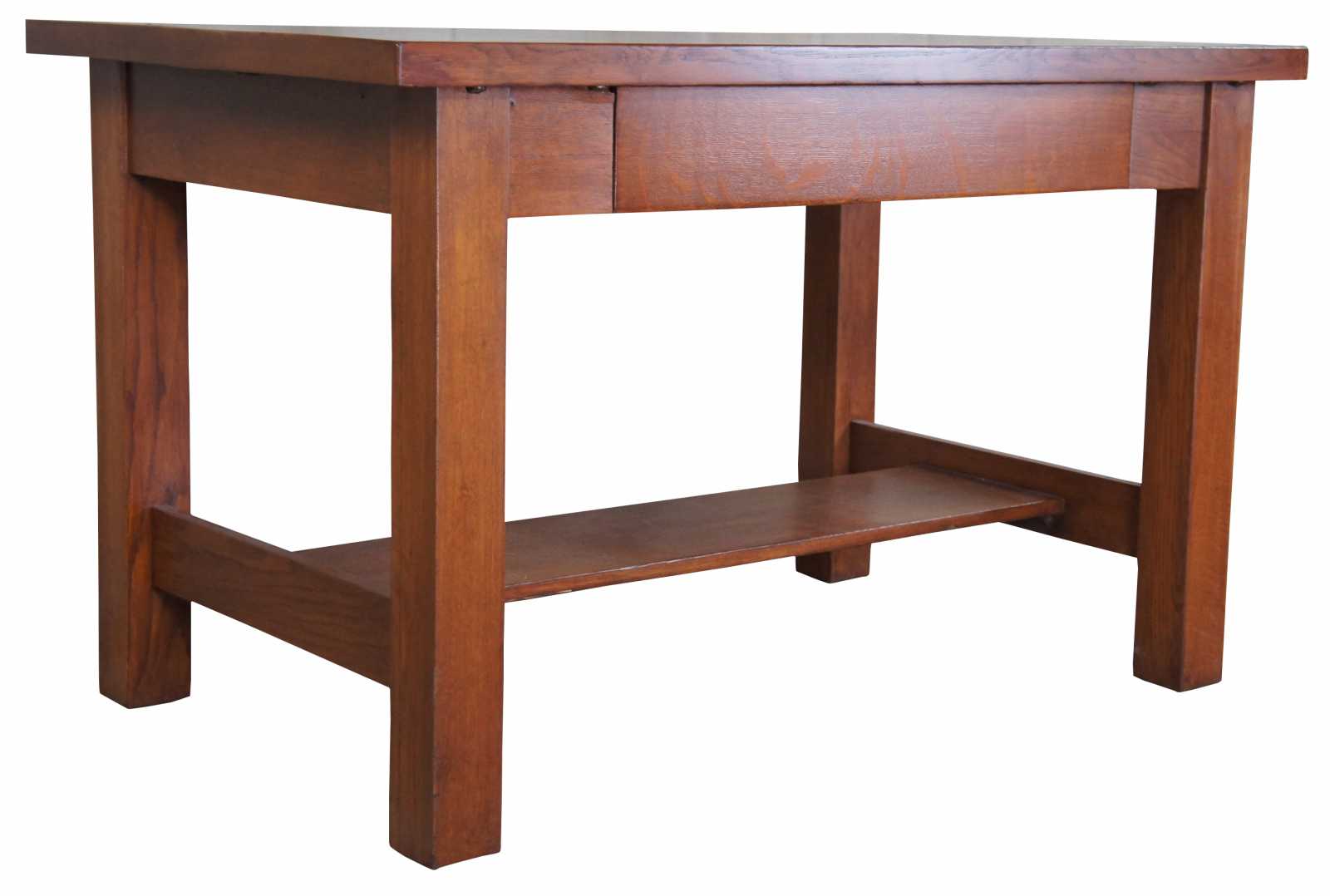 Antique Imperial Funtiure library table or writing desk. Made of quartersawn oak featuring one large drawer, squared legs and trestle base. Marked on underside, Imperial Furniture, Grand Rapids, Michigan. circa 1939-1940s.