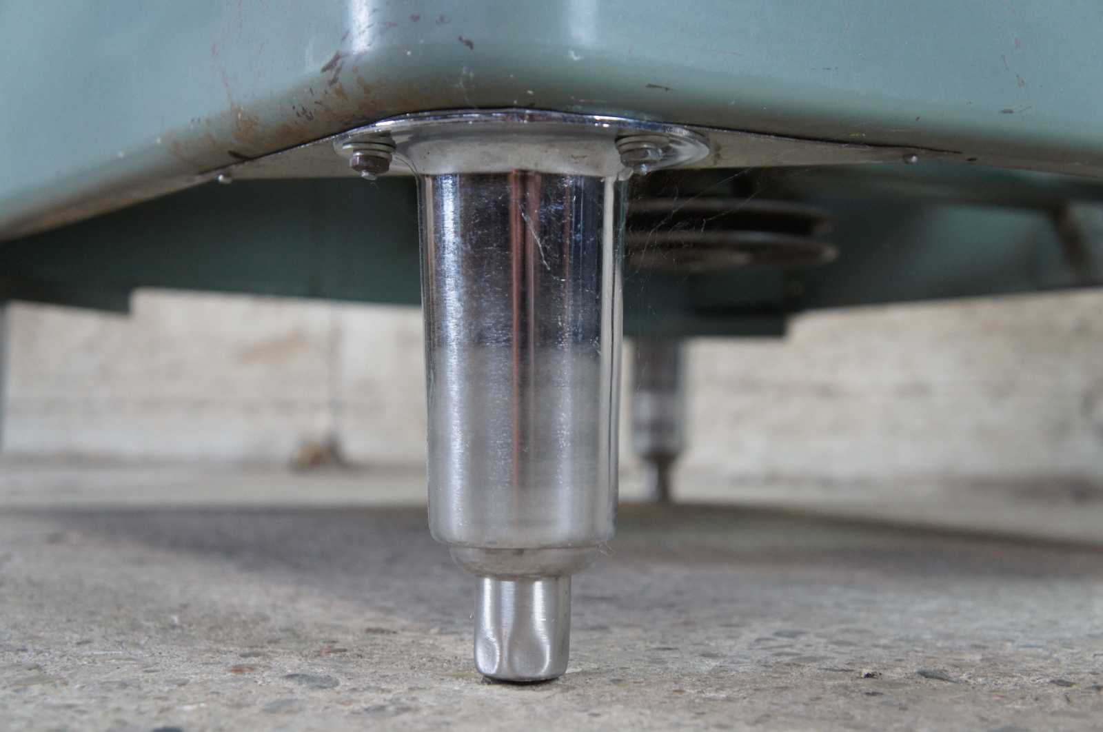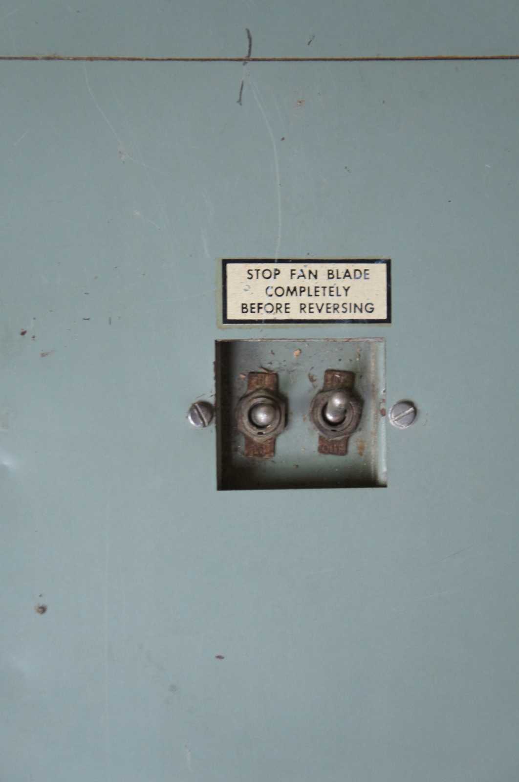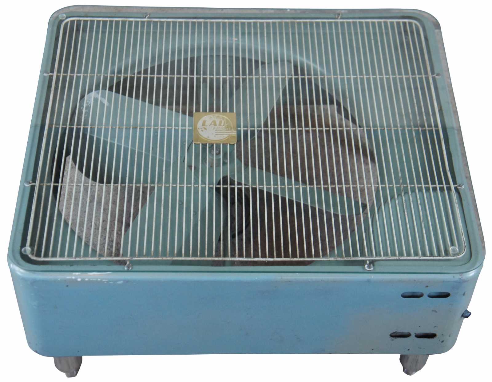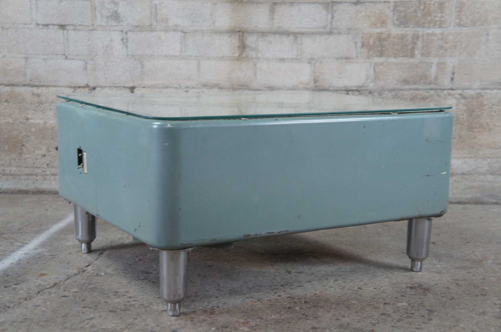 Vintage Industrial Lau Box Fan Table. Square form with adjustable legs and a glass top