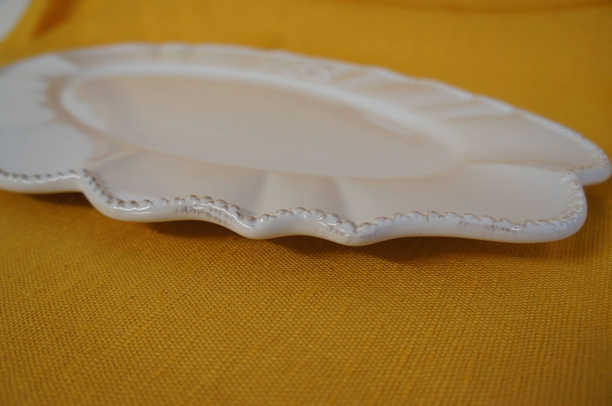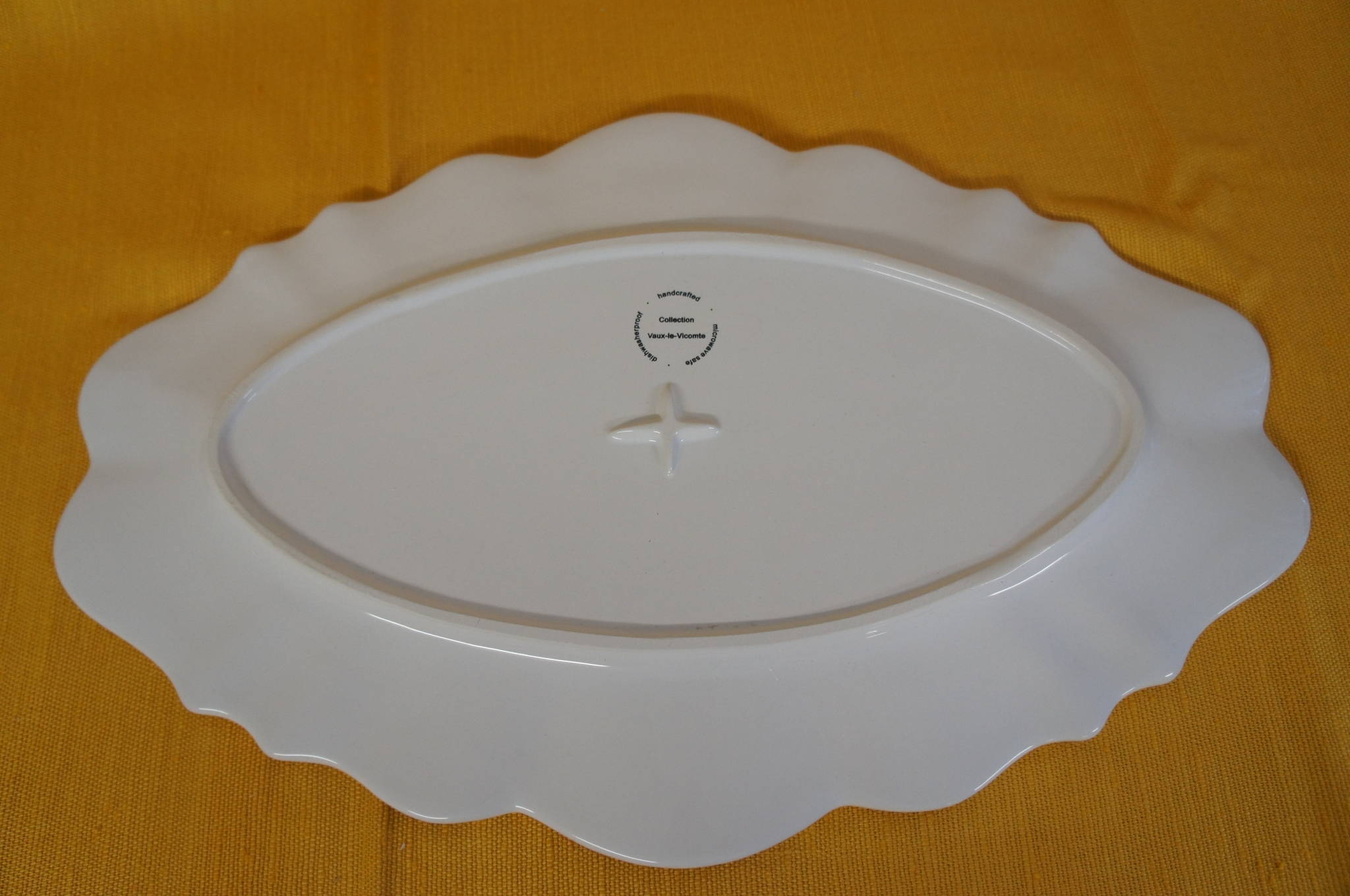 A pleasing handcrafted white serving plate with subtle decorativeembellishments. Dishwasher and microwave safe.