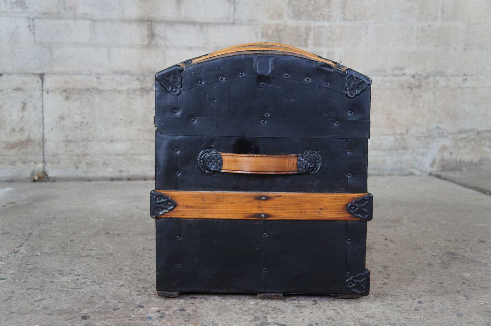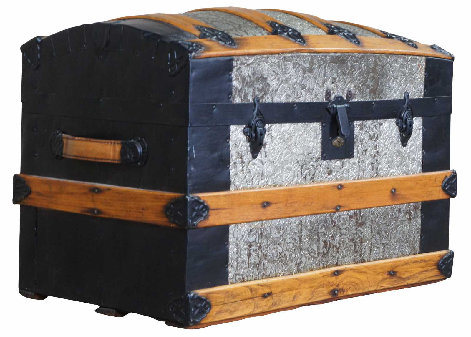 Antqiue Victorian domed steamer wardrobe trunk with insert. Made of embossed metal panels, cast iron hardware, oak banding and leather handles.