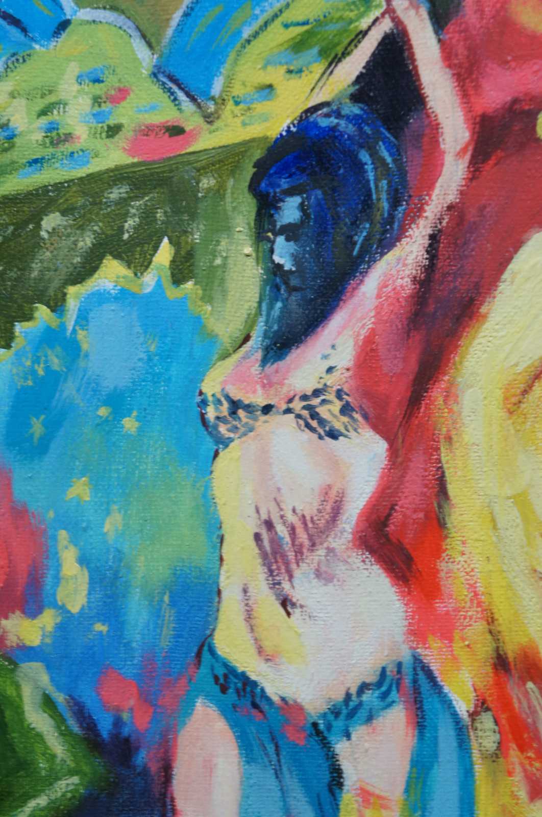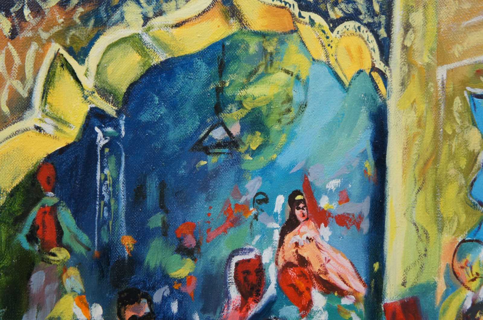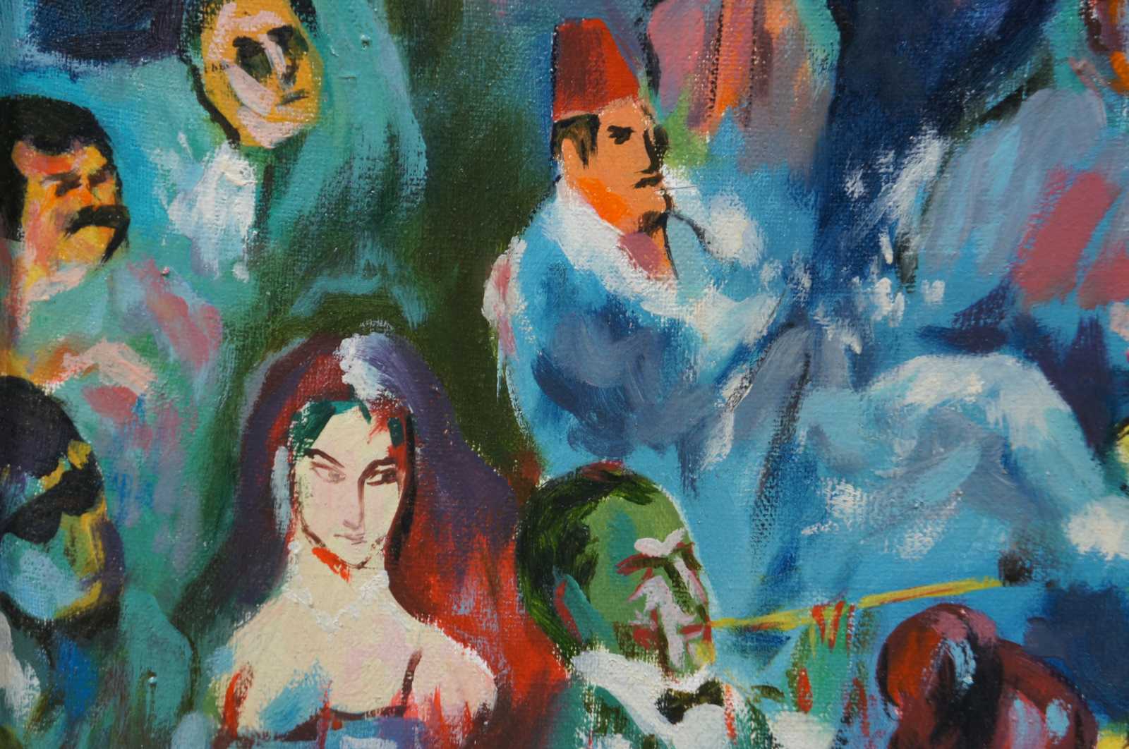 Vintage colorful oil painting showing an expressionist Middle Eastern bar or restaurant scene with performing belly dancers; signed SR in lower corner.