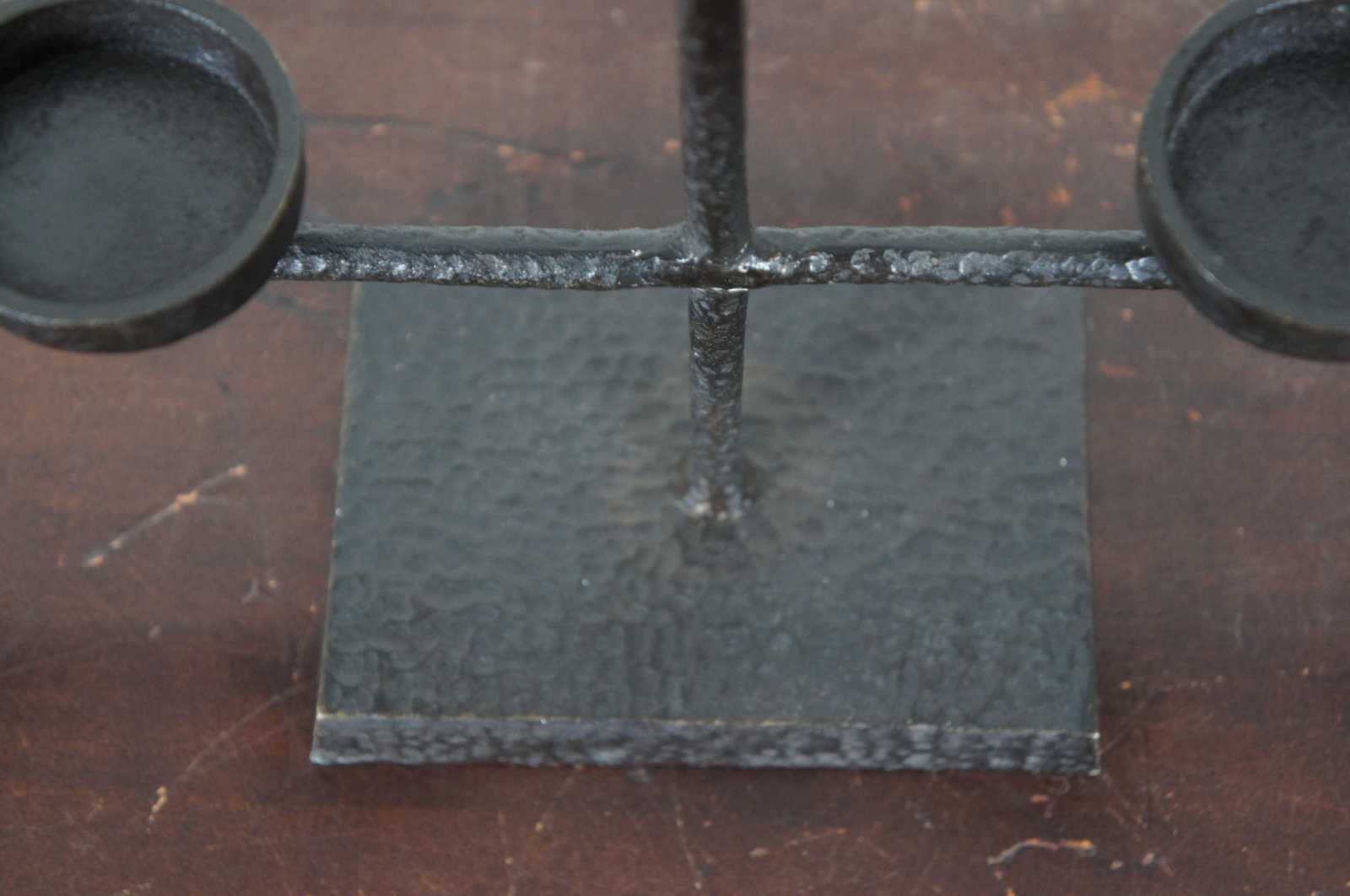 Pottery Barn rustic farmhouse hammered iron and footed fireplace candle holder with spots for eight votive or tealight sized candles.