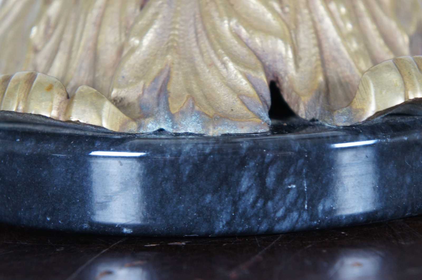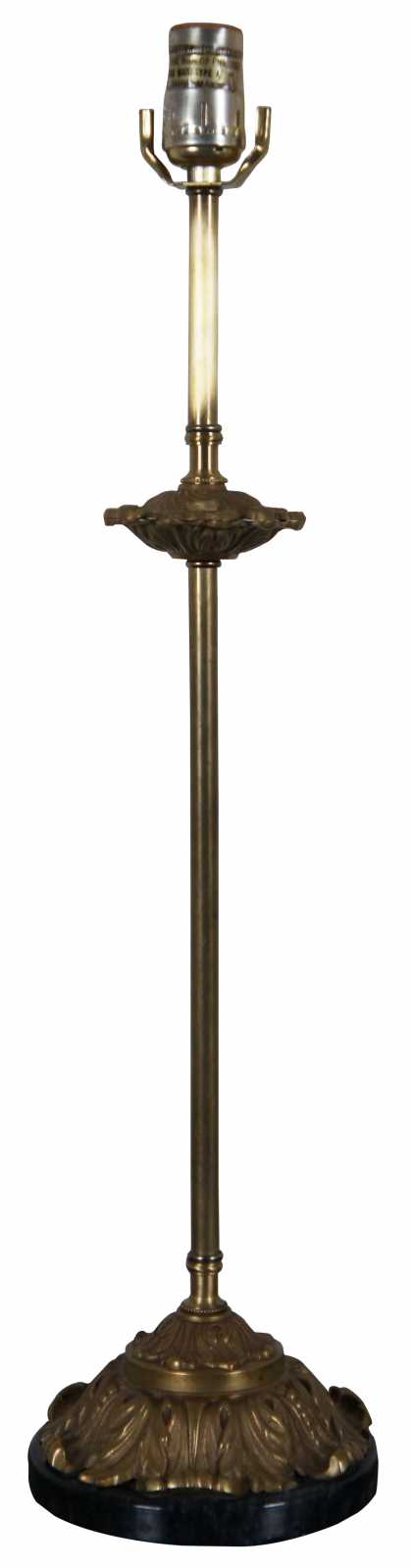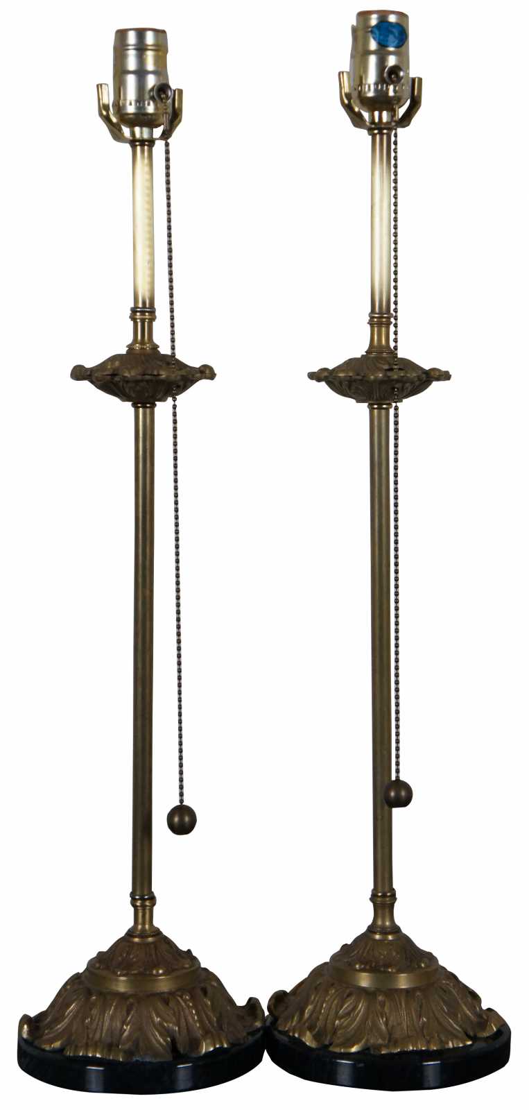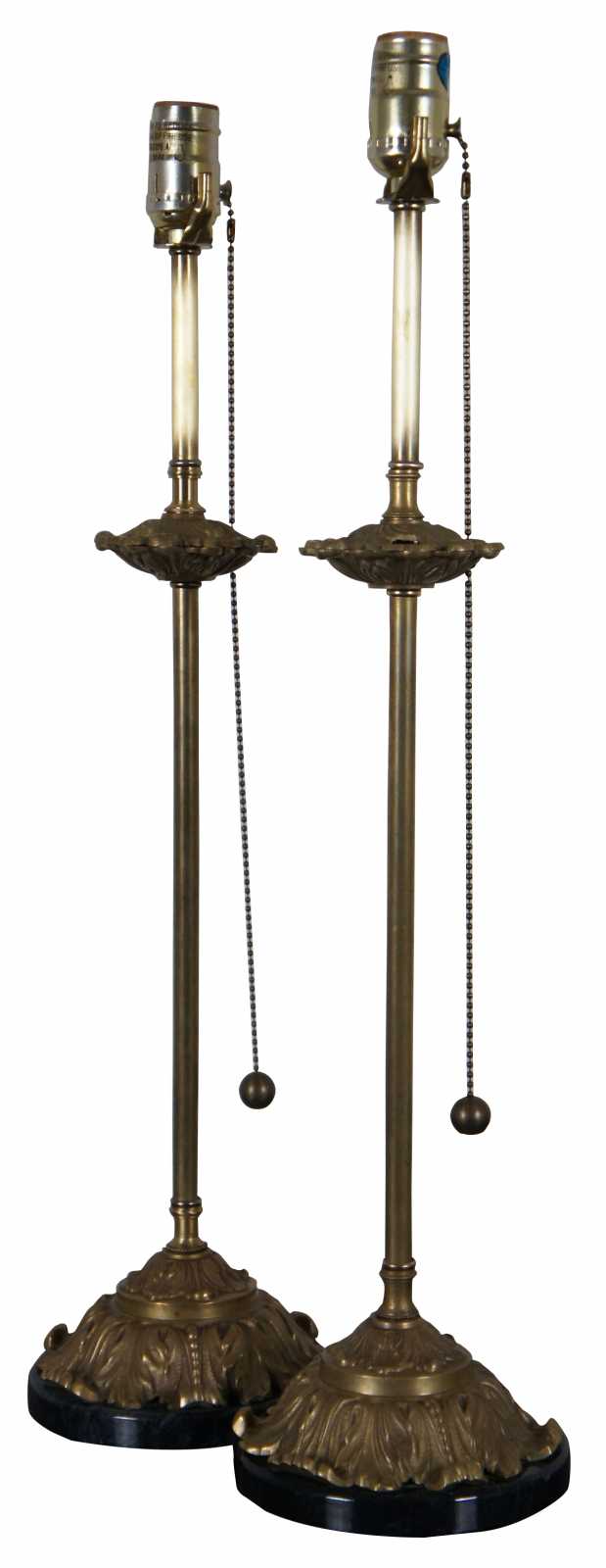 Pair of skinny brass candlestick shaped table or buffet lamps with black marble bases.