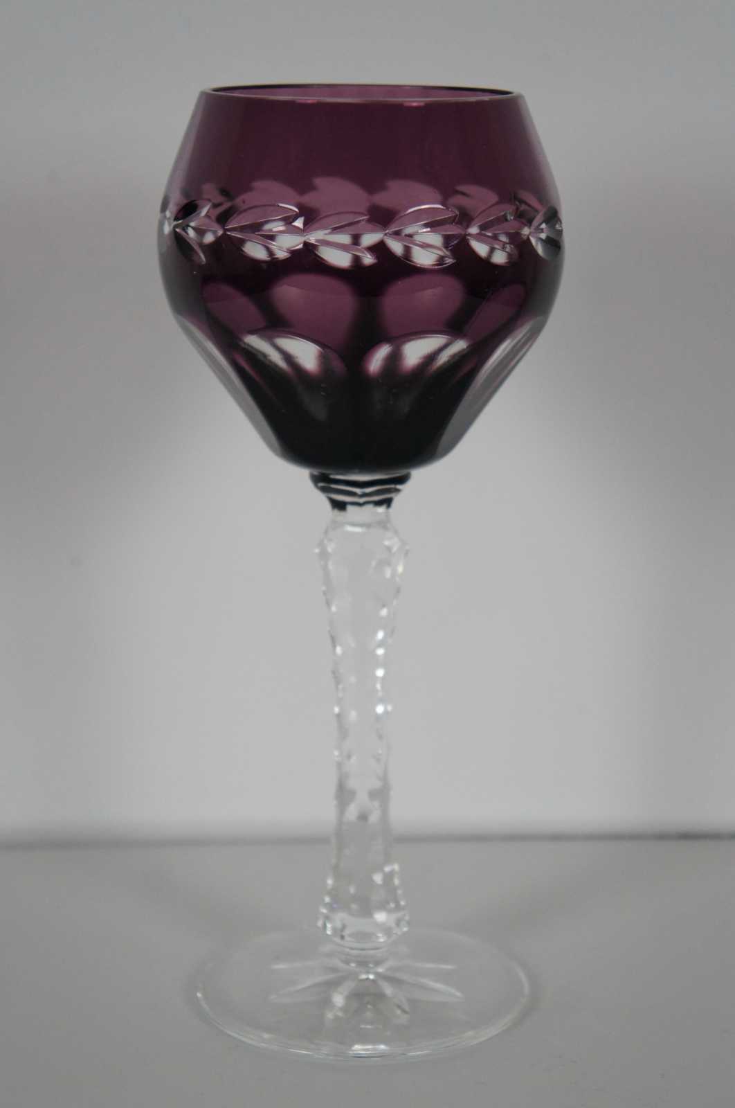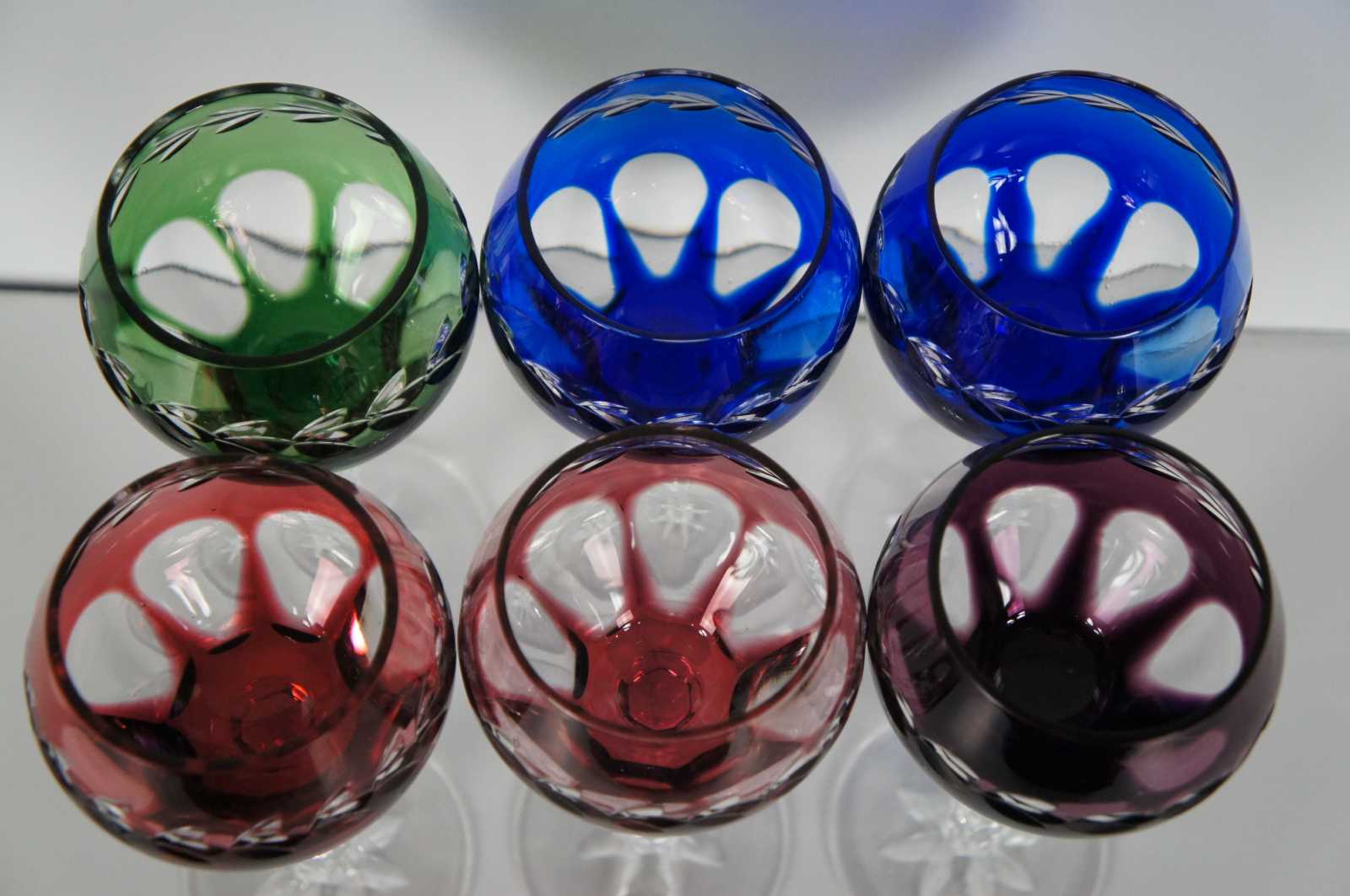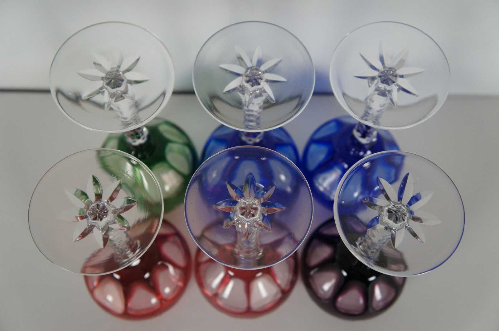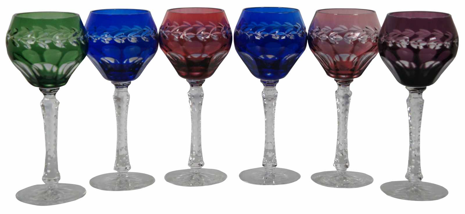 Set of six vintage AJKA Hungary cut to clear wine glasses in cobalt, ruby, amethyst and emerald.