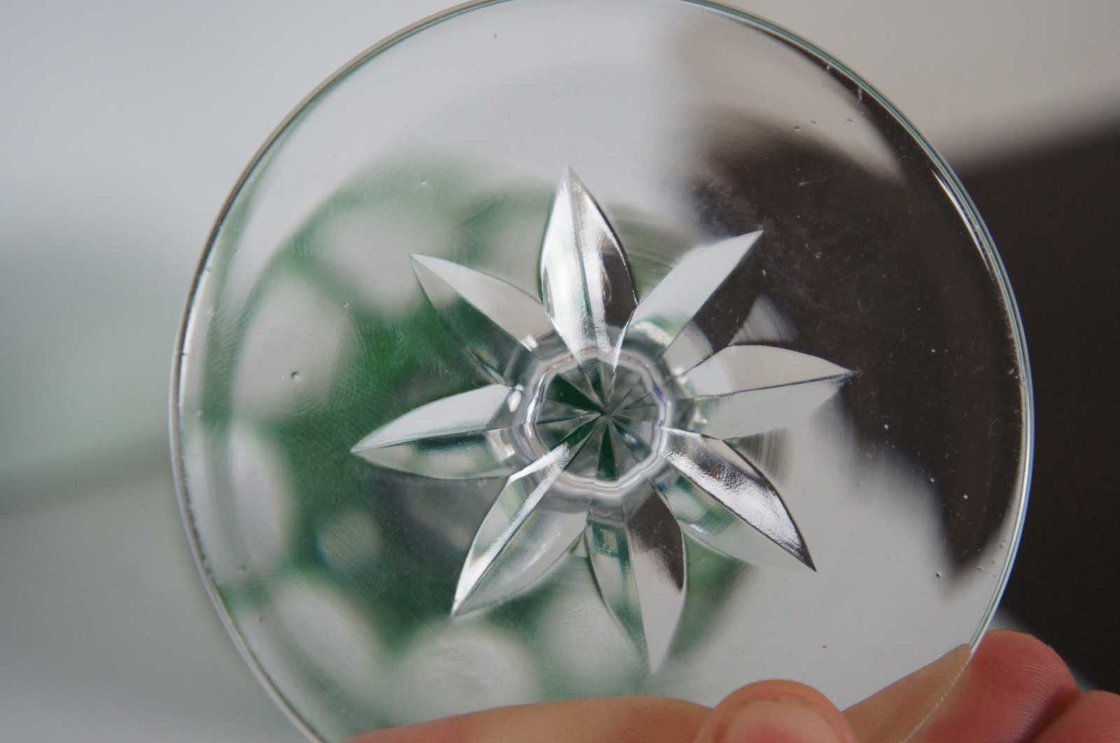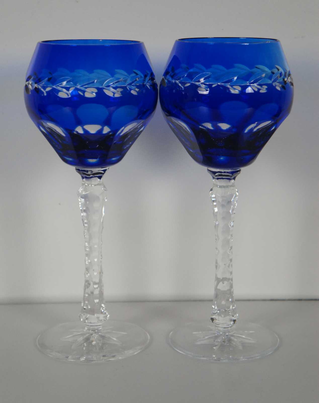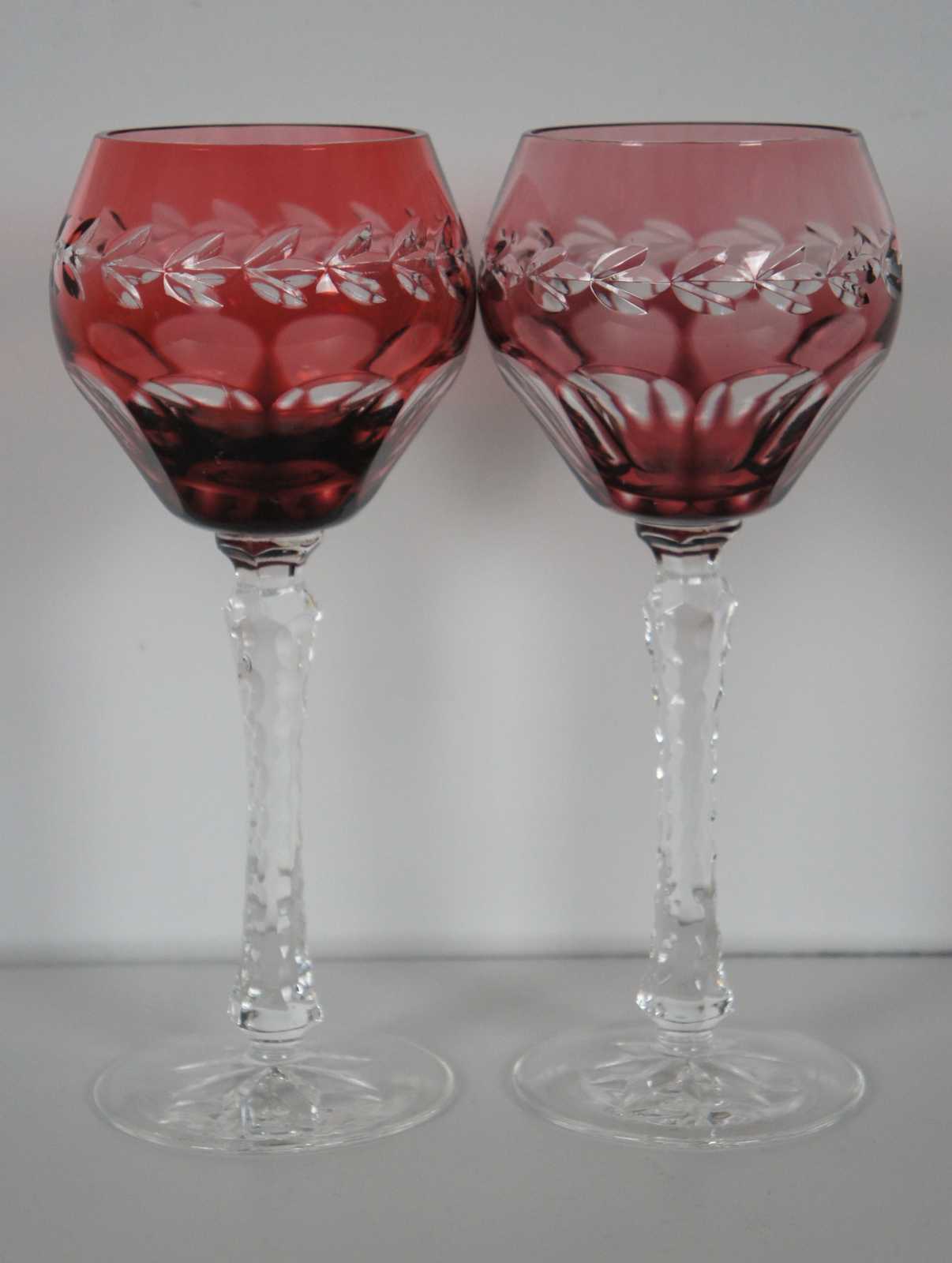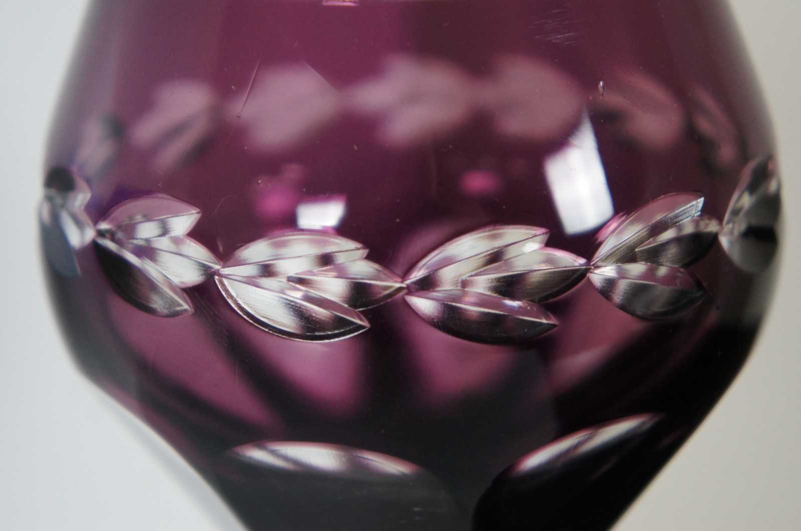 Set of six vintage AJKA Hungary cut to clear wine glasses in cobalt, ruby, amethyst and emerald.