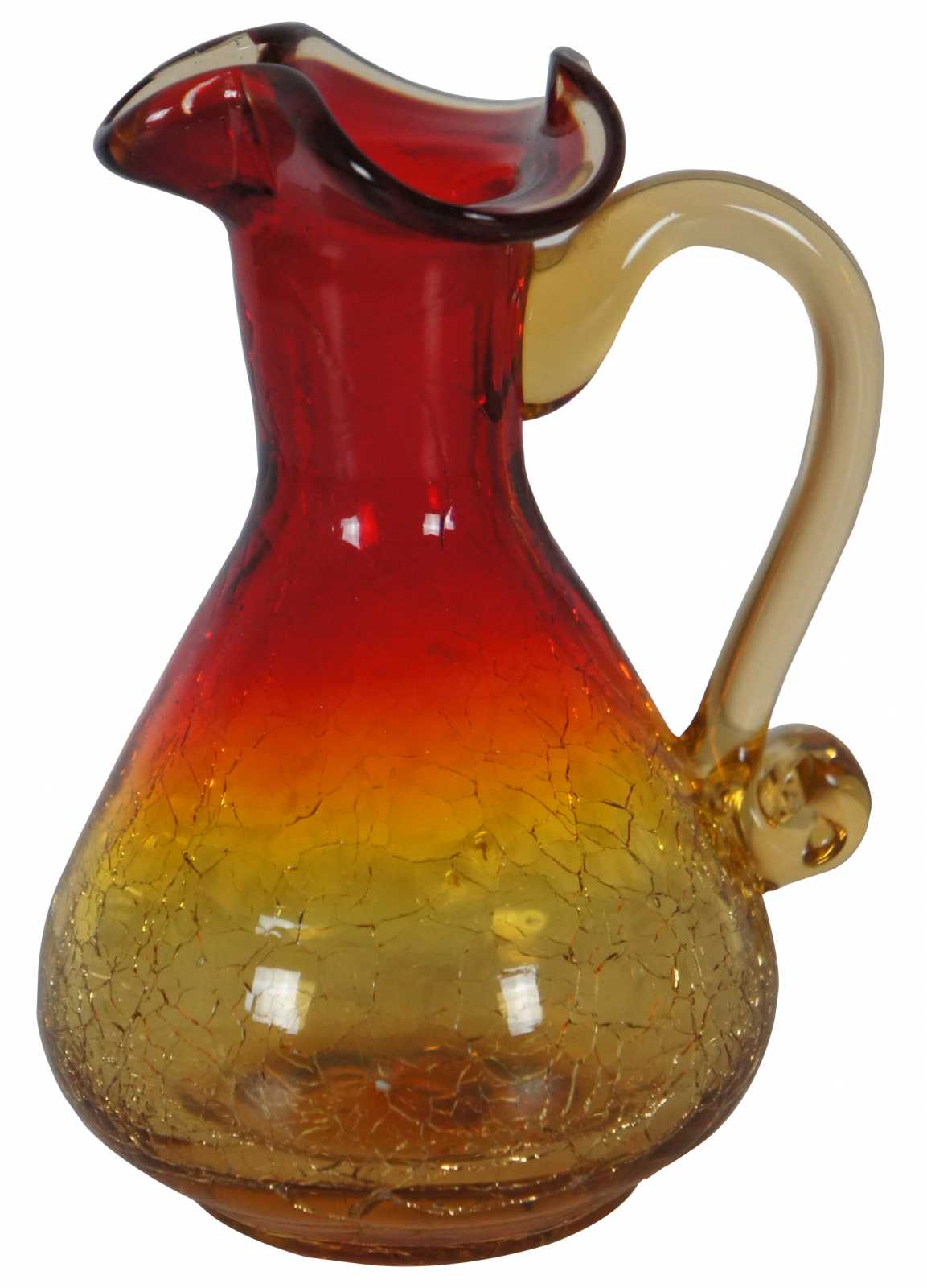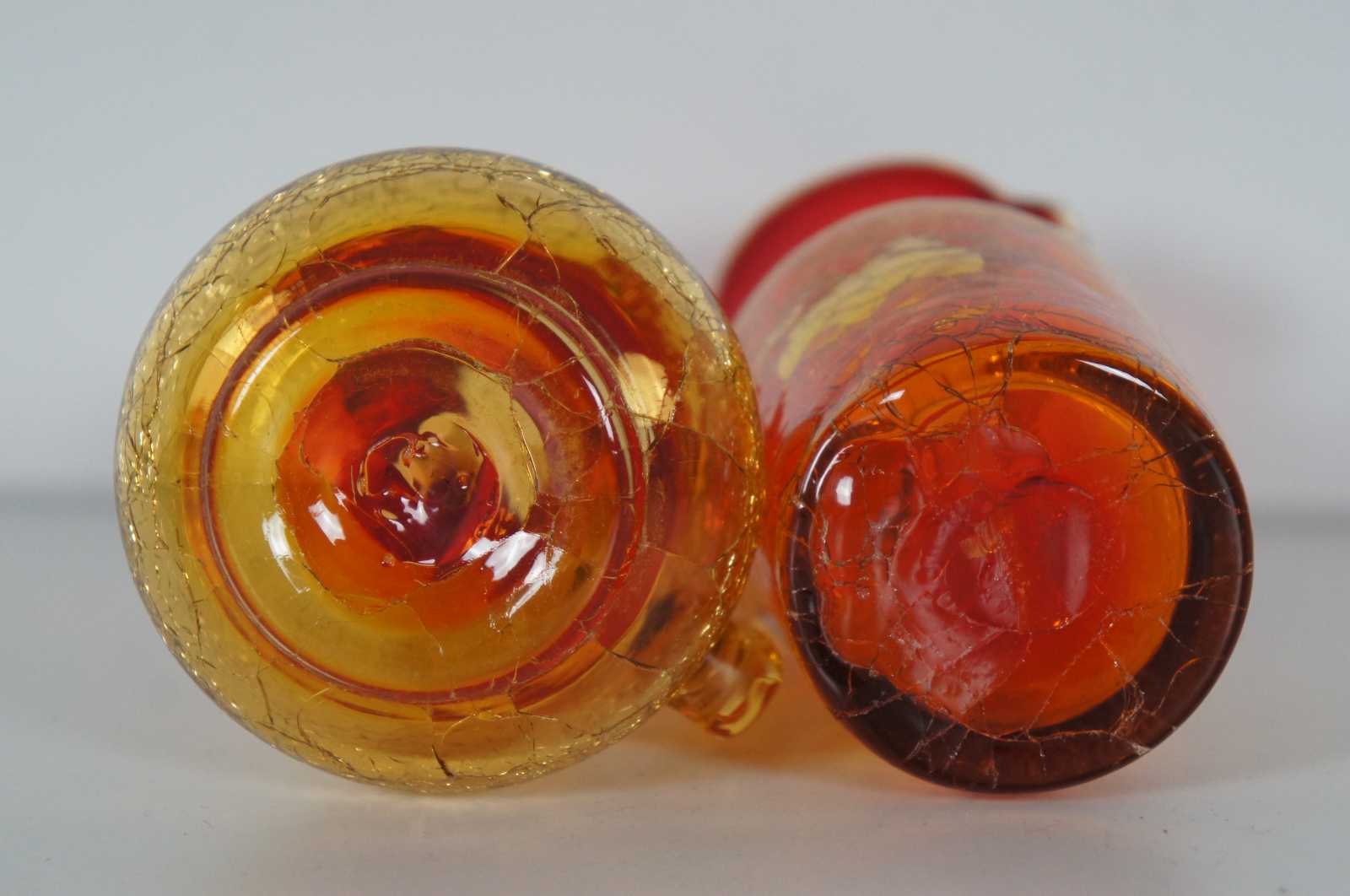 Vintage Blenko art glass Amberina yellow and red ombre crackle glass oil and vinegar pitchers.