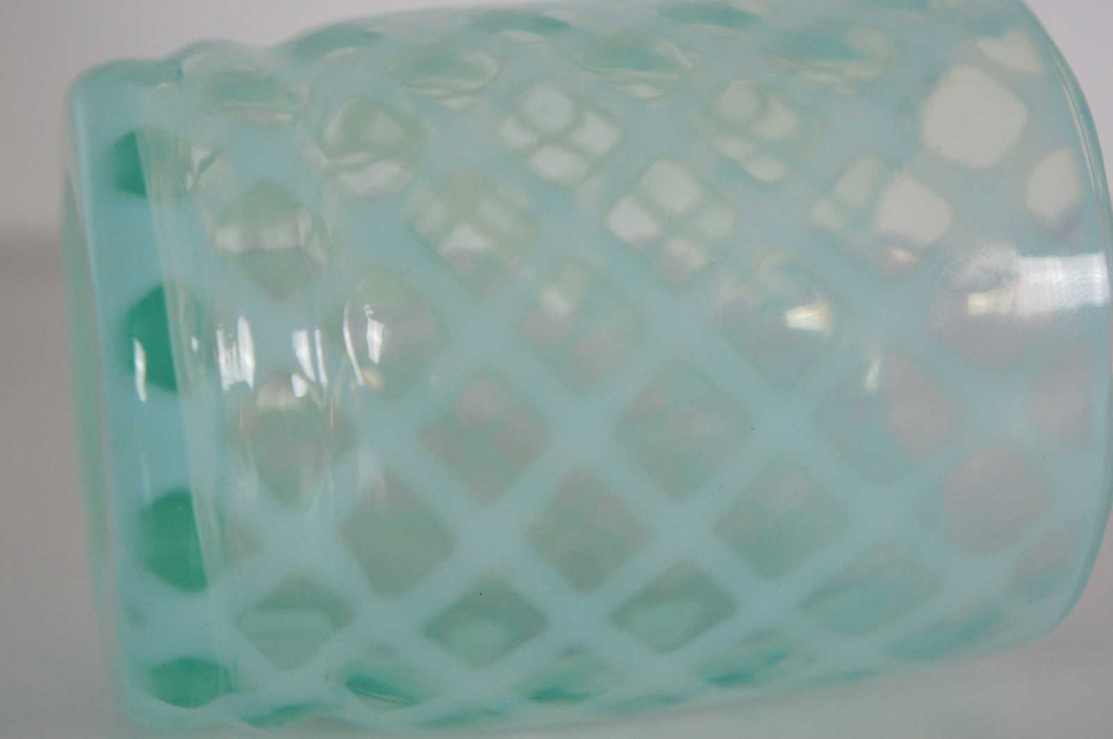 Vintage Fenton art glass opalescent blue and white lattice pattern decanter and single glass.