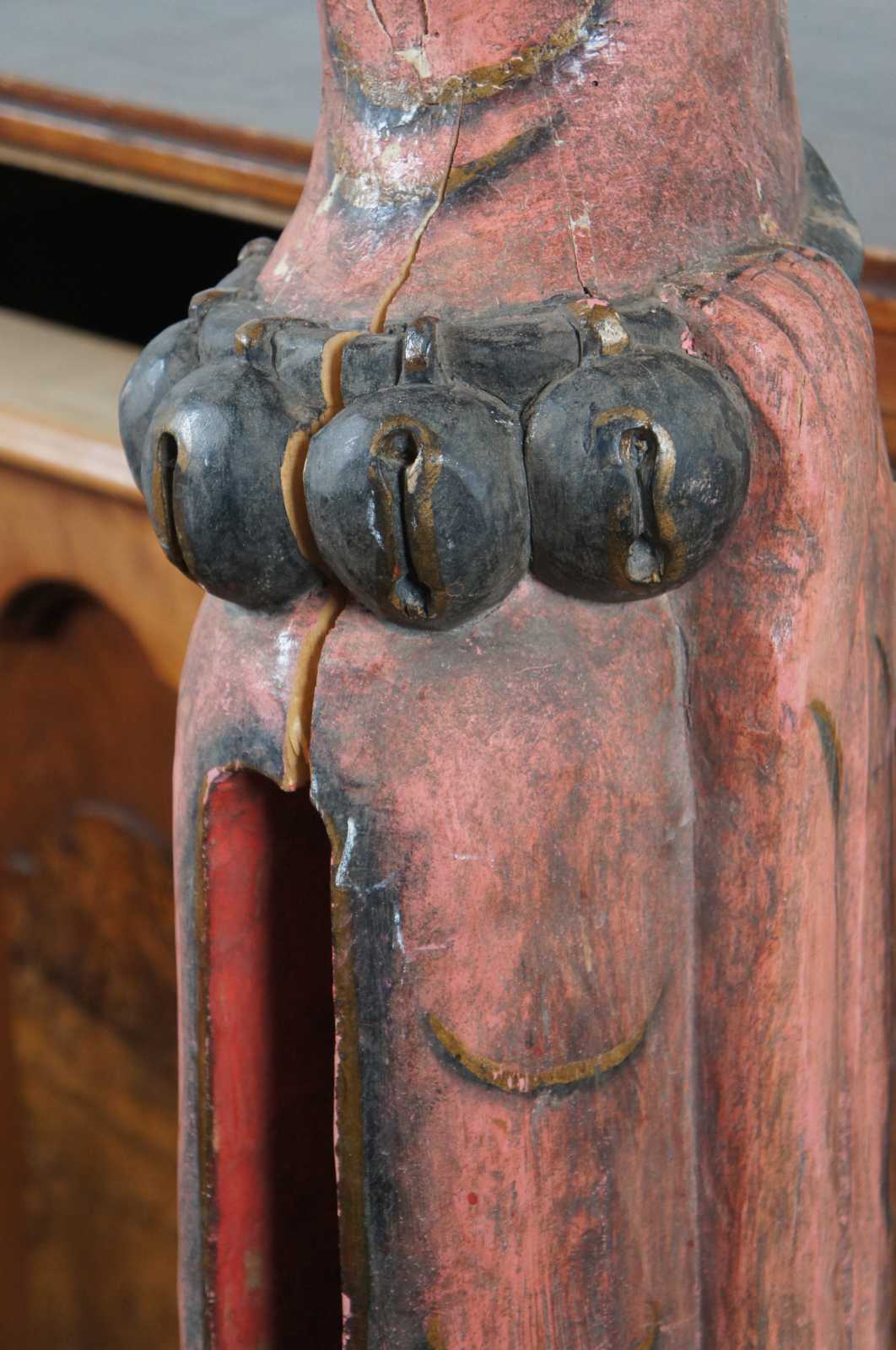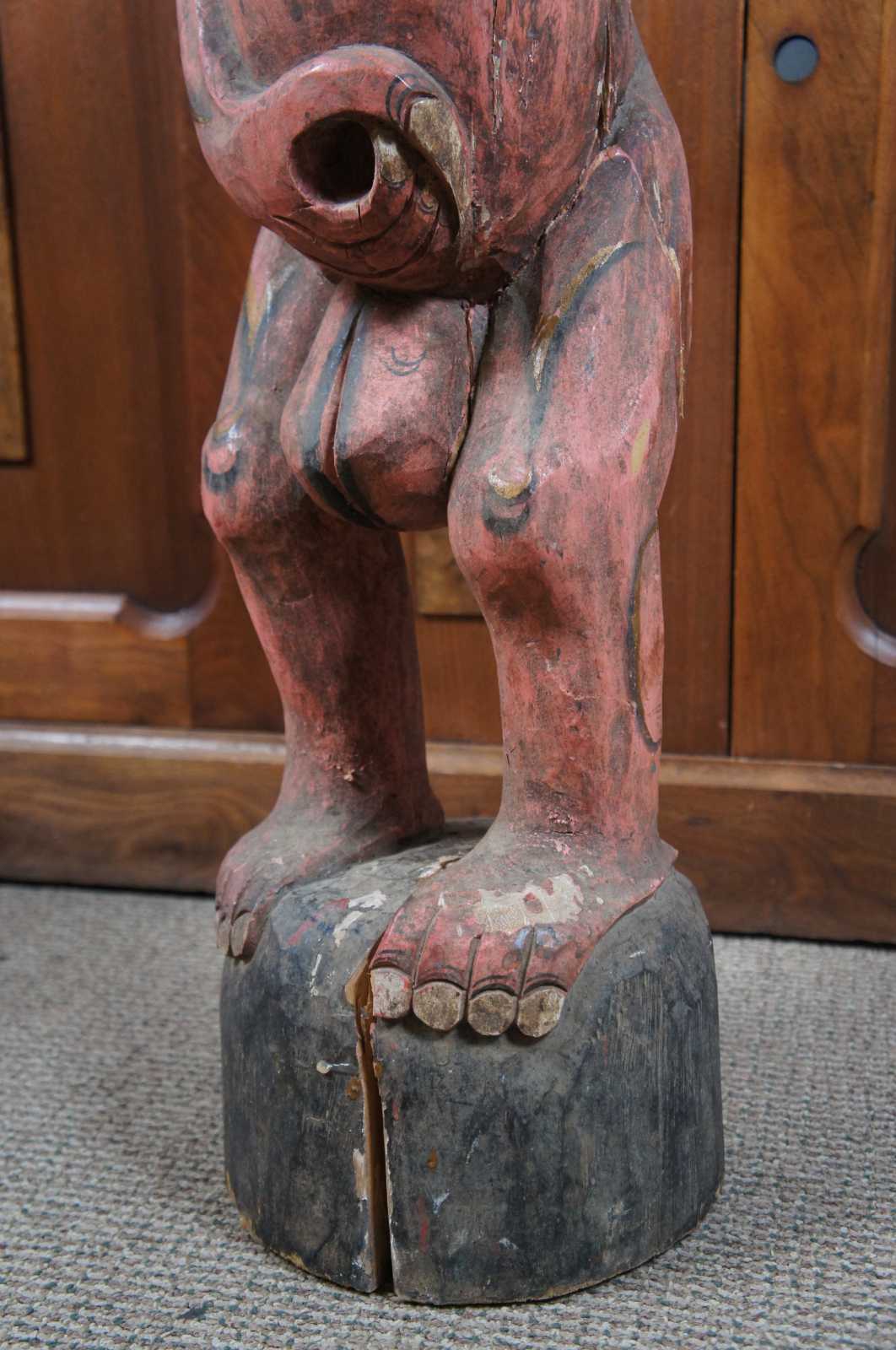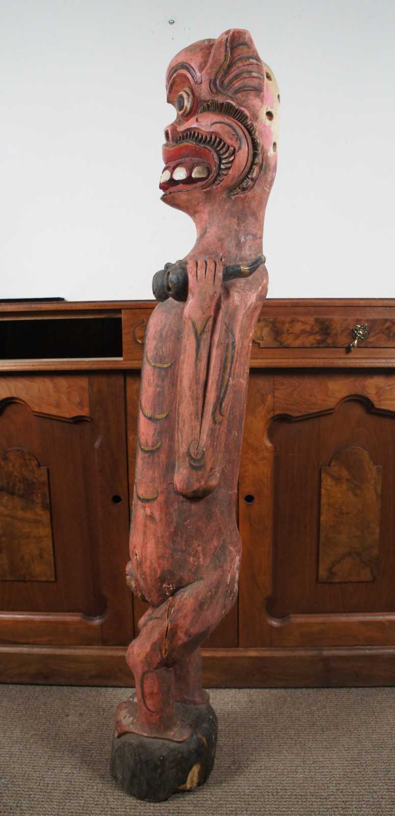 Vintage Indonesian hand carved wooden slit drum / tribal fertility figure painted in red and black with bells around it’s neck and open space in the torso to store the detachable phallus / penis.