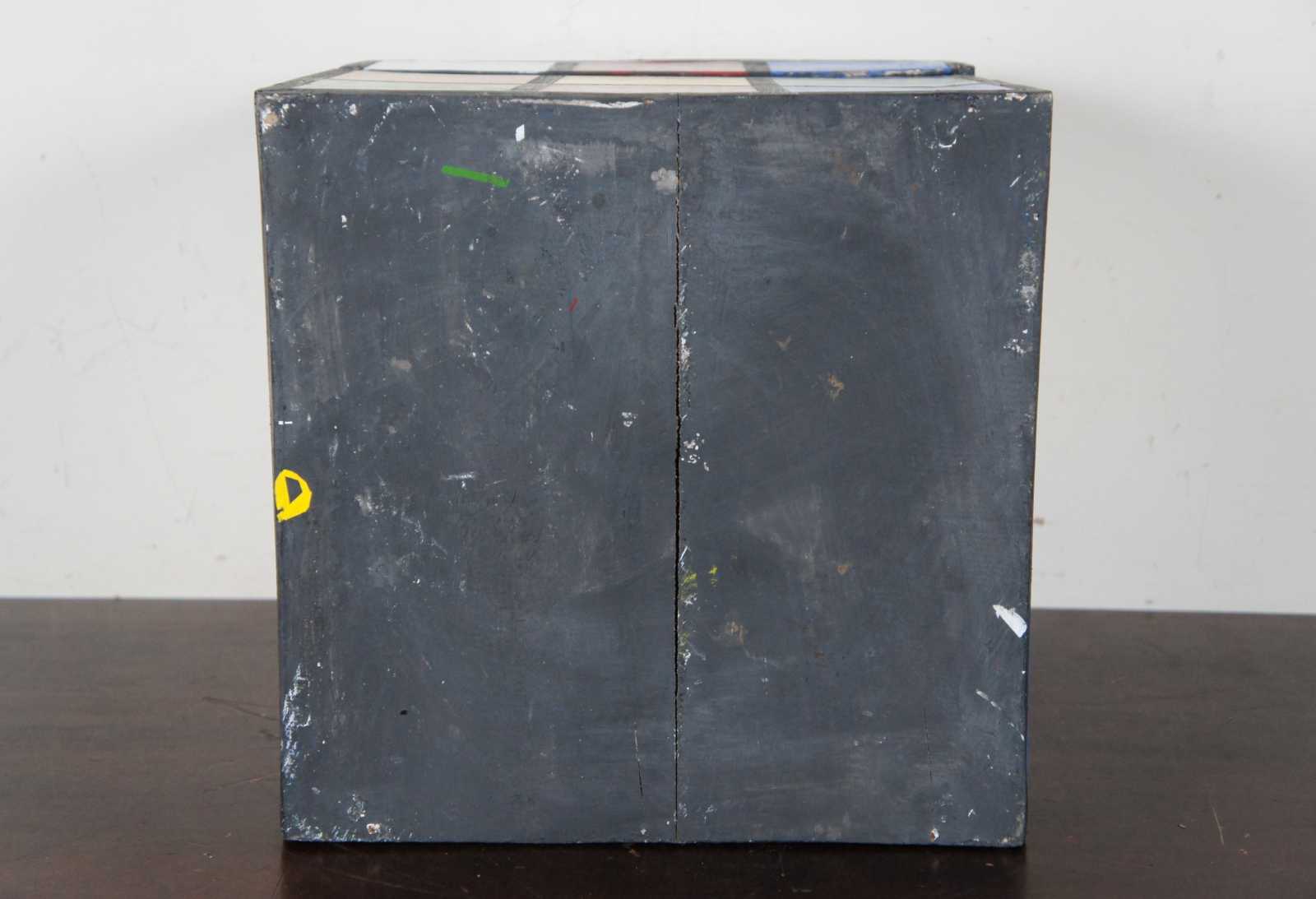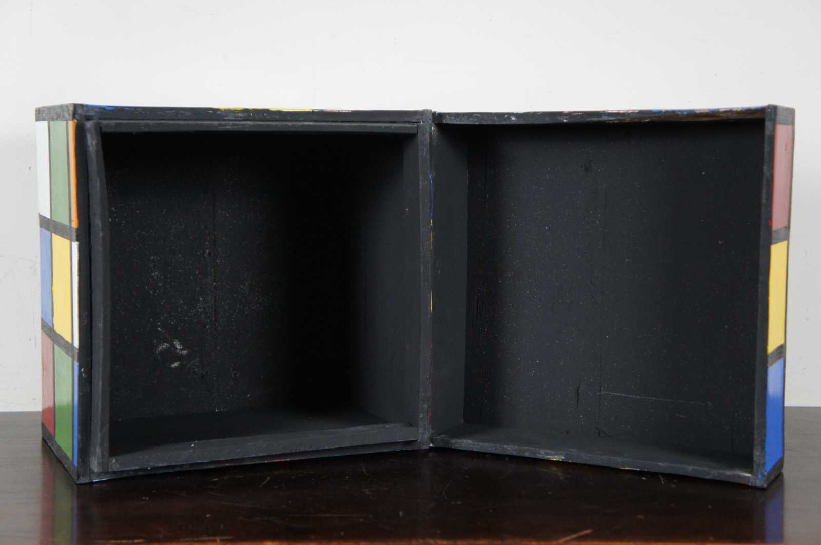 Vintage handmade square wooden box painted to resemble a Rubiks cube puzzle.