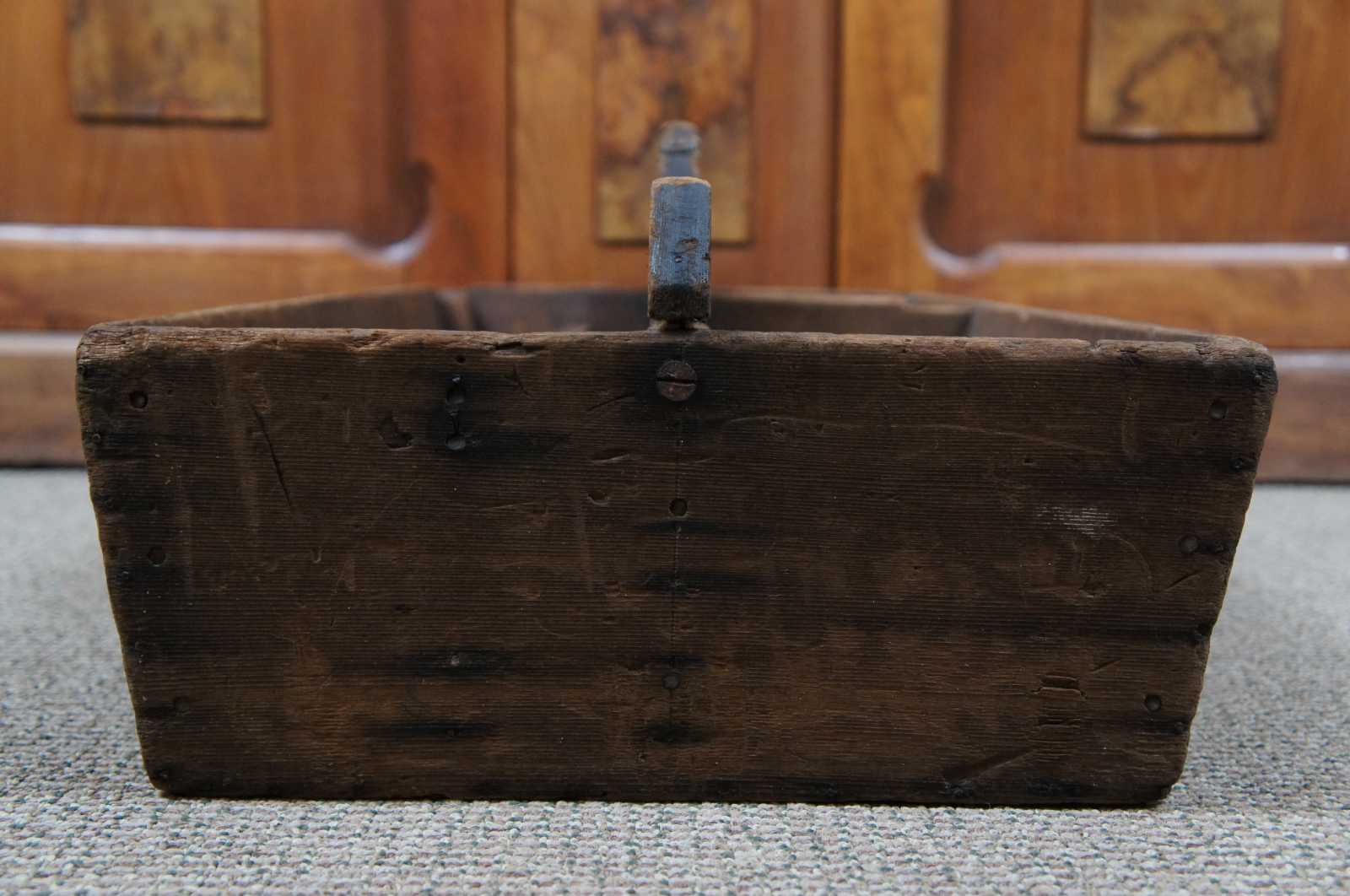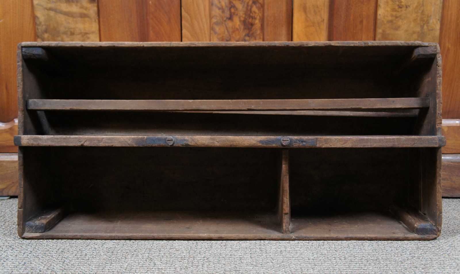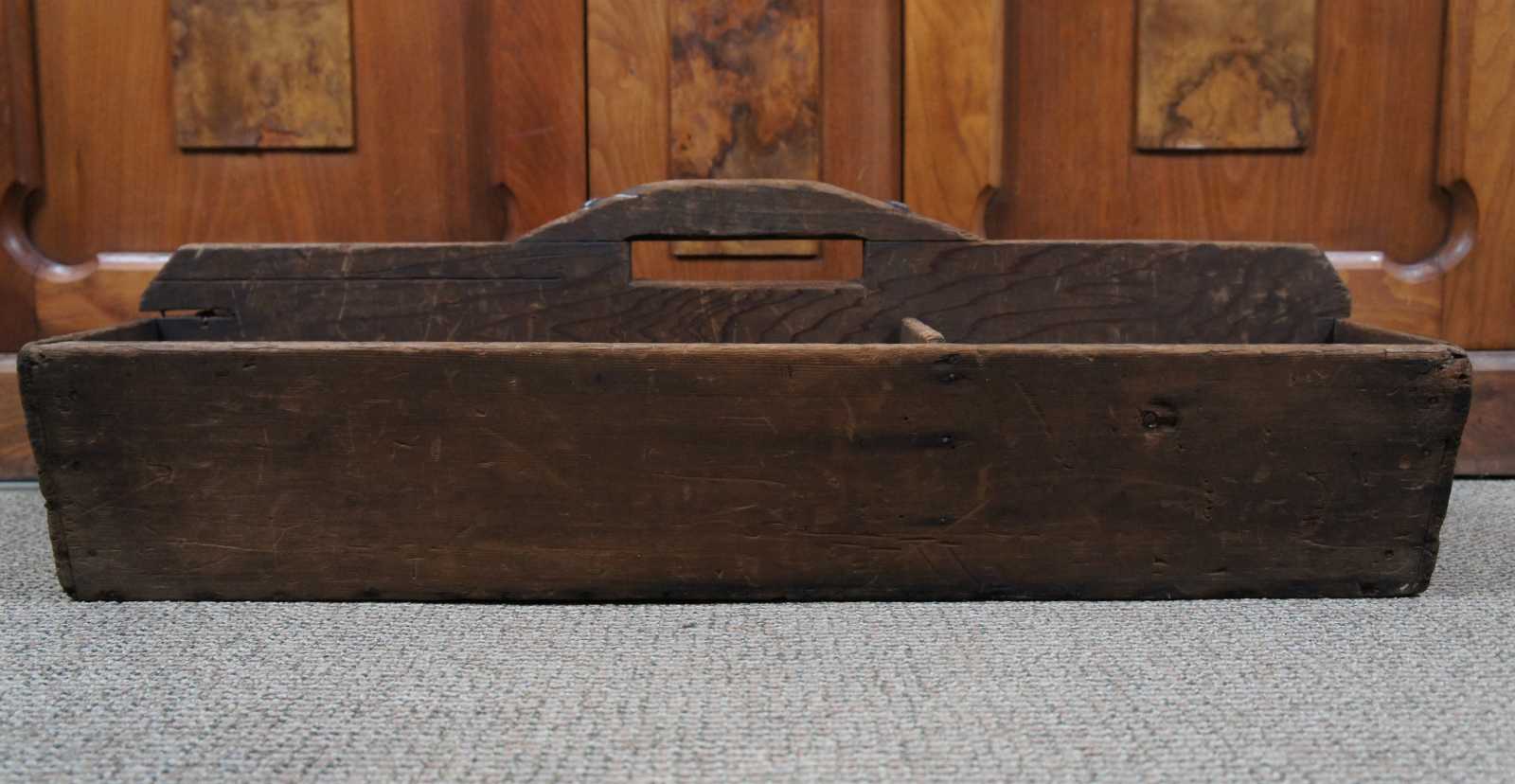 Antique primitive country farmhouse mid 19th century carpenters tote or tool box with center handle and built in dividers.