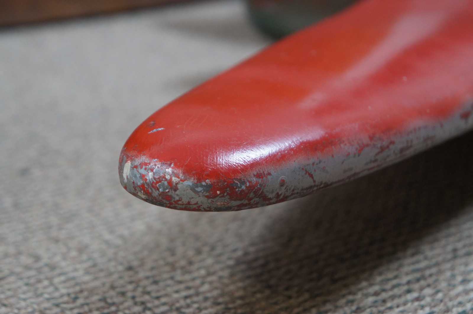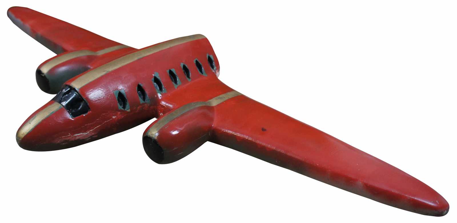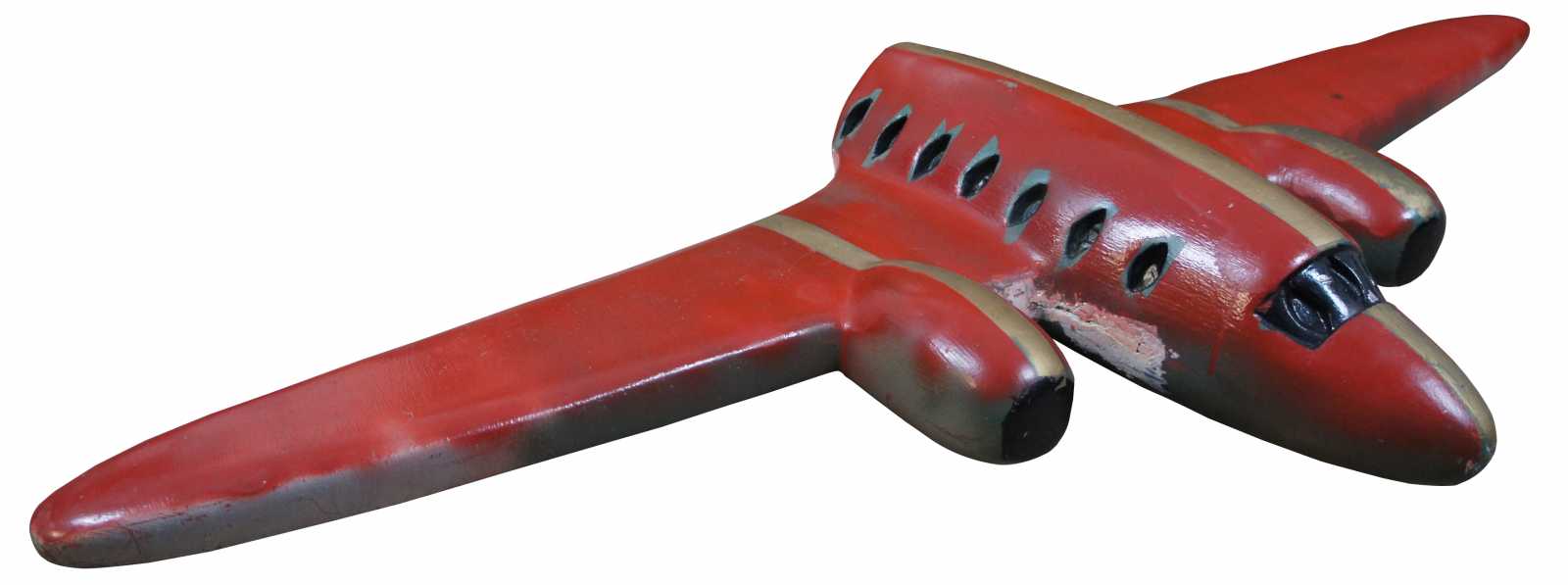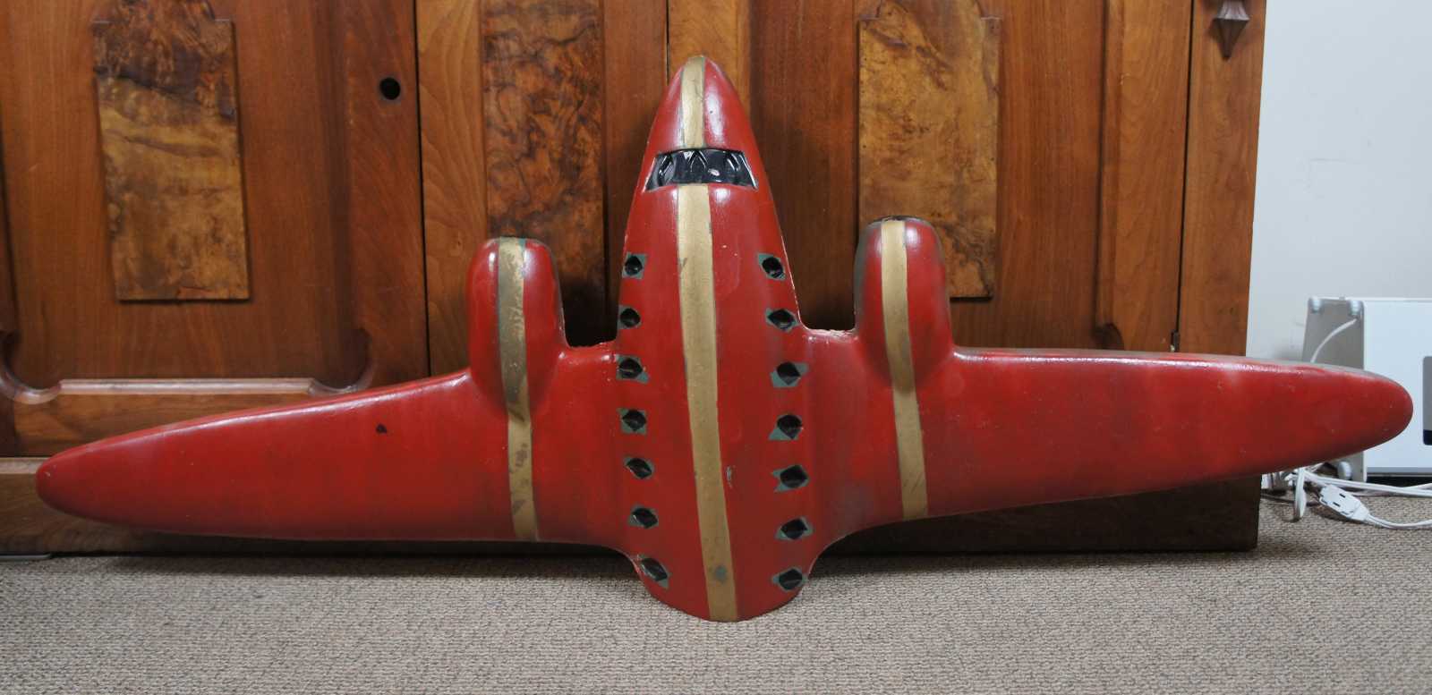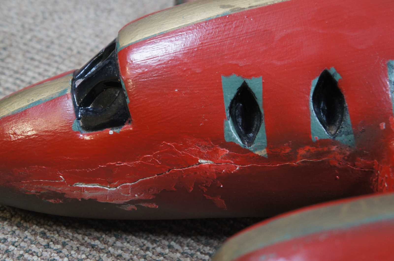 Vintage fiberglass wall sculpture shaped like the front half of a passenger jet; painted red and gold.
