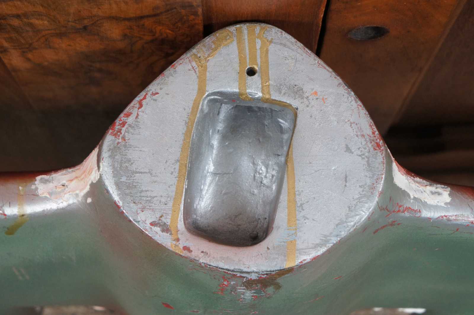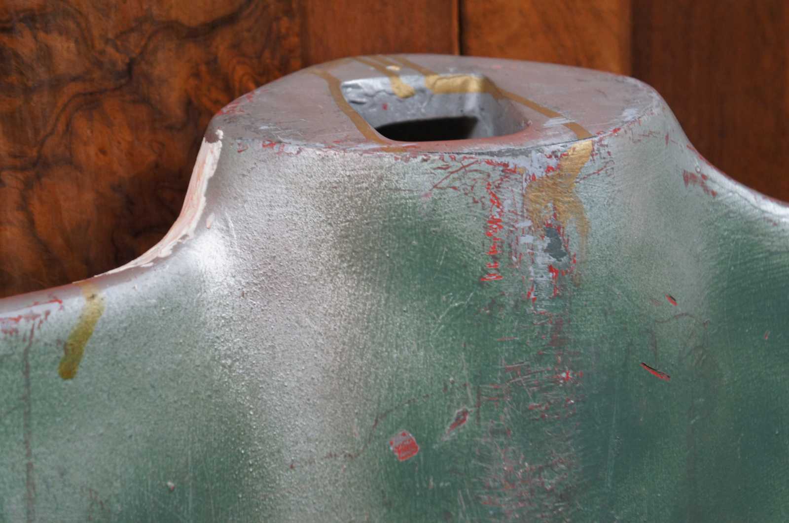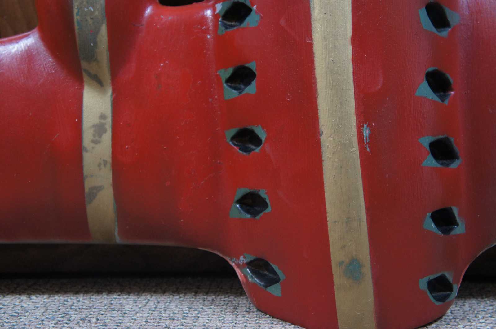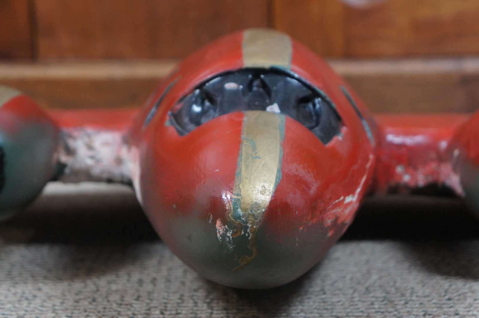 Vintage fiberglass wall sculpture shaped like the front half of a passenger jet; painted red and gold.