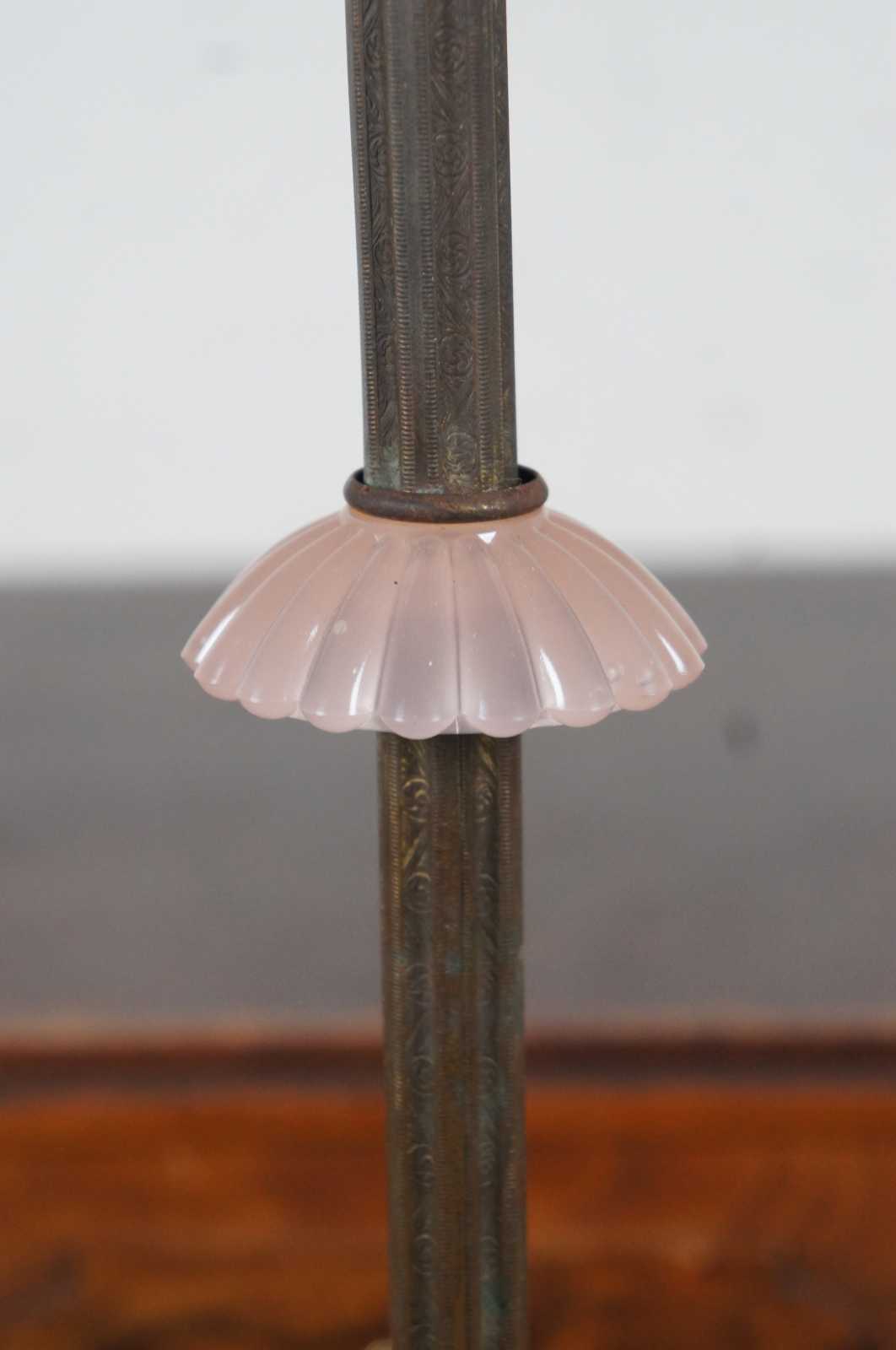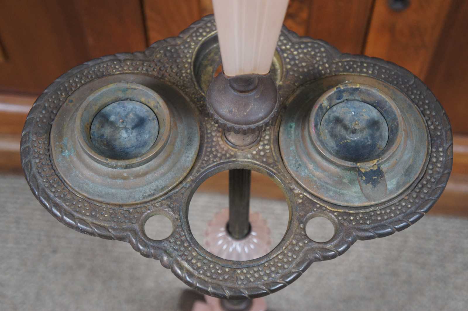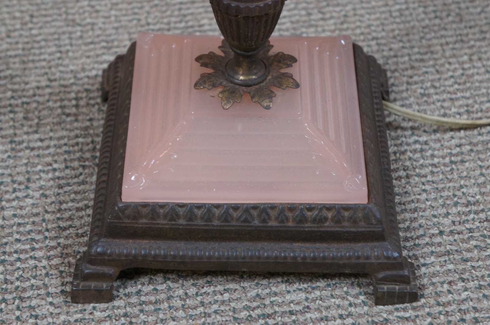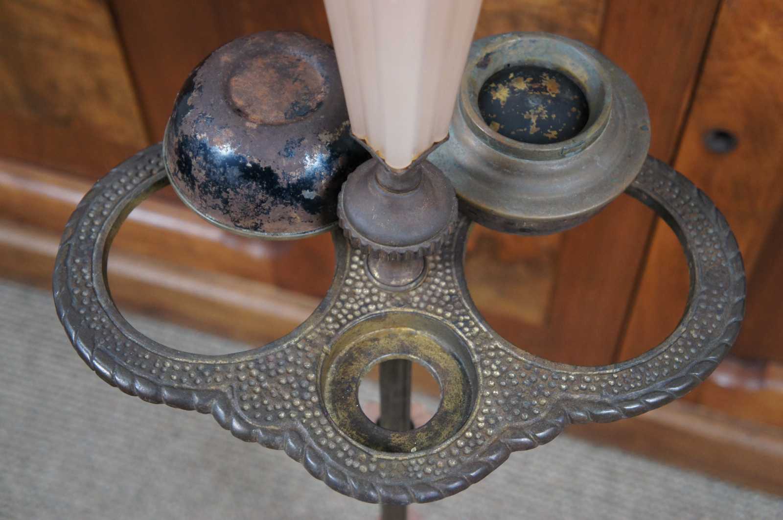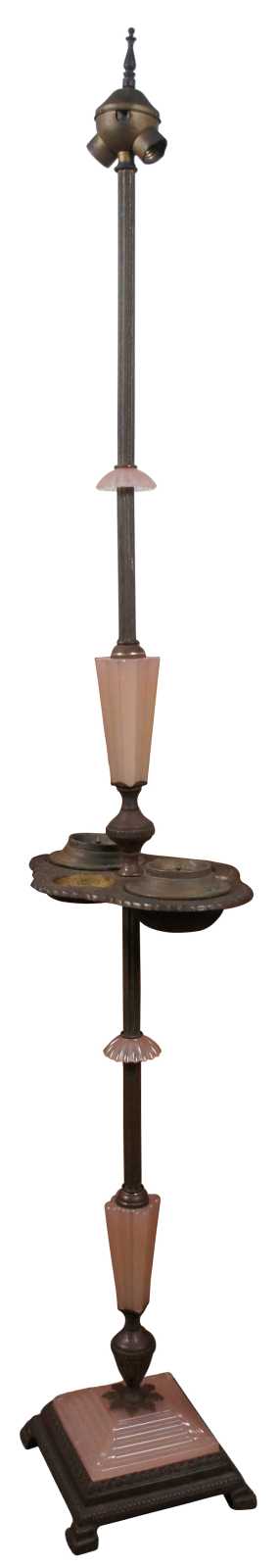Antique Houze Glass Company pink glass and brass art deco style smoke stand / two light floor lamp; includes two ashtrays and missing the original match holder and lighter.