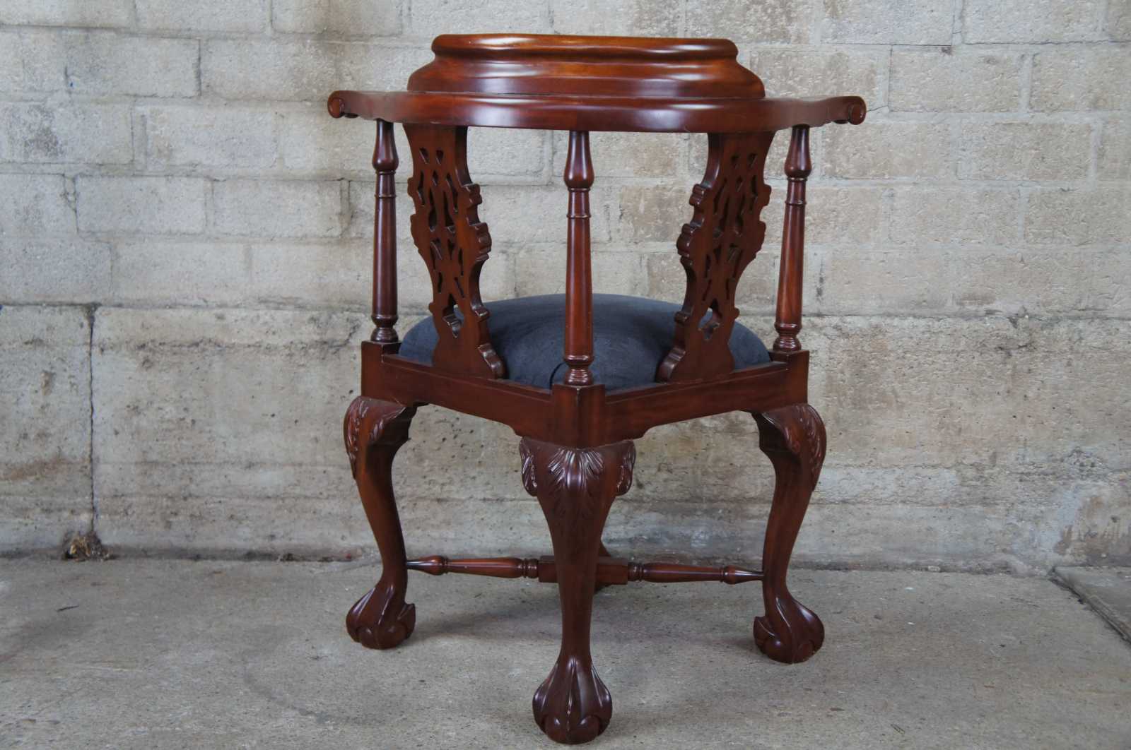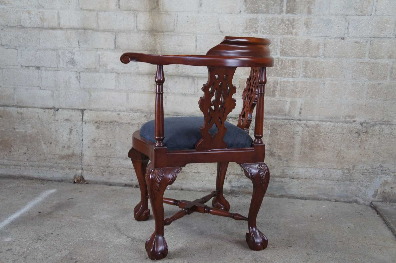 Vintage Chippendale style corner arm chair. Made of mahogany featuring black upholstered baroque pattern seat, rounded back with ornate pierced splates and ball and claw feet connected with a turned x stretcher.