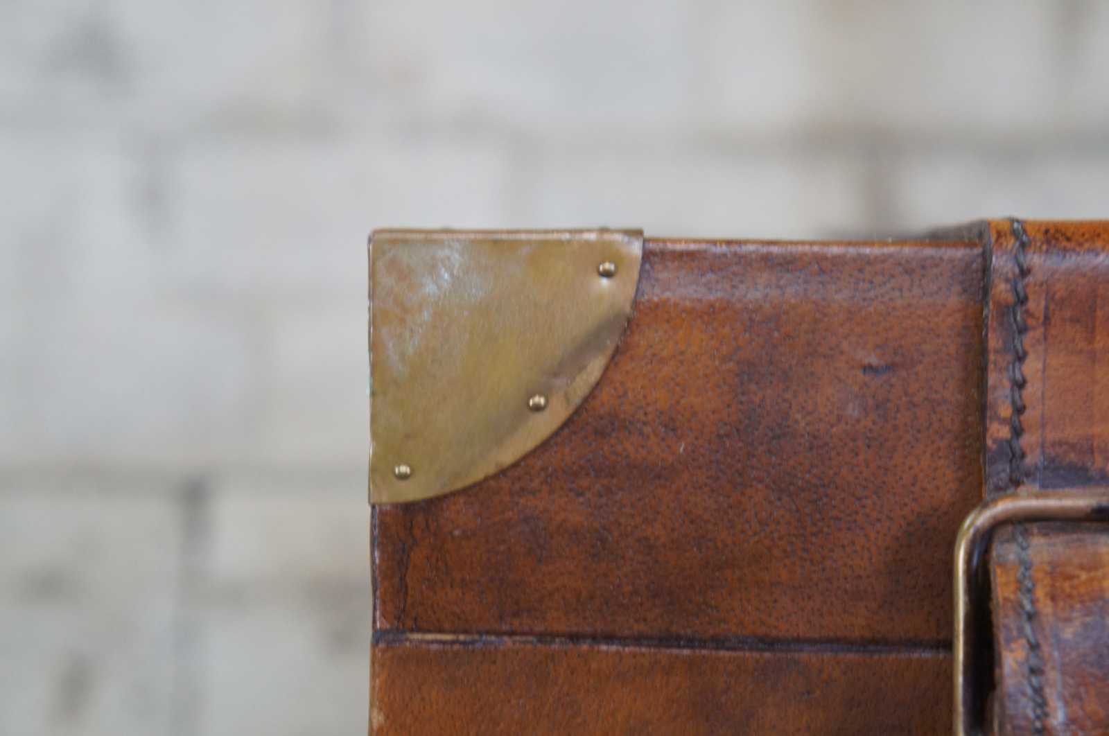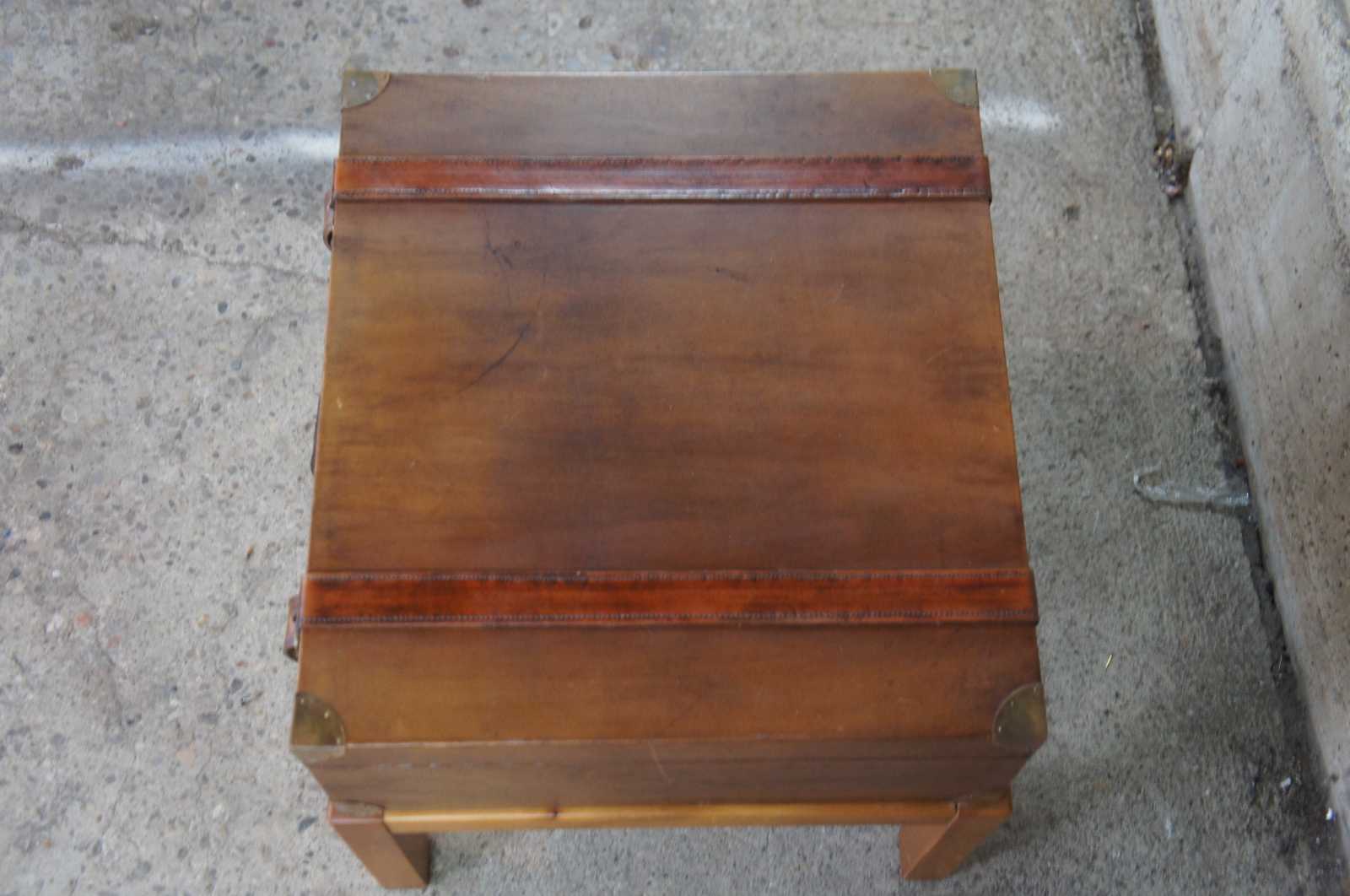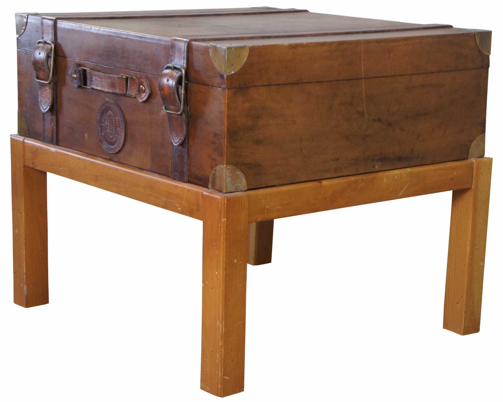 Vintage 1994 leather steam trunk on Pine stand. Features straps and brass covered corners. Trunk does not open