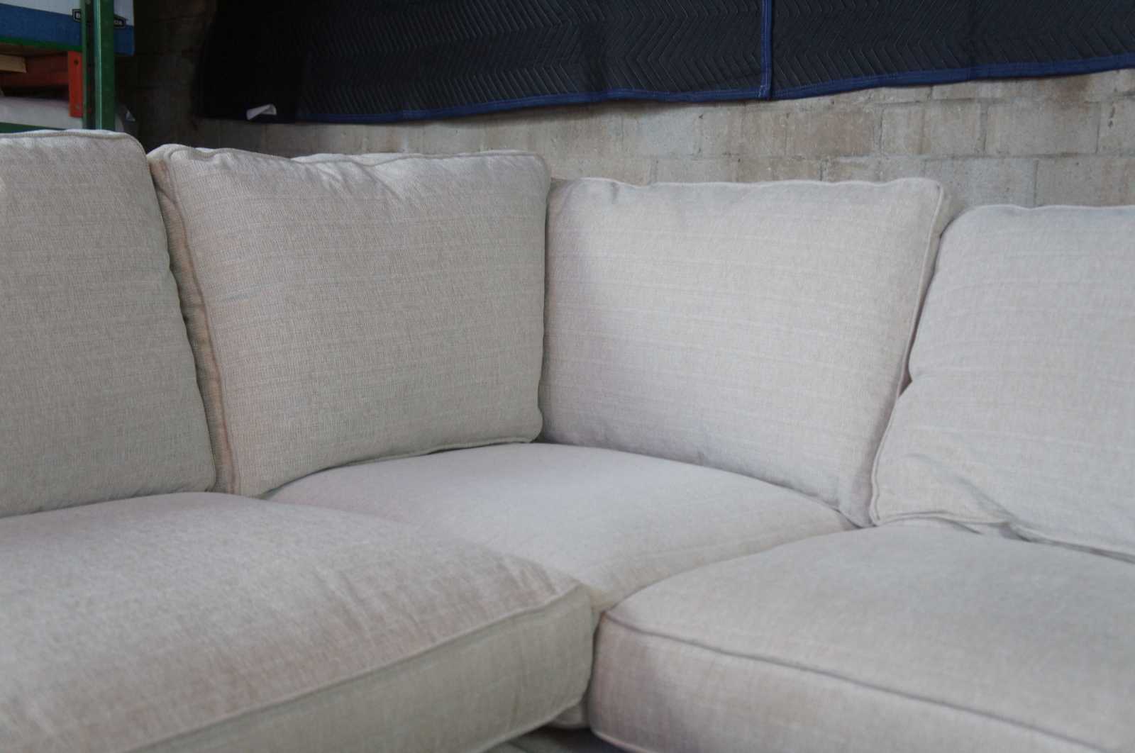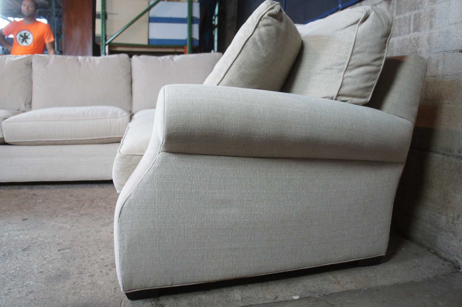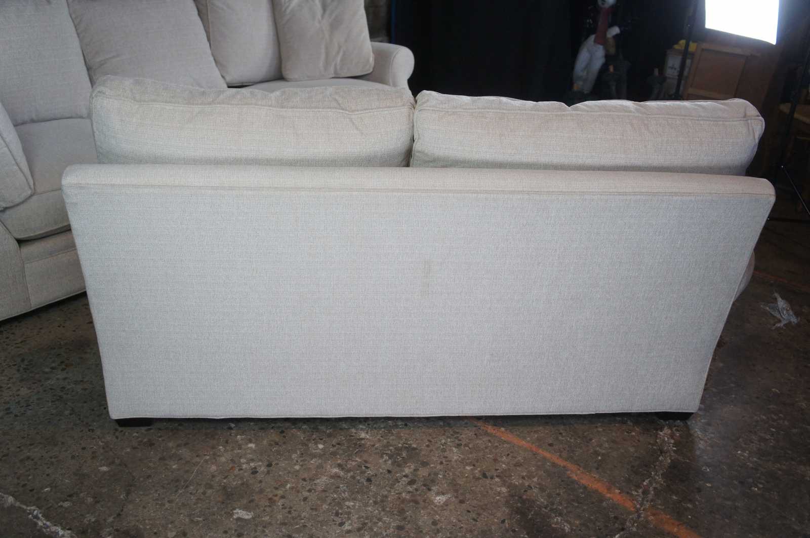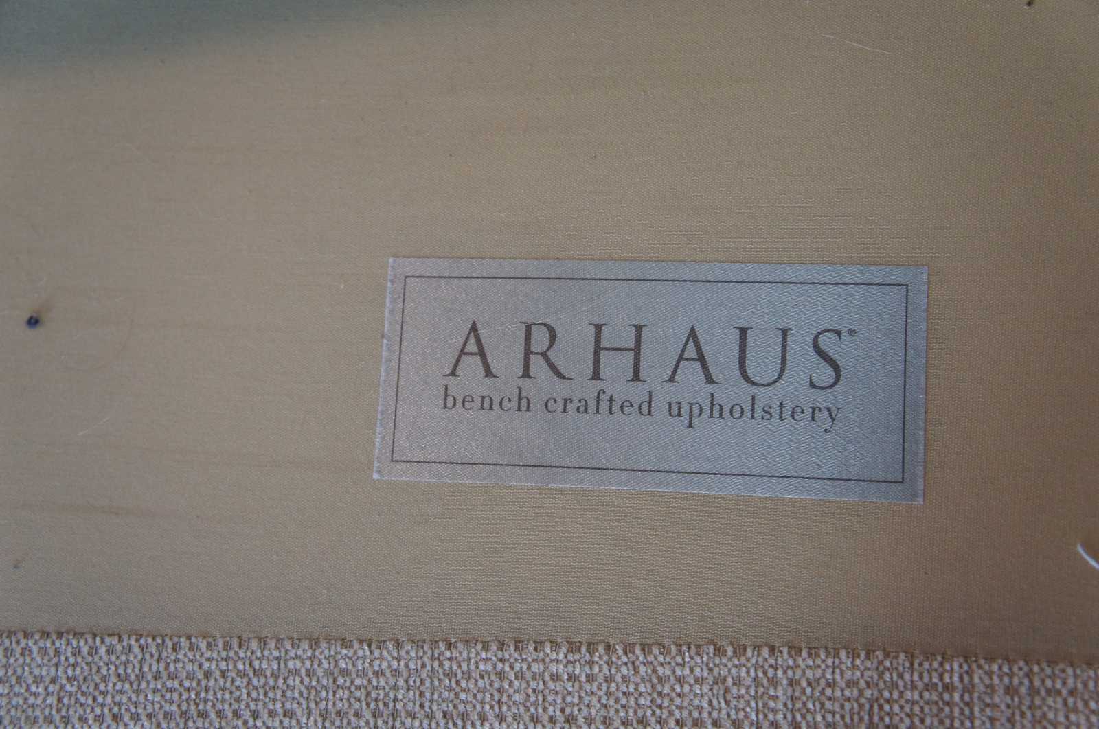 Arhaus, Landsbury Camden, two piece sofa. Strong, durable and earth-friendly, the frame is constructed entirely from wood that has been certified by the Sustainable Forest Initiative, an organization that maintains the standard in the preservation and protection of natural forests. Cushions are sustained by a steel suspension system secured with heavy-duty, 11-gauge, helical coil springs that are made of 95 percent recycled steel and aluminum. To create a sleek appearance while maintaining a comfortable feel, the seat cushions feature a 2.0-density foam core topped with an eco-friendly foam wrap consisting of more than 20 percent plant-based material and are encased in layers of soft Dacron plus an abundance of fibers, feathers and down to deliver a soft and cozy feel.