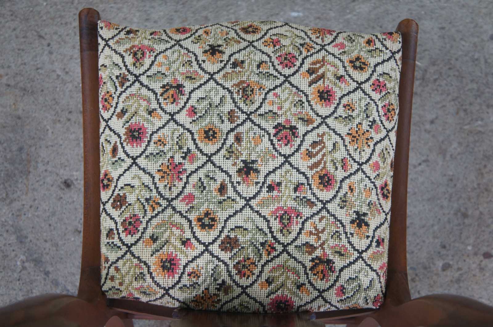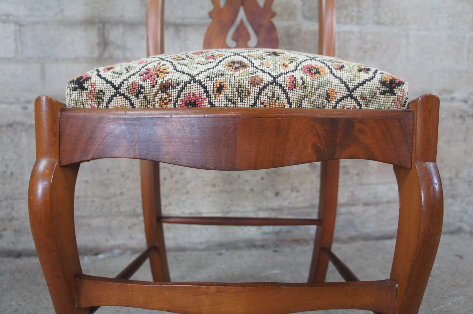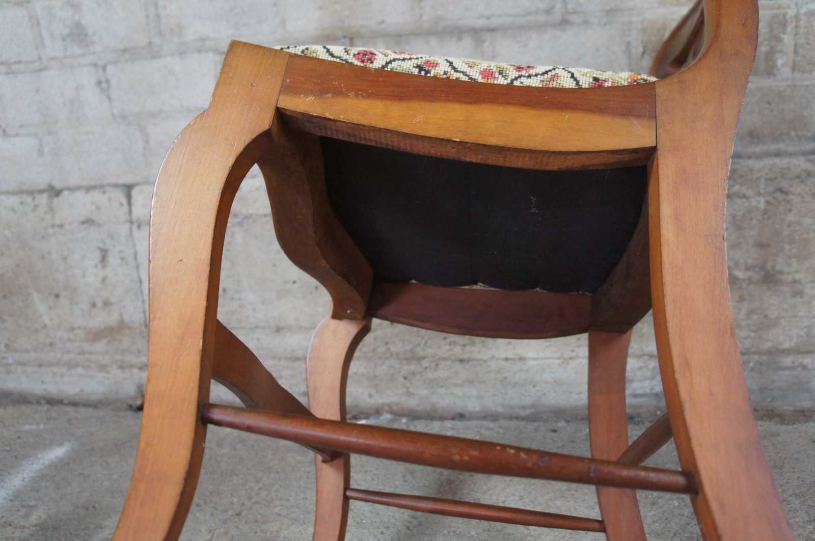 Antique 19th century American Empire side vanity chair. Made from cherry with flame mahogany veneer,serpentine form, ornate carved splat and needlepoint seat.