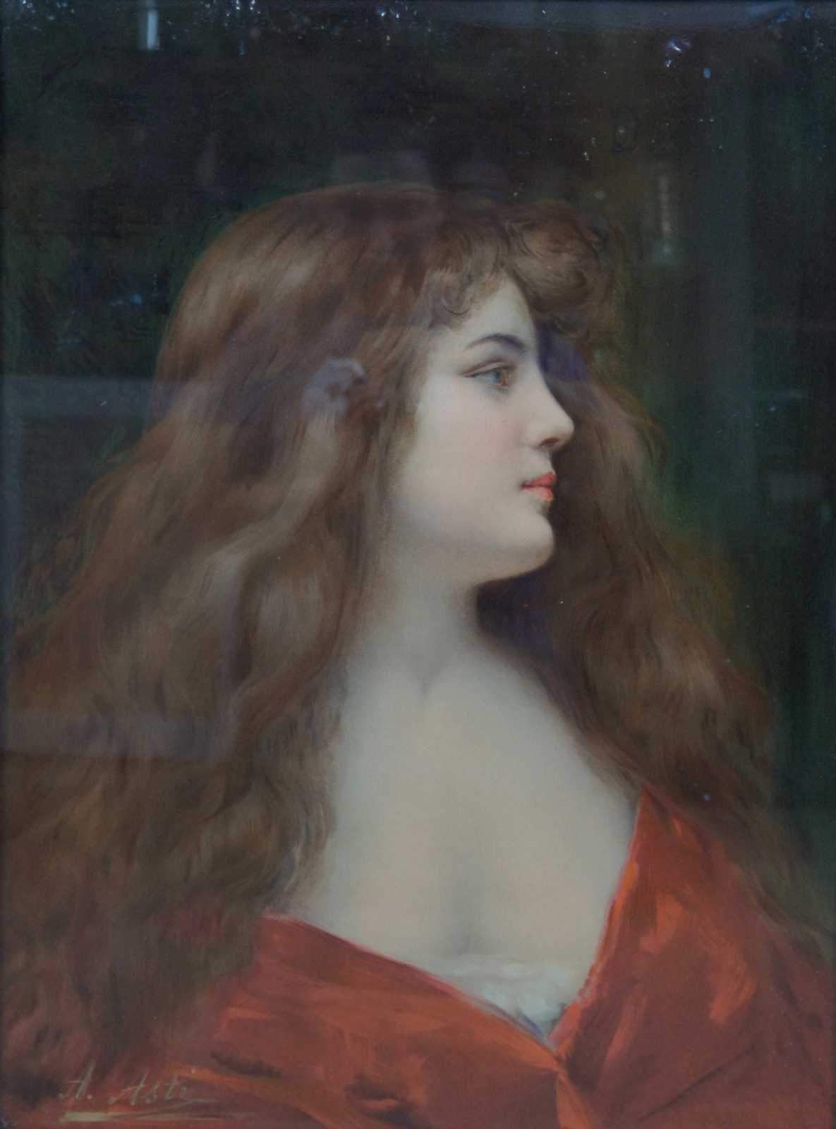 From the outset his every impulse was dominated less by striking originality or virile force than by exquisite, harmonious beauty. He chose for his particular forte the painting of beautiful womankind, in which his ideal was to create the most perfect ensemble of face, form, grace of pose, and picturesqueness of drapery. His first finished work was admitted to the Salon that year, though the painter himself had no thought, in the first place, of submitting his canvas to the judges. He had sent it to the framer's to have a frame made. The framer was so entranced by the captivating beauty of the painting that he first urged and then begged Sig. Asti to send it to the Salon. It was not only awarded a high distinction, but created a sensation, a most unusual thing for the first exhibited work of an unknown artist.