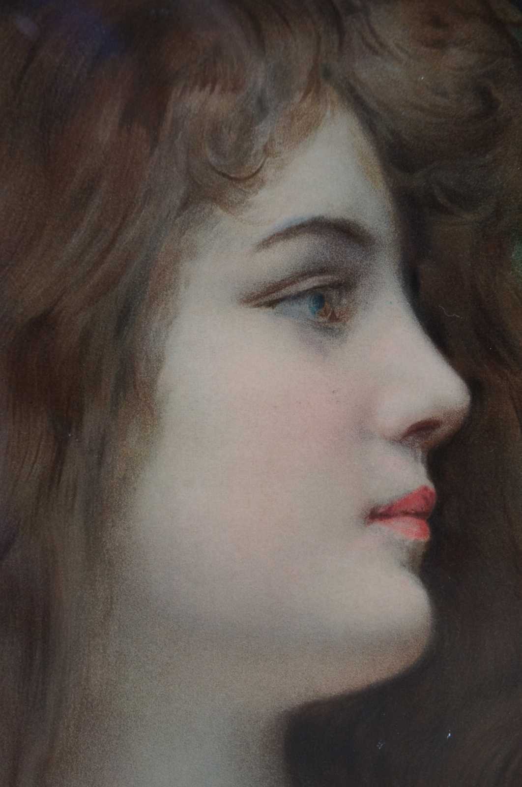 Antique chromolithograph advertising print after Angelo Asti portrait of a maiden in red, Includes a Victorian era mahogany frame