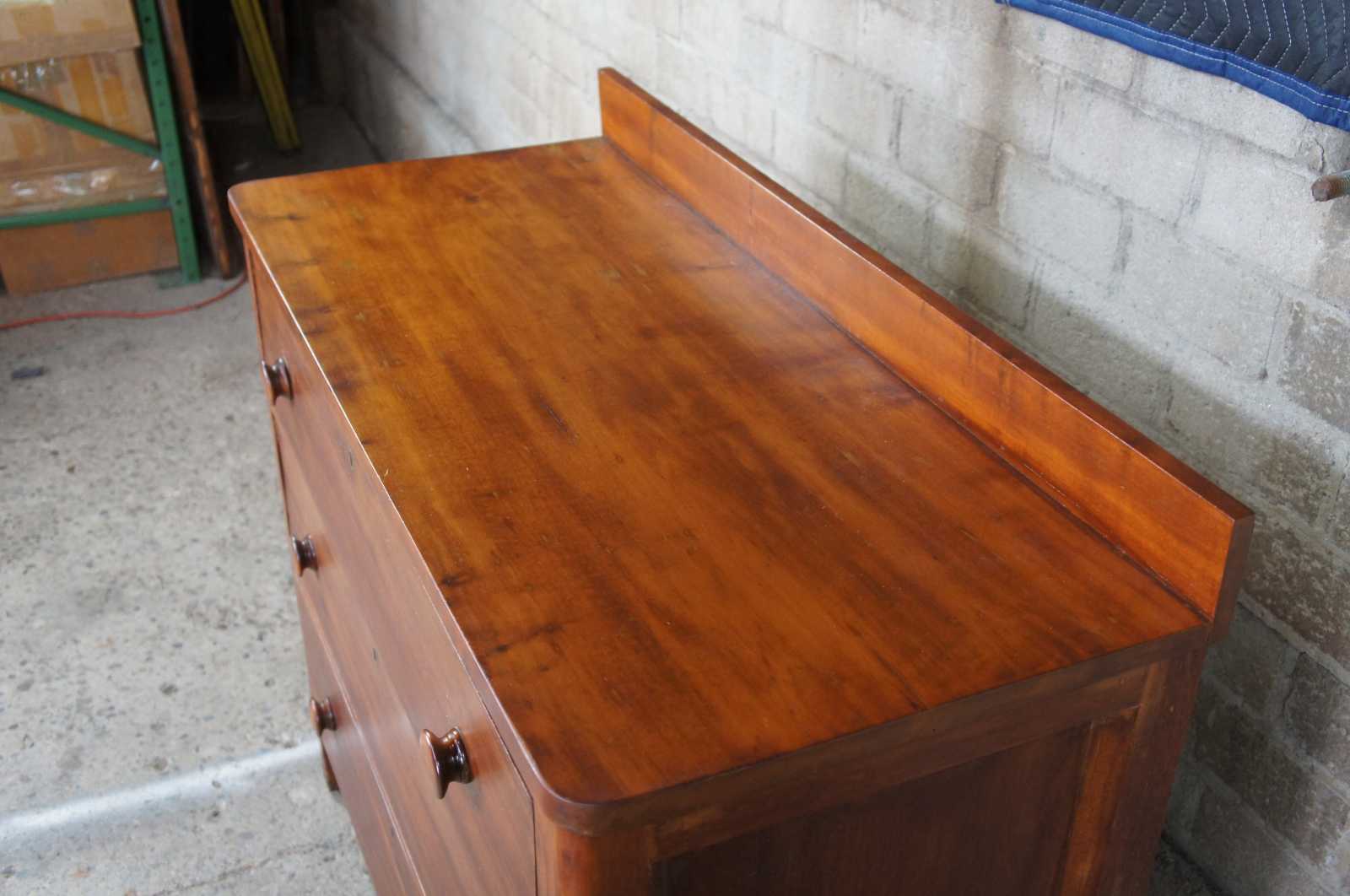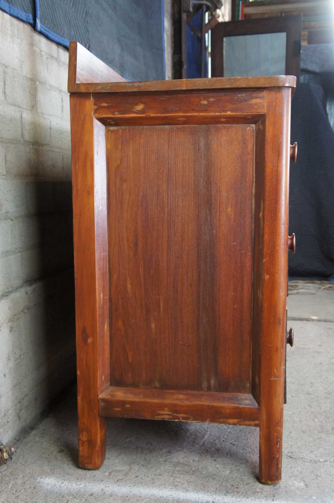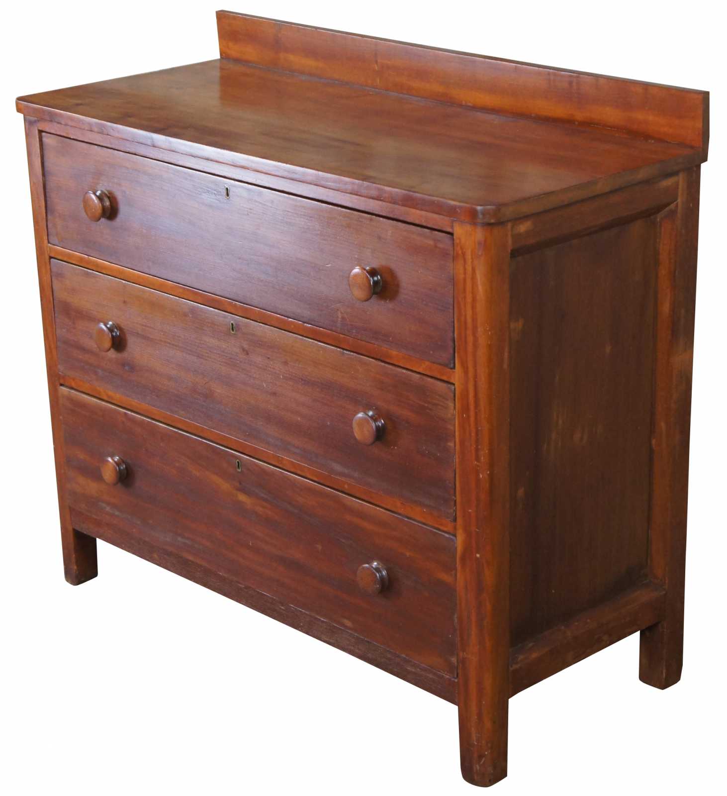 Civil War era chest of drawers. Made of cherry featuring three hand dovetailed drawers with turned knobs, paneled sides, and backsplash.