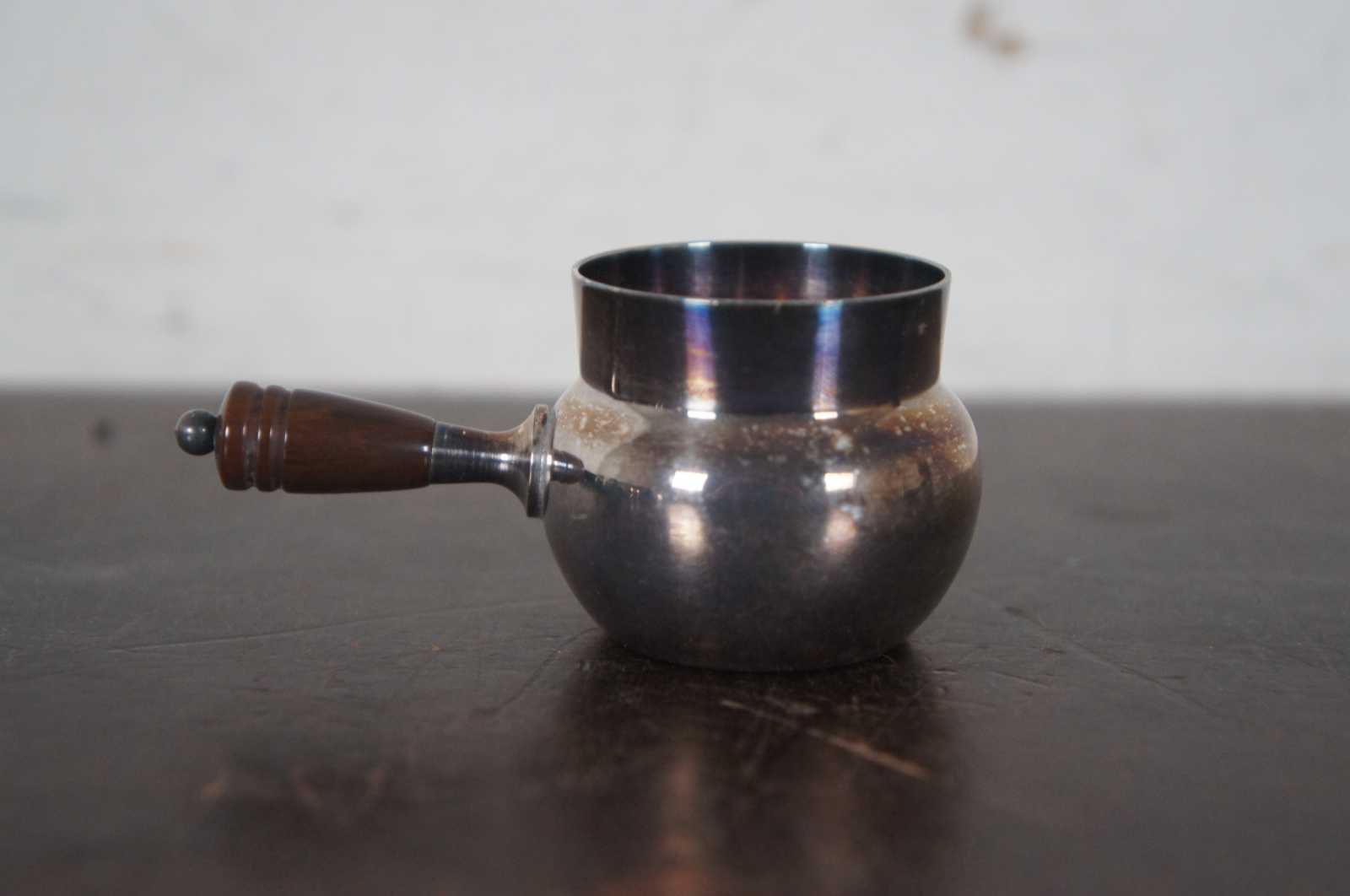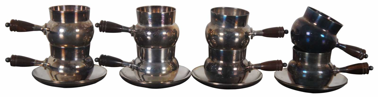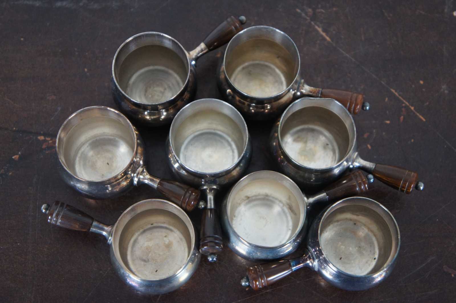 Vintage set of eight salt cellars and underplates in the shape of small pots with brown Bakelite handles. Fleur de Lis mark along the bottom. Attributed to Webster