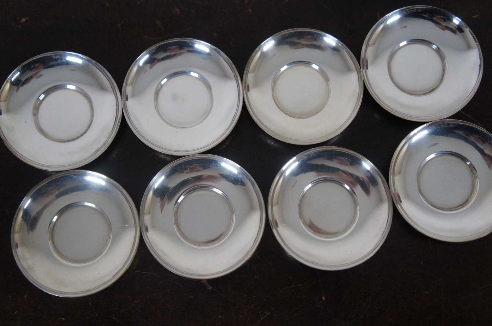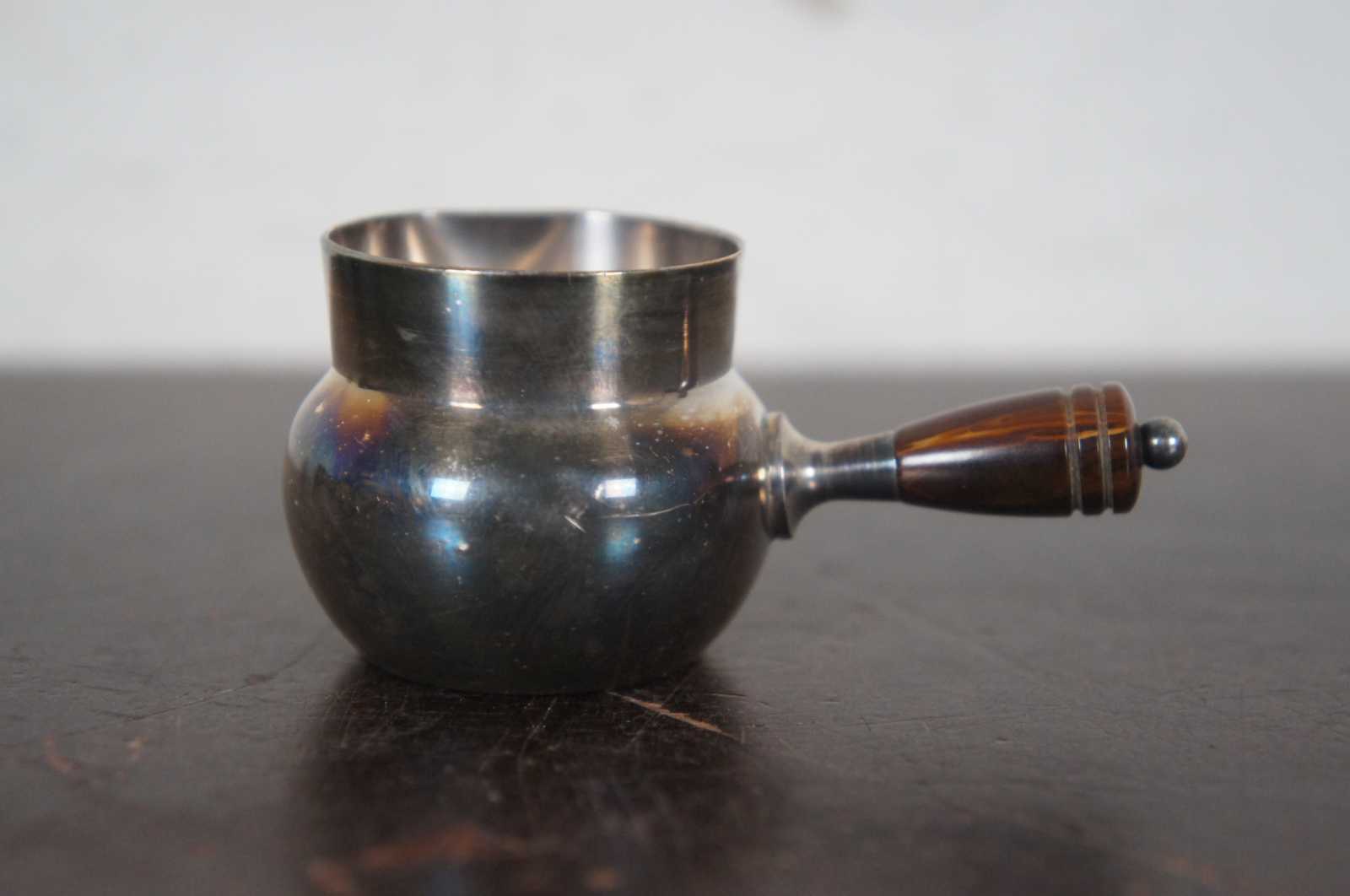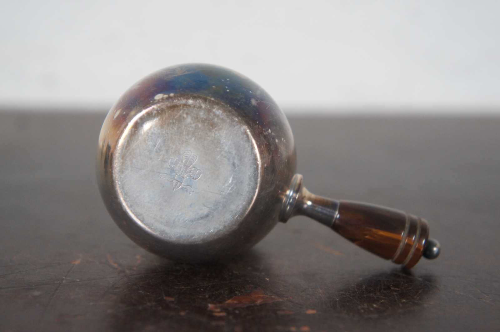 Vintage set of eight salt cellars and underplates in the shape of small pots with brown Bakelite handles. Fleur de Lis mark along the bottom. Attributed to Webster