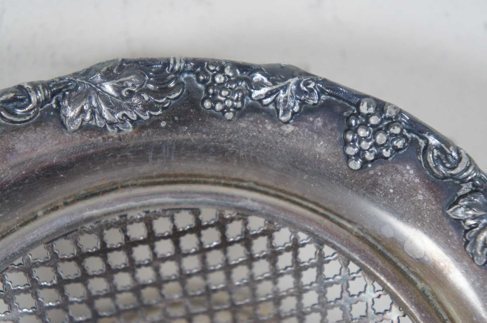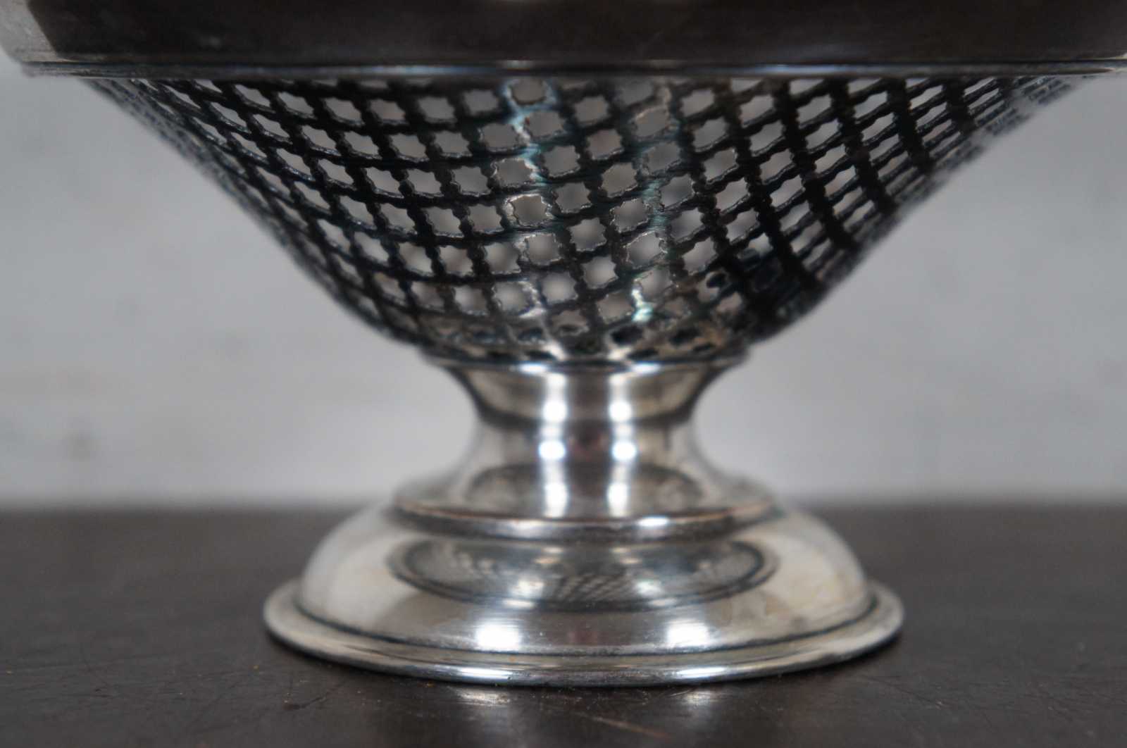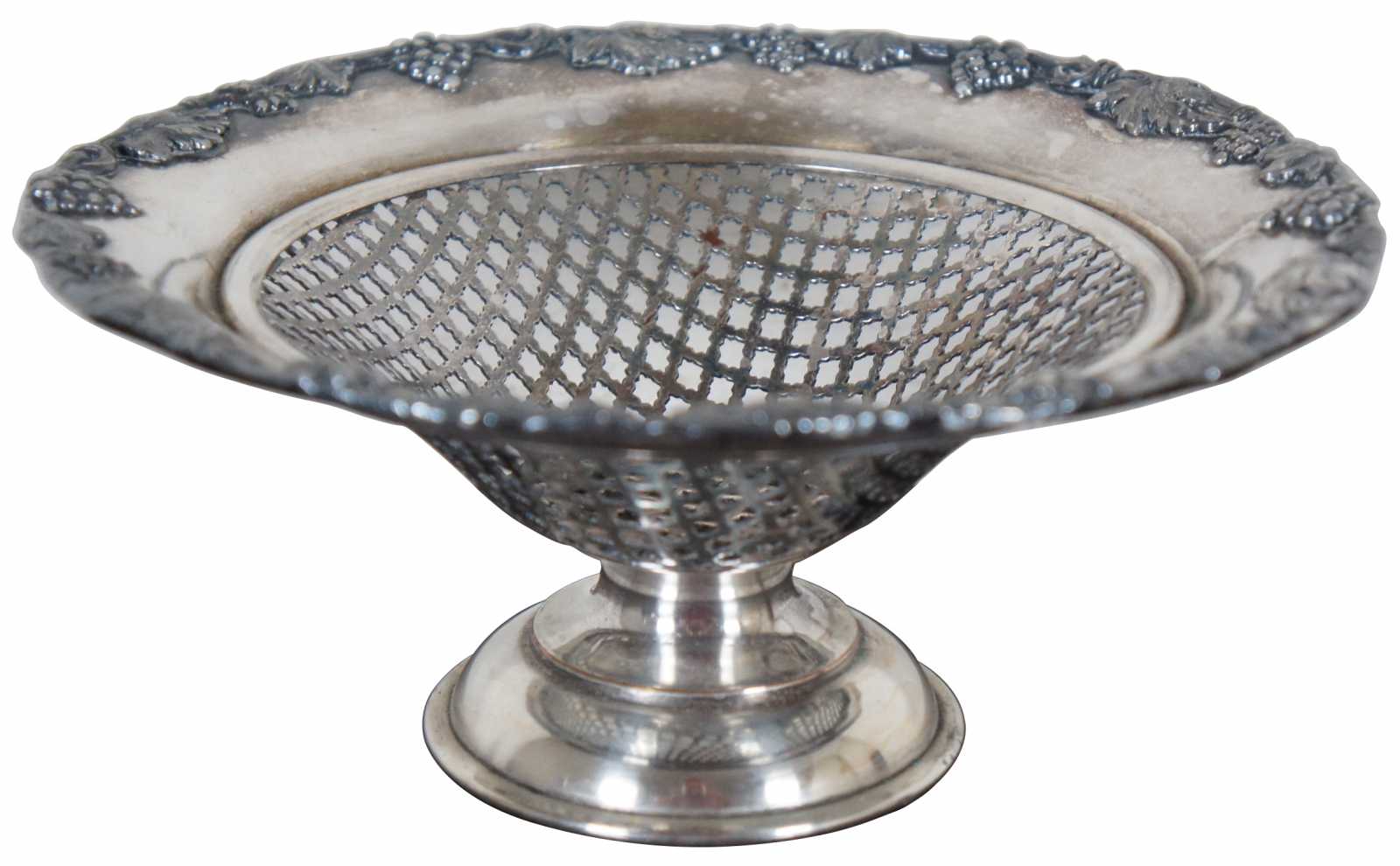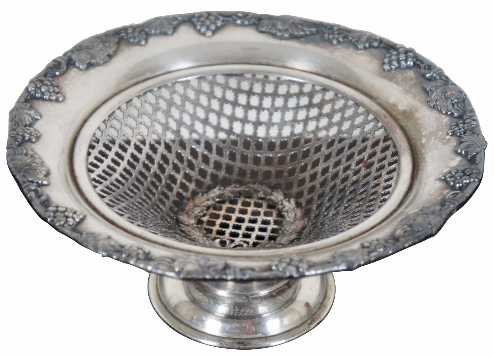 Vintage Sheffield silver plate footed compote with reticulated sides, grape vine basket weave border and wreath center, fashioned by the Lawrence B. Smith Company.