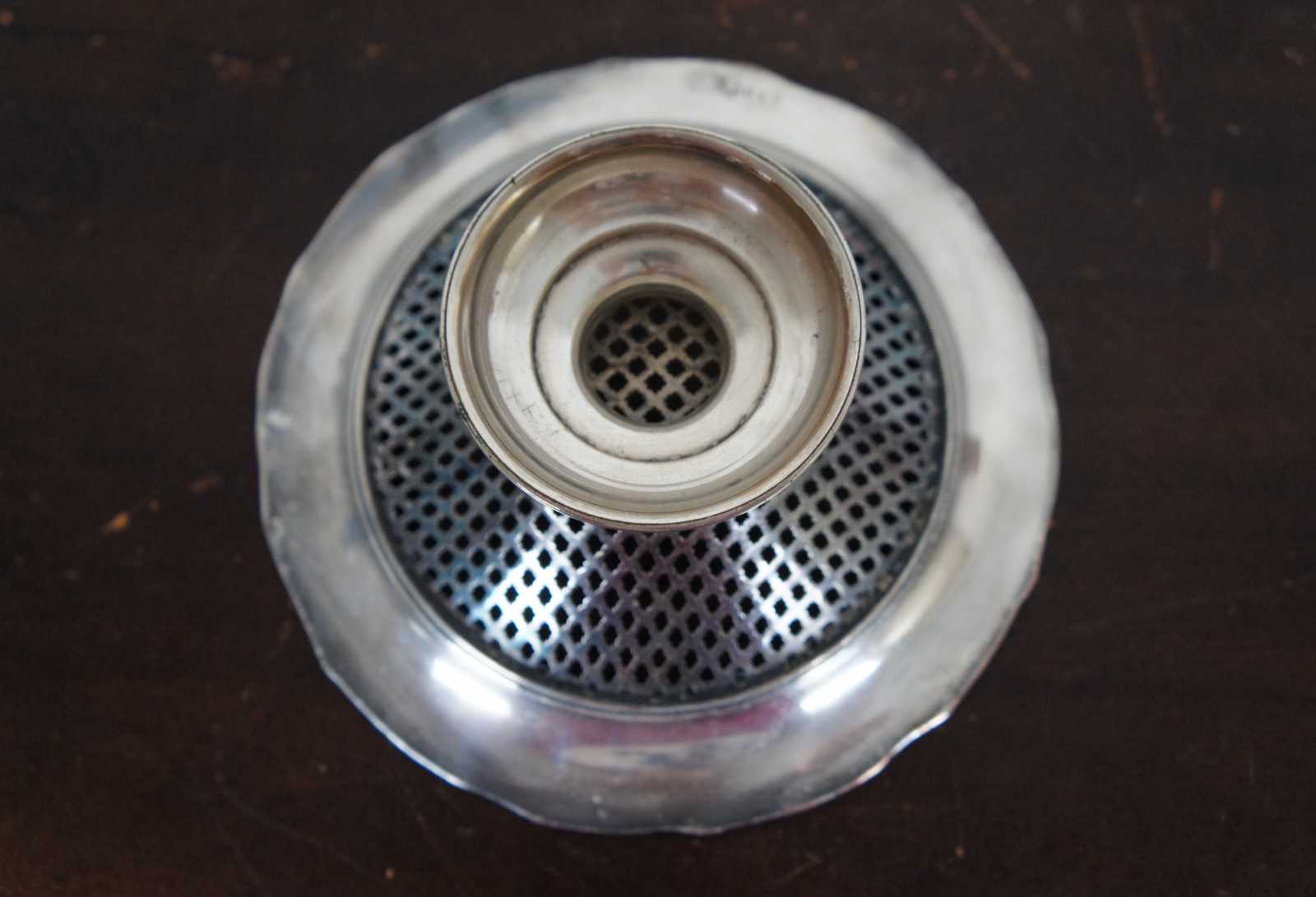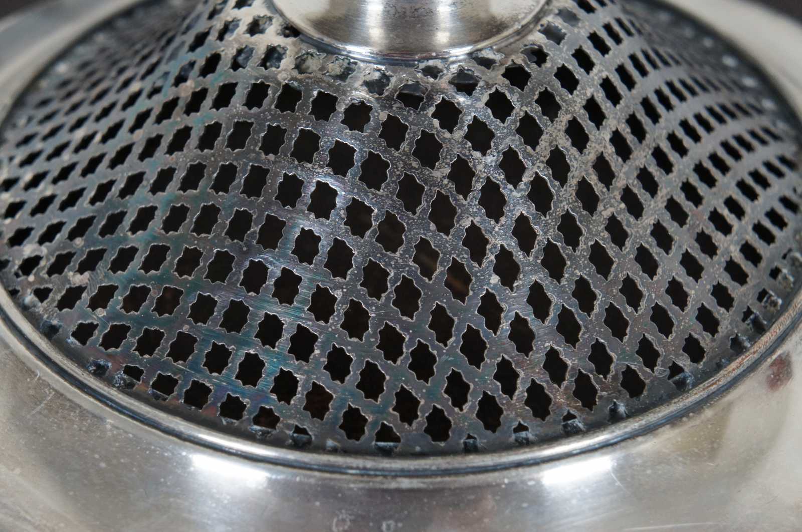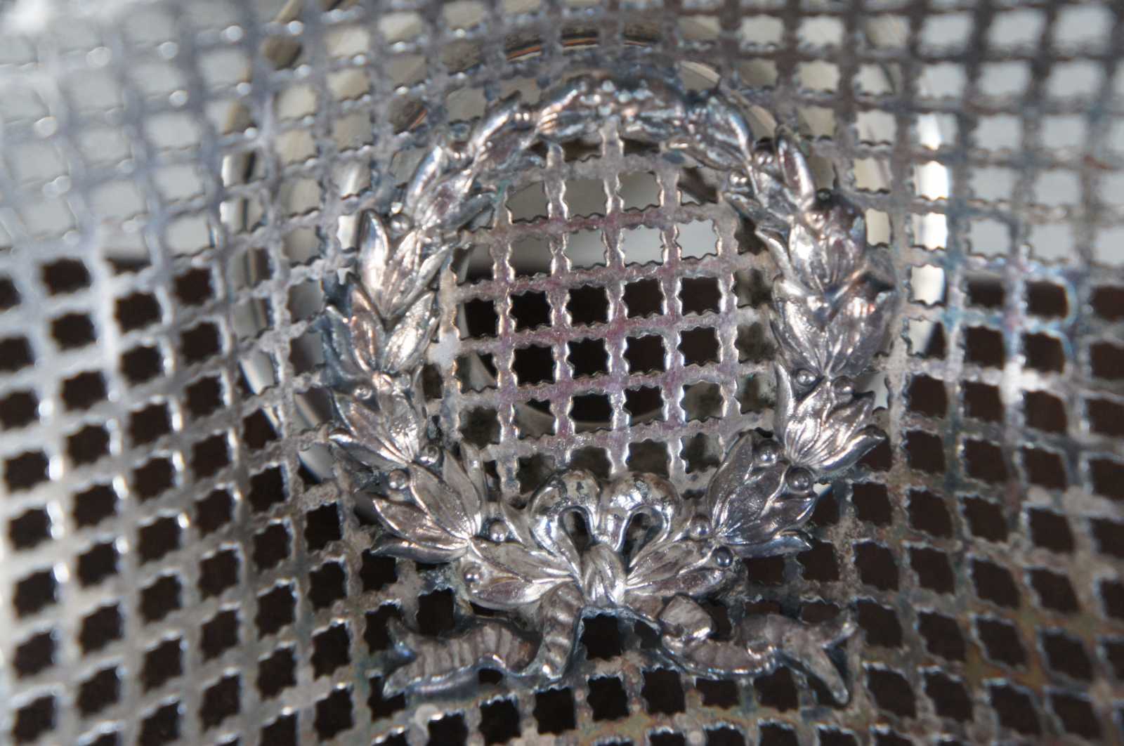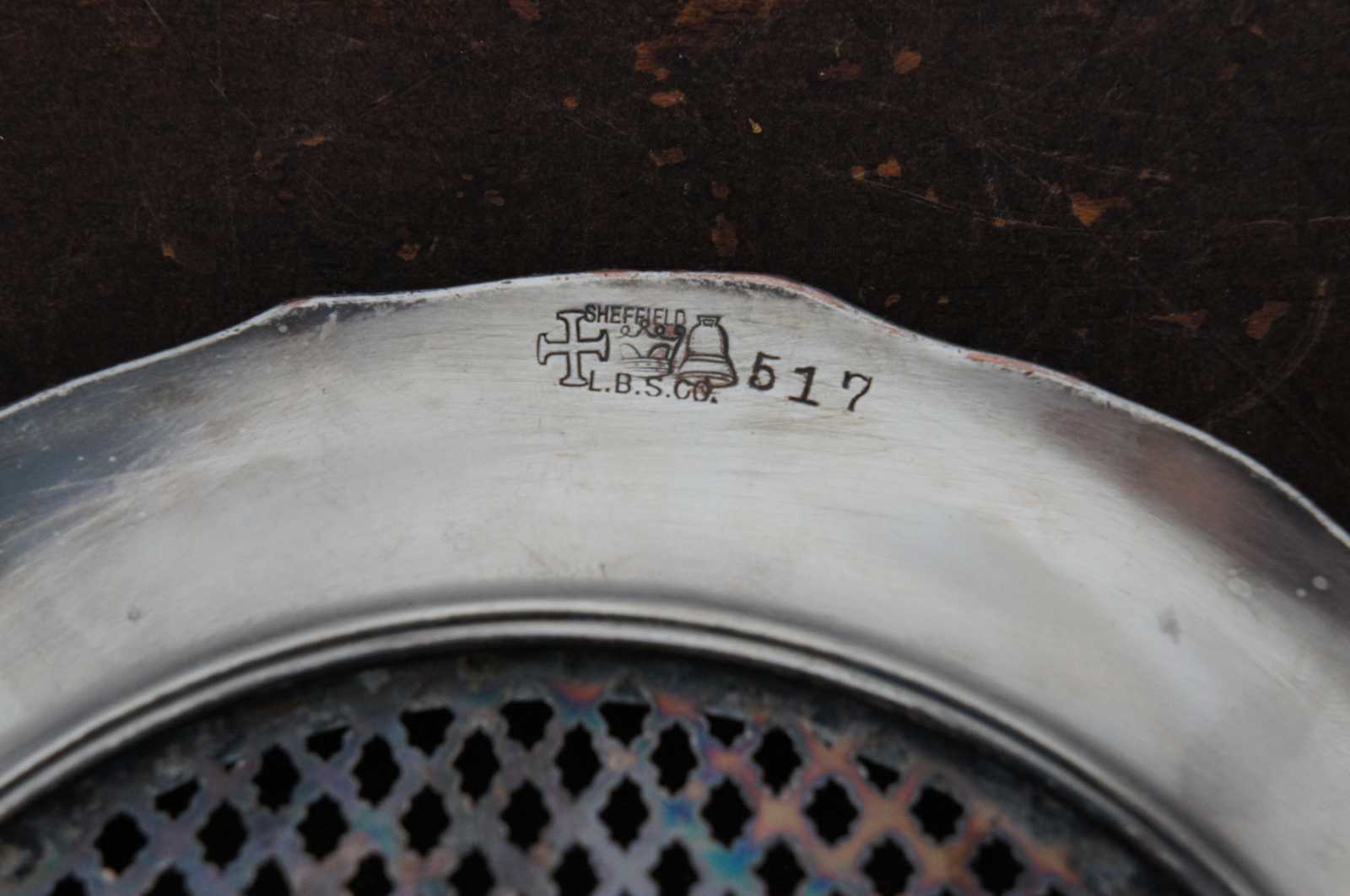 Vintage Sheffield silver plate footed compote with reticulated sides, grape vine basket weave border and wreath center, fashioned by the Lawrence B. Smith Company.