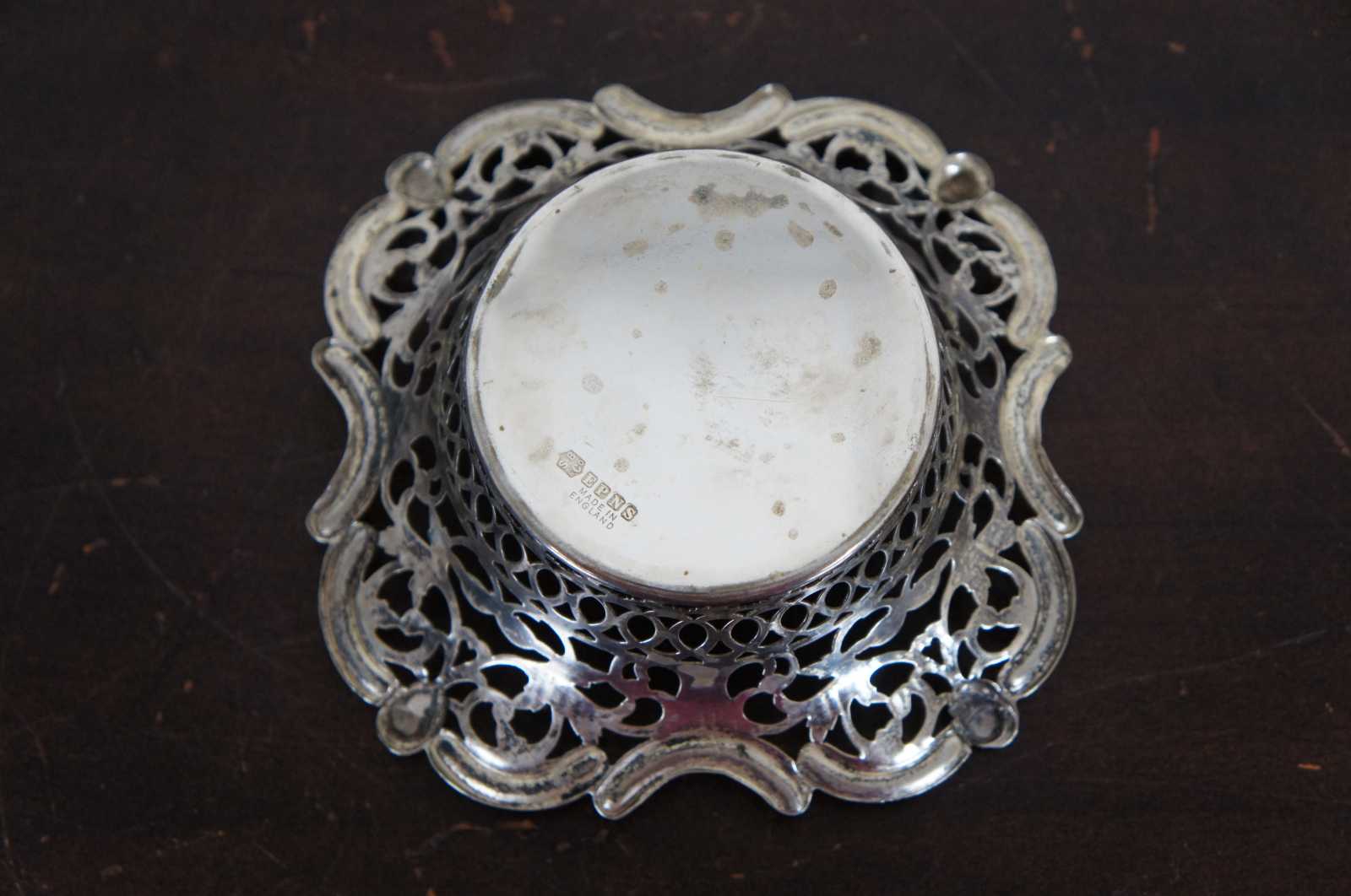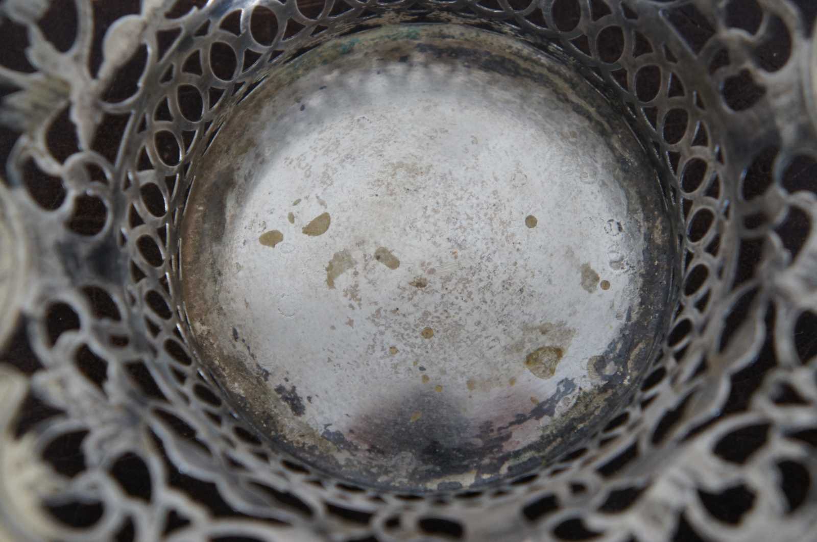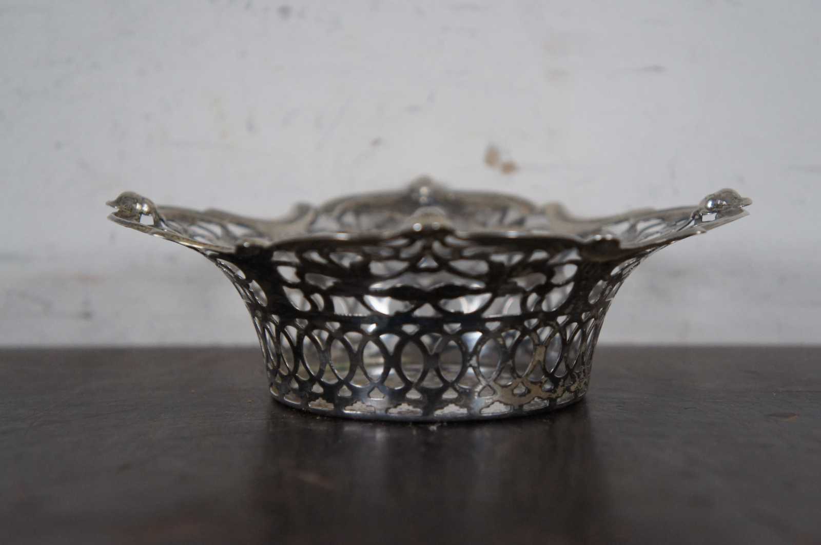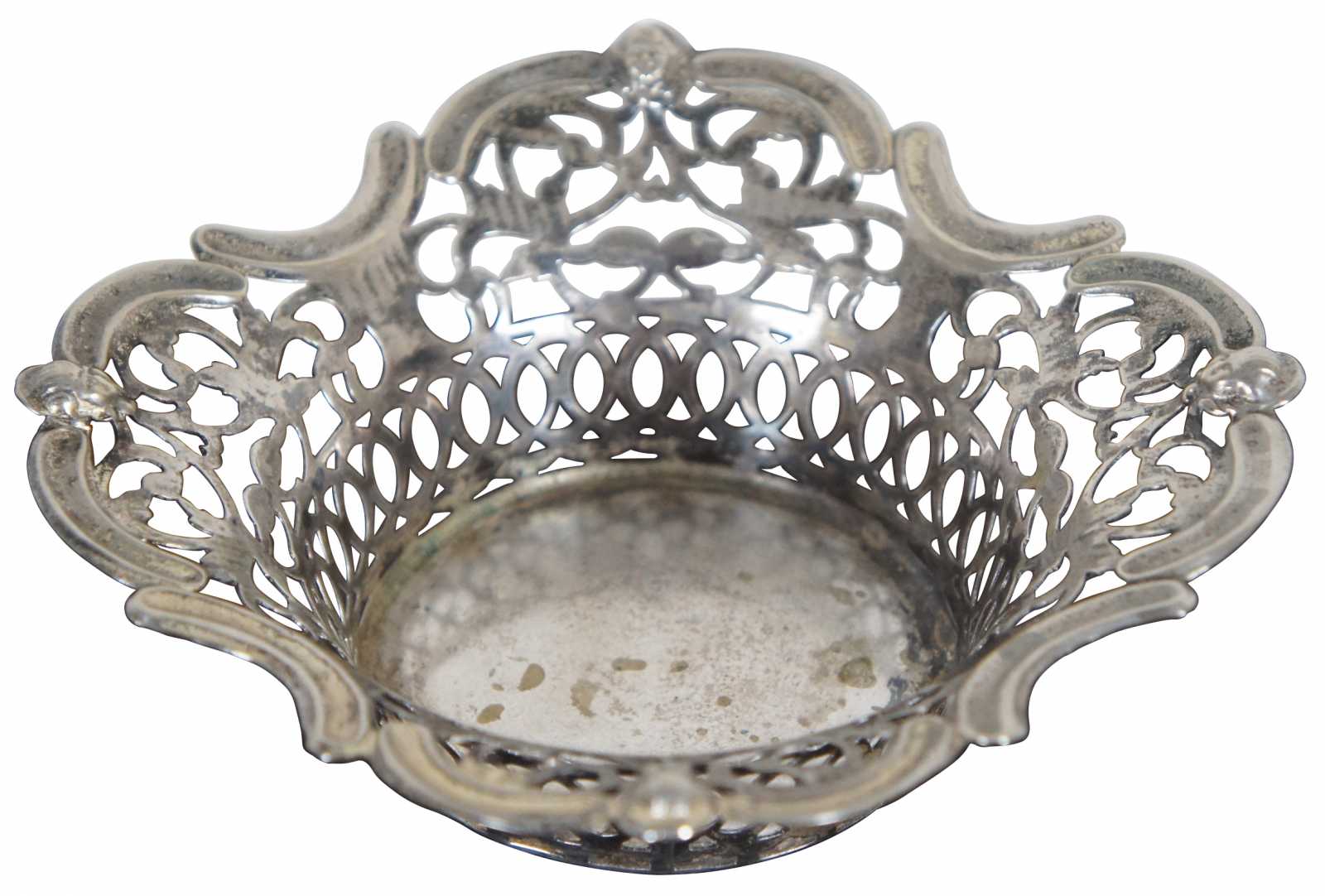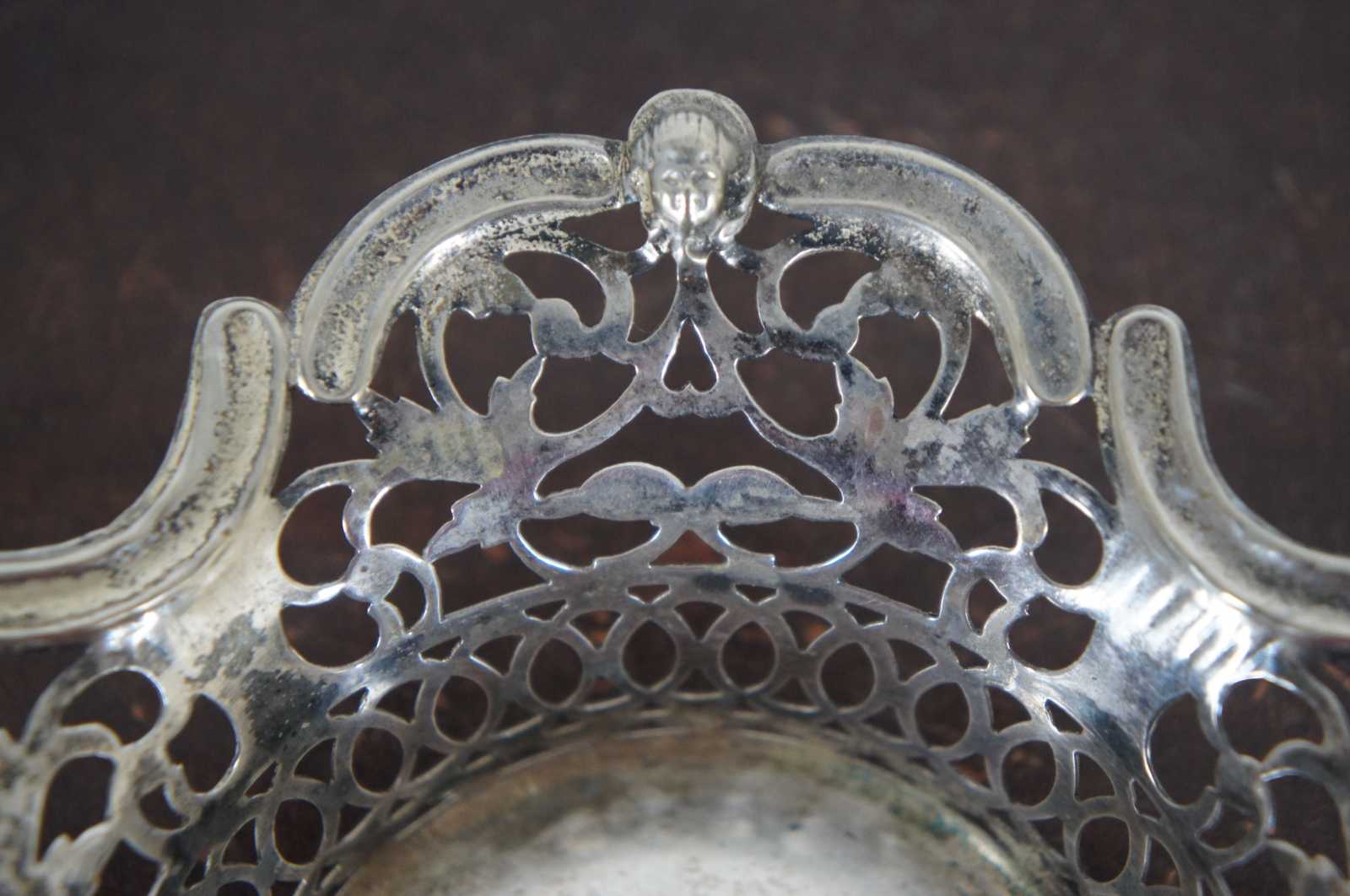 Vintage silver plated scalloped nut or candy dish with reticulated sides accented with faces, by S. Bright & Company.