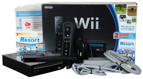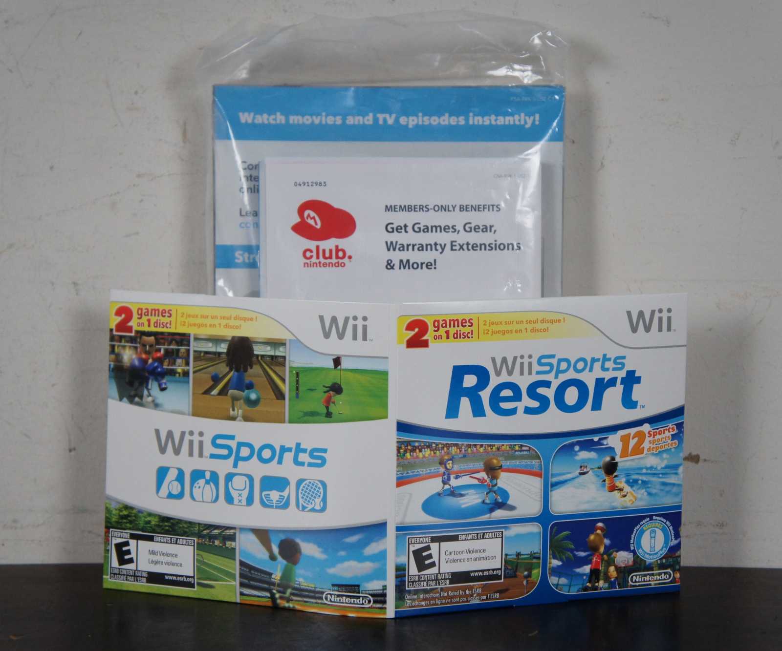 Never used 2006 Nintendo Wii game system, model RVL-101. Includes Wii Sports and Wii Sports Resort game discs, sensor bar, joystick / remote, and cords. Original box included. Serial KU407160703