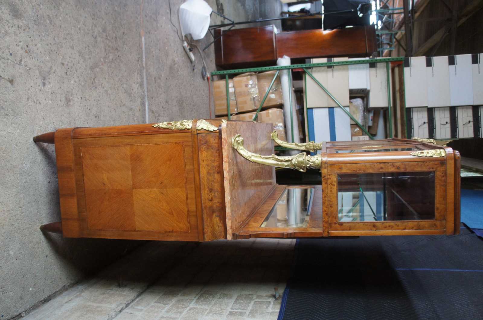 Beautiful Walnut Burr Sideboard. Features a travertine top with bronze delphin mounts that steps up into the cupboard portion of the cabinet. The top includes a glass shelf for storage and a mirroed backing for display. The cabinet is adorned with gilt bronze hardware in French and neoclassical styling. Includes burled panels, banding and matchbook veneer. Great for use as a barback, server or china cabinet.