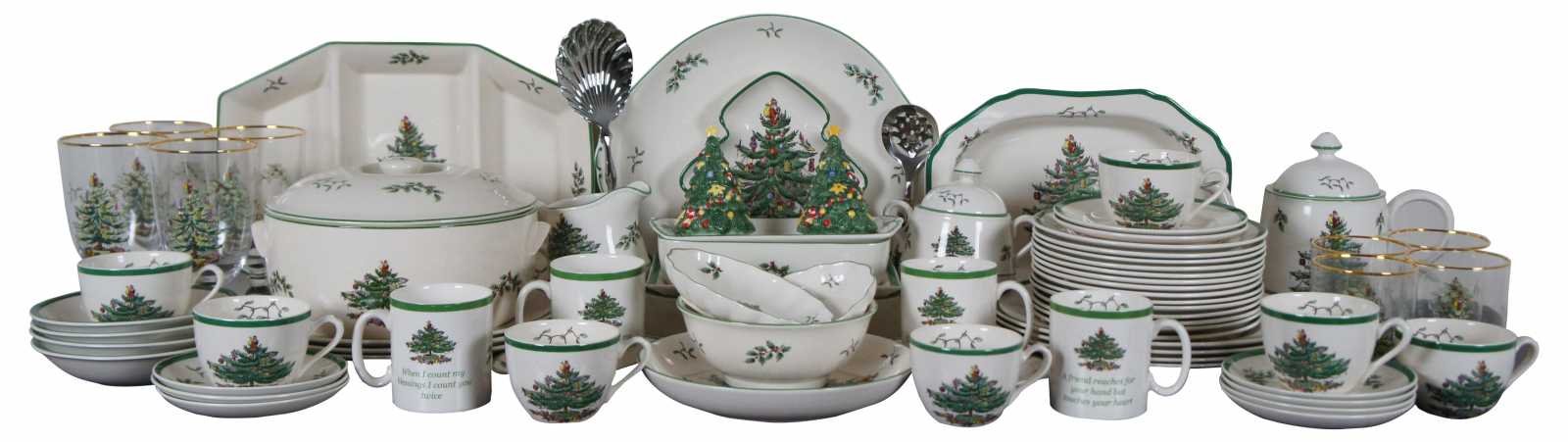 76 piece set of Spode China Christmas Tree dinnerware and serving pieces, most with original boxes.