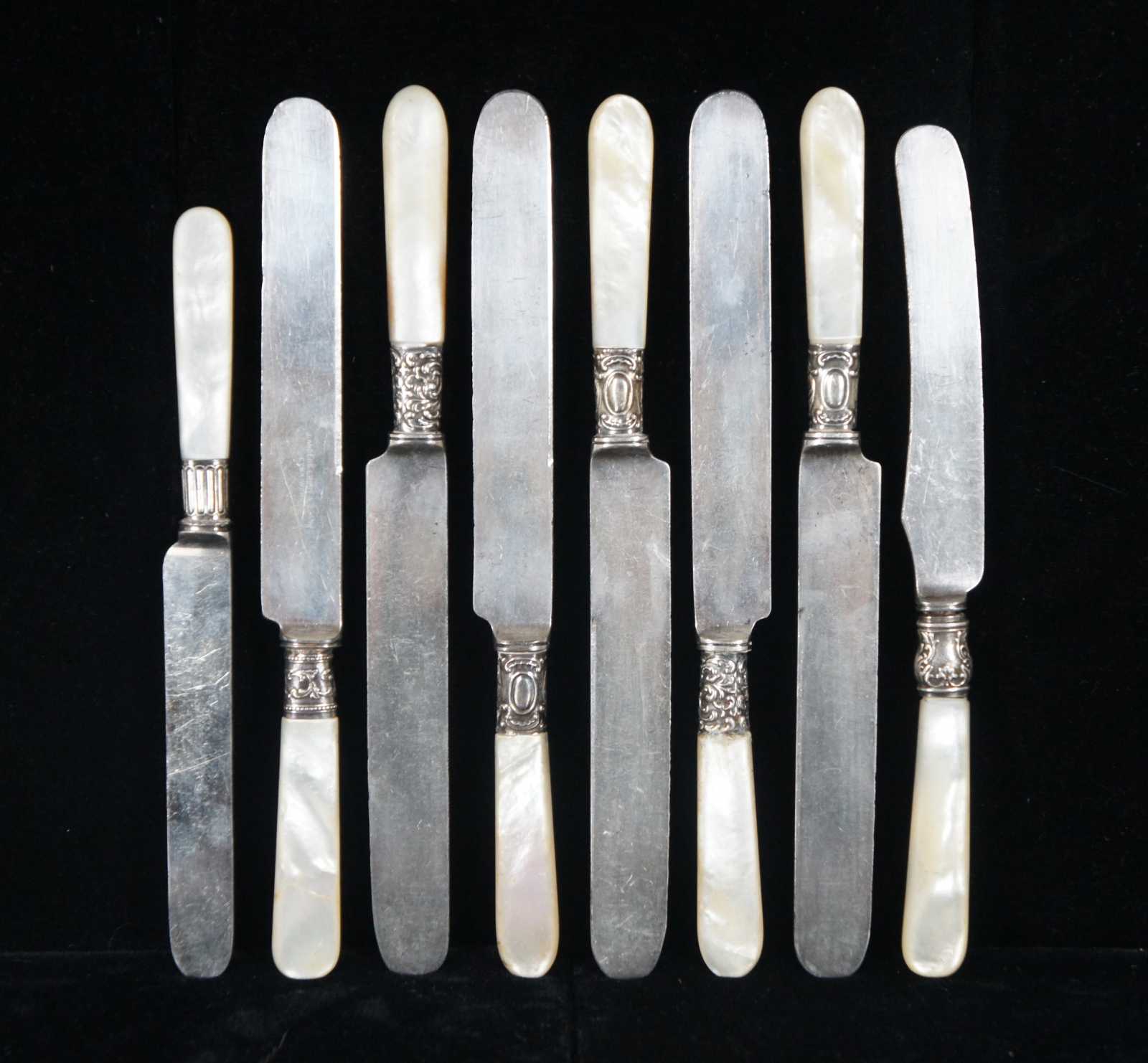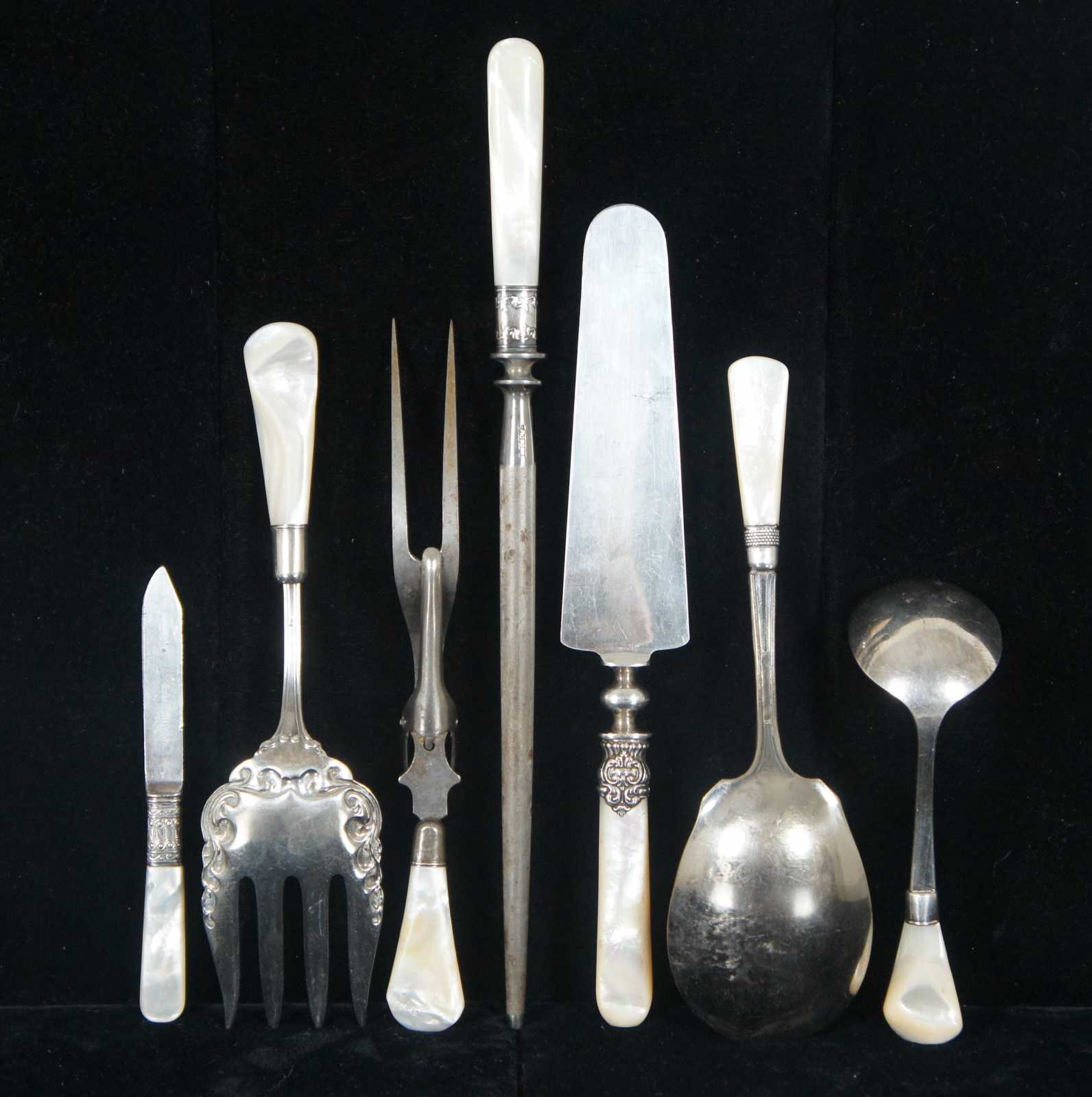 Nineteen pieces of assorted Art Nouveau mother of pearl and sterling silver flatware and serving pieces; brands include Lee's, Landers Frary & Clark Etna Works, Meriden Cutlery Co 1855, Duhme & Co Cincinnati, Towle Mfg Co, DG&Co.