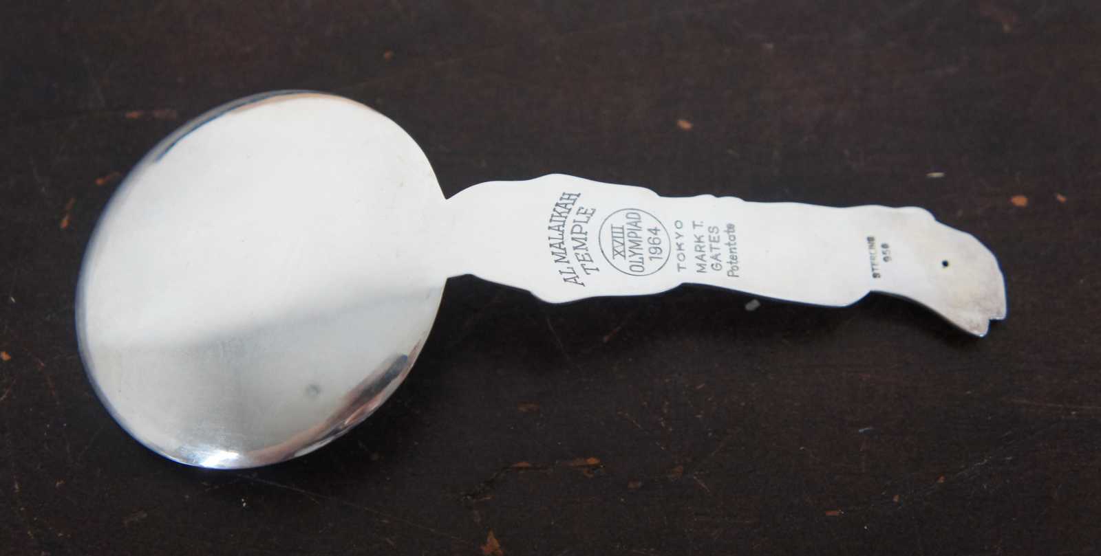 Vintage sterling silver geisha shaped spoon, engraved on the reverse commemorating the Al Malaikah Temple, XVIII Olympiad 1964, Tokyo, Mark T. Gates Potentate. Al Malaikah is a division of the Shriners. Includes box.