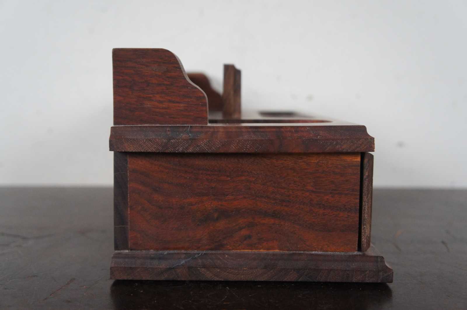 Vintage artisian or craftsman hand made walnut wood dresser top jewelry organizer with two velvet lined drawers, marked by the maker Marvin E. Nedved. Circa 1960s.